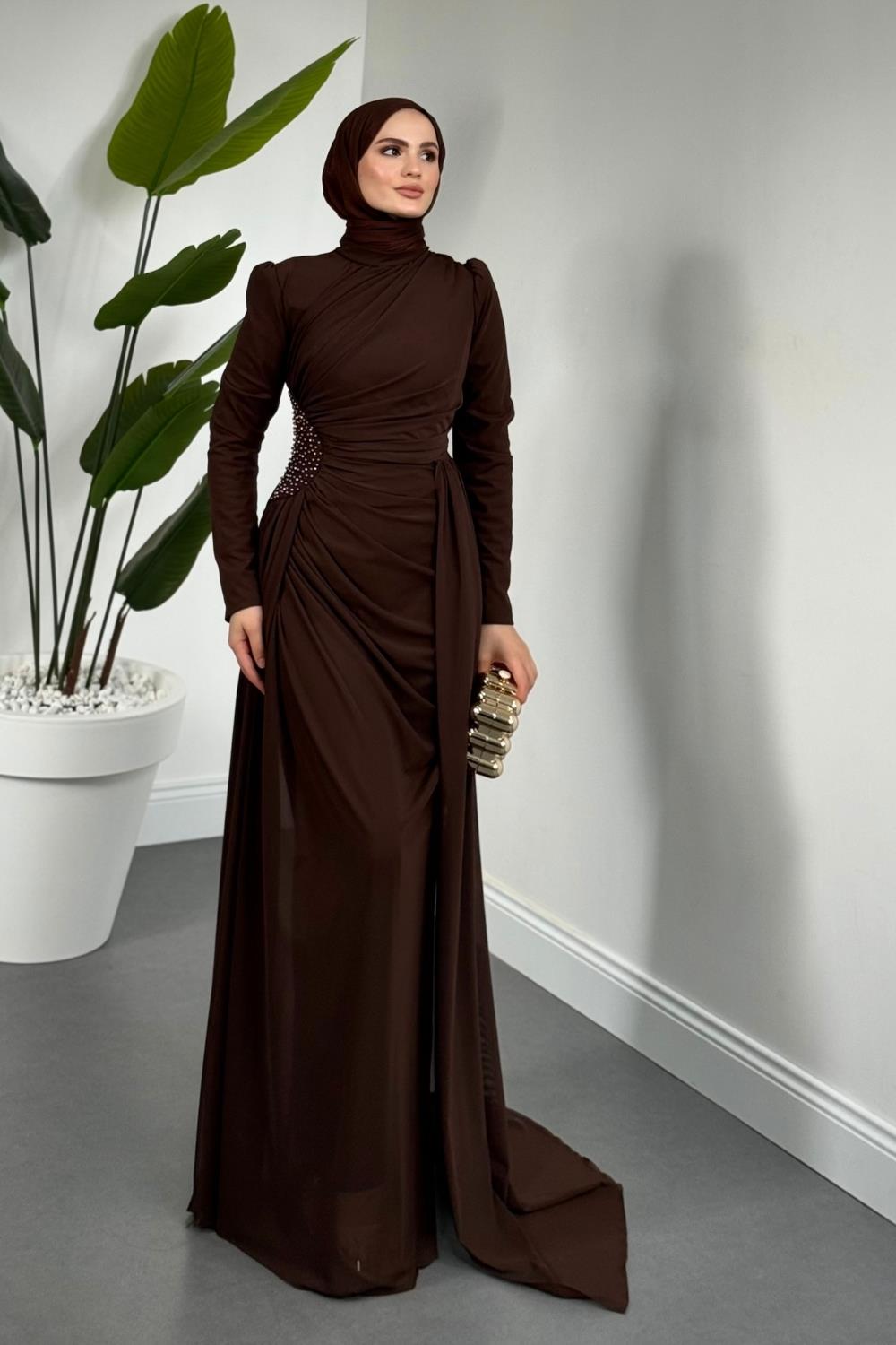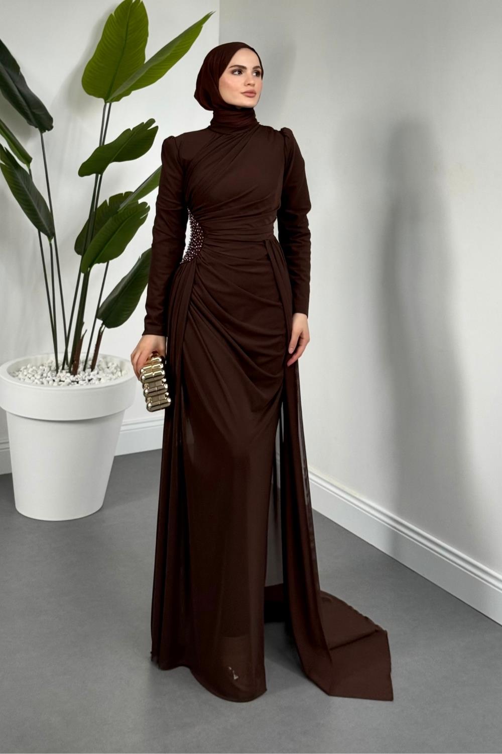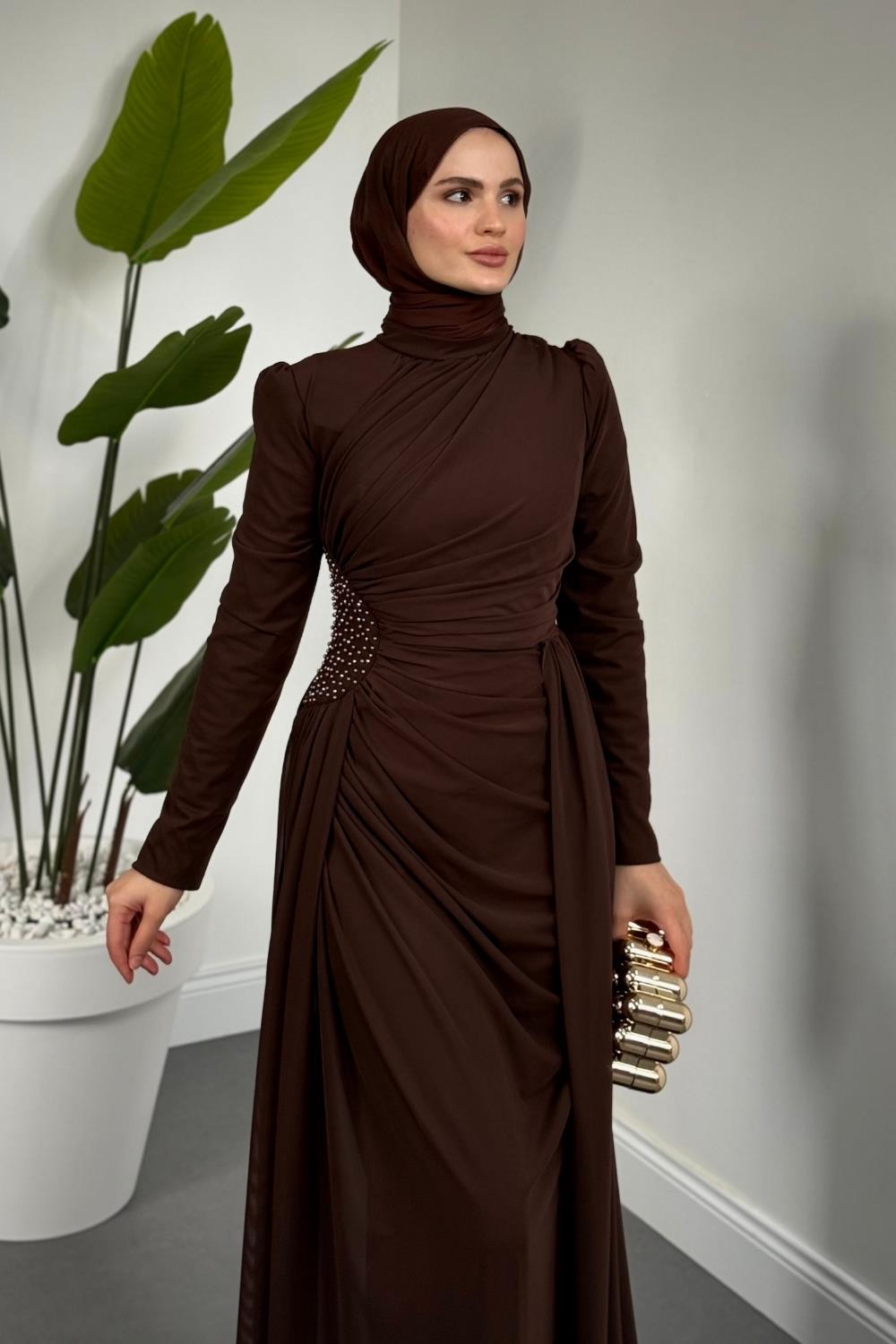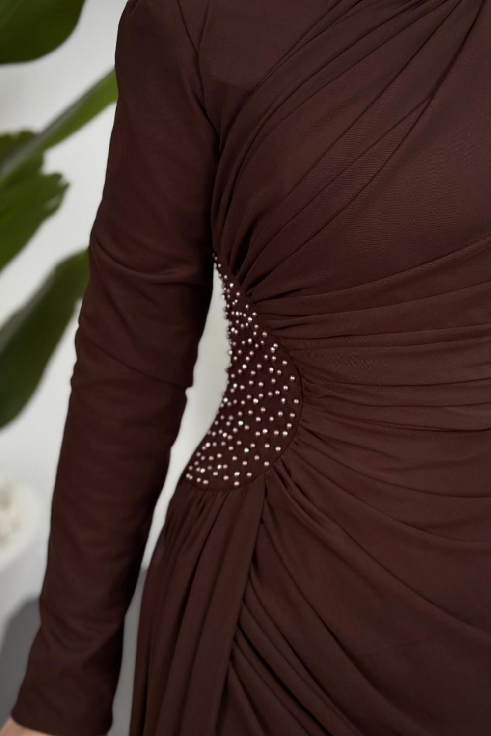 Perlina Yandan İncili Abiye Kahverengi