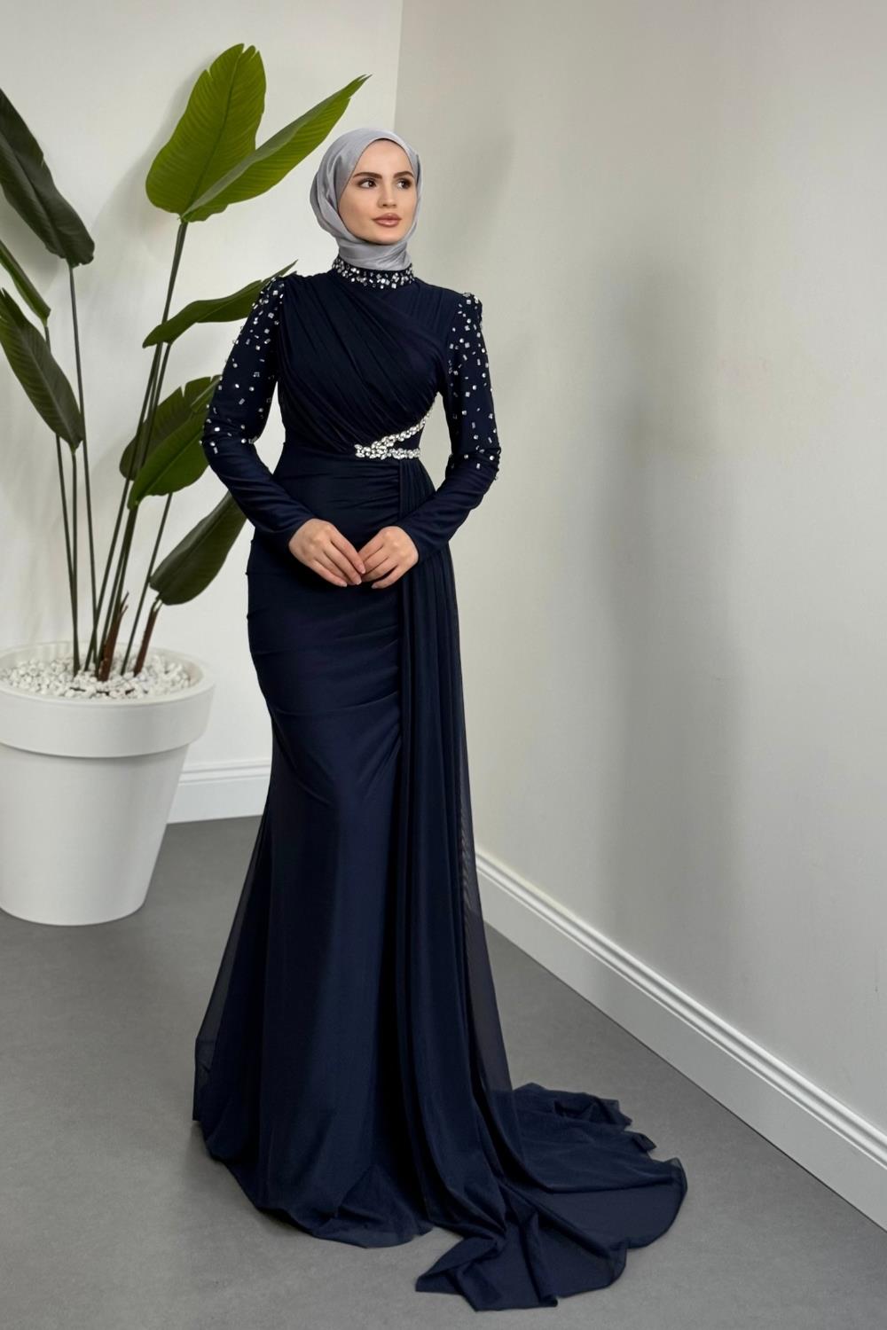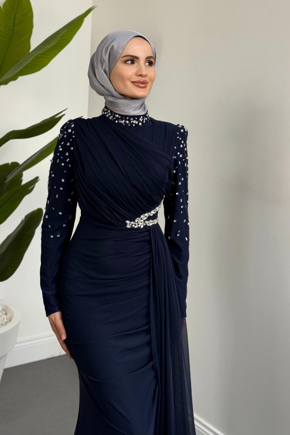 Elvira Taş Detaylı Tül Abiye Lacivert