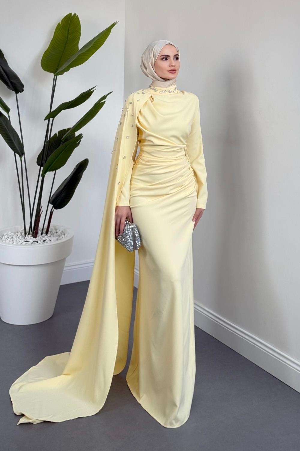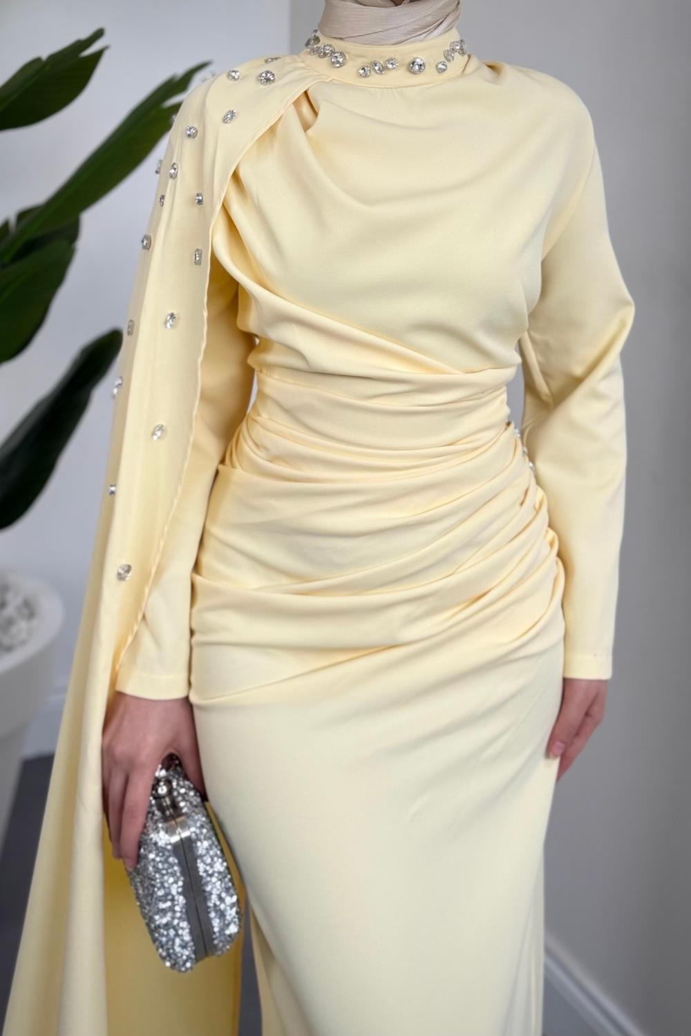 Feranya Yandan Taşlı Pelerinli Balık Abiye Butter Yellow