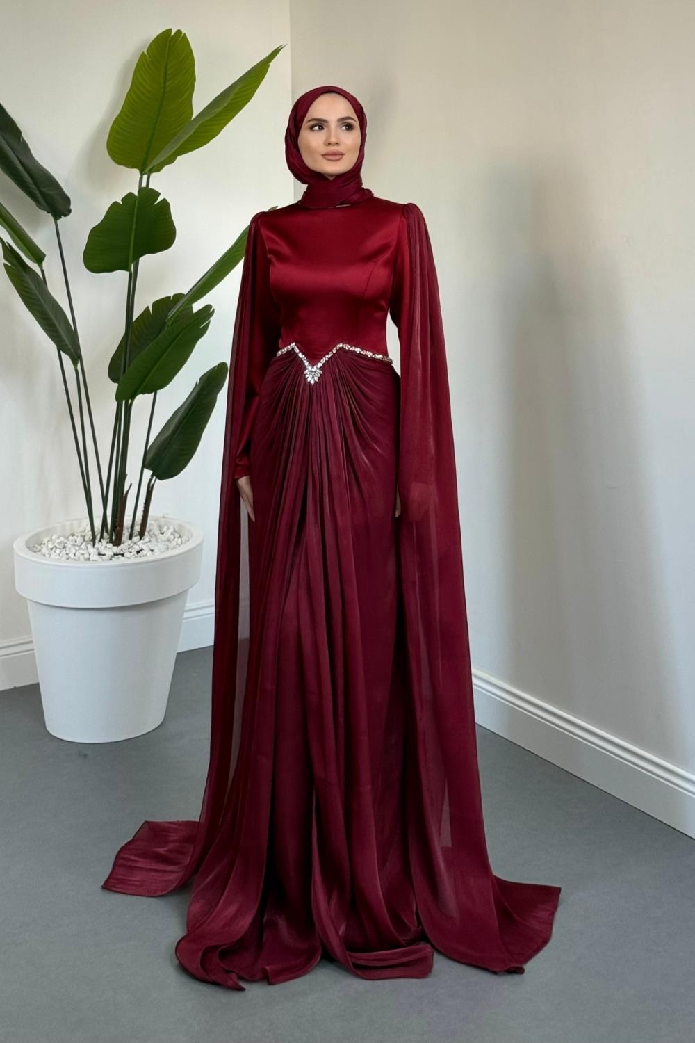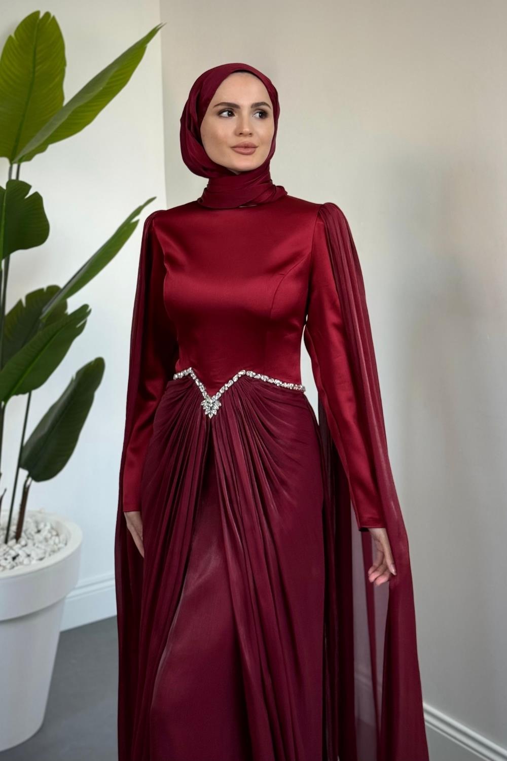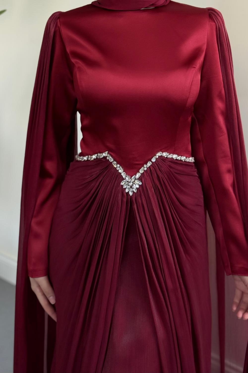 Loverna Taşlı Pelerinli Abiye Bordo
