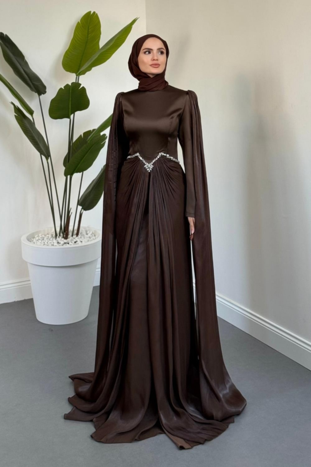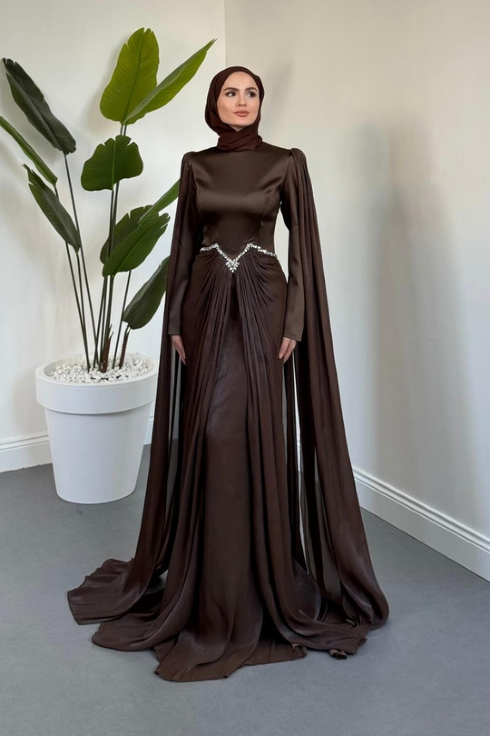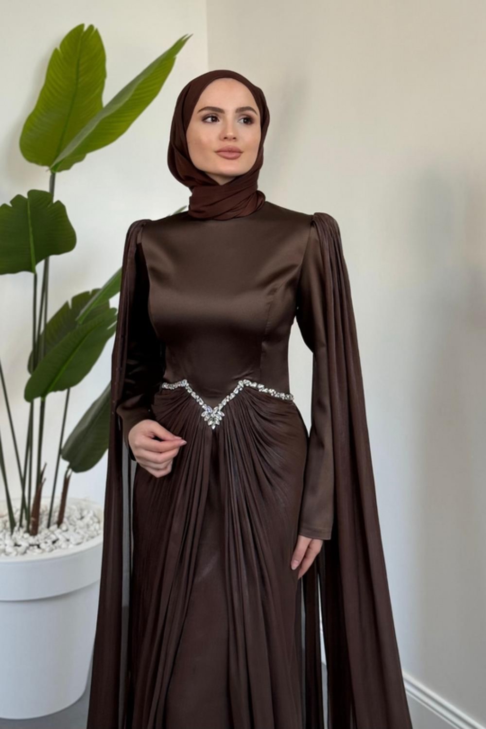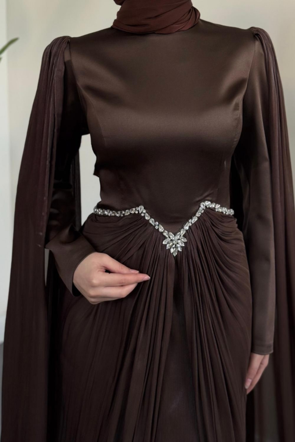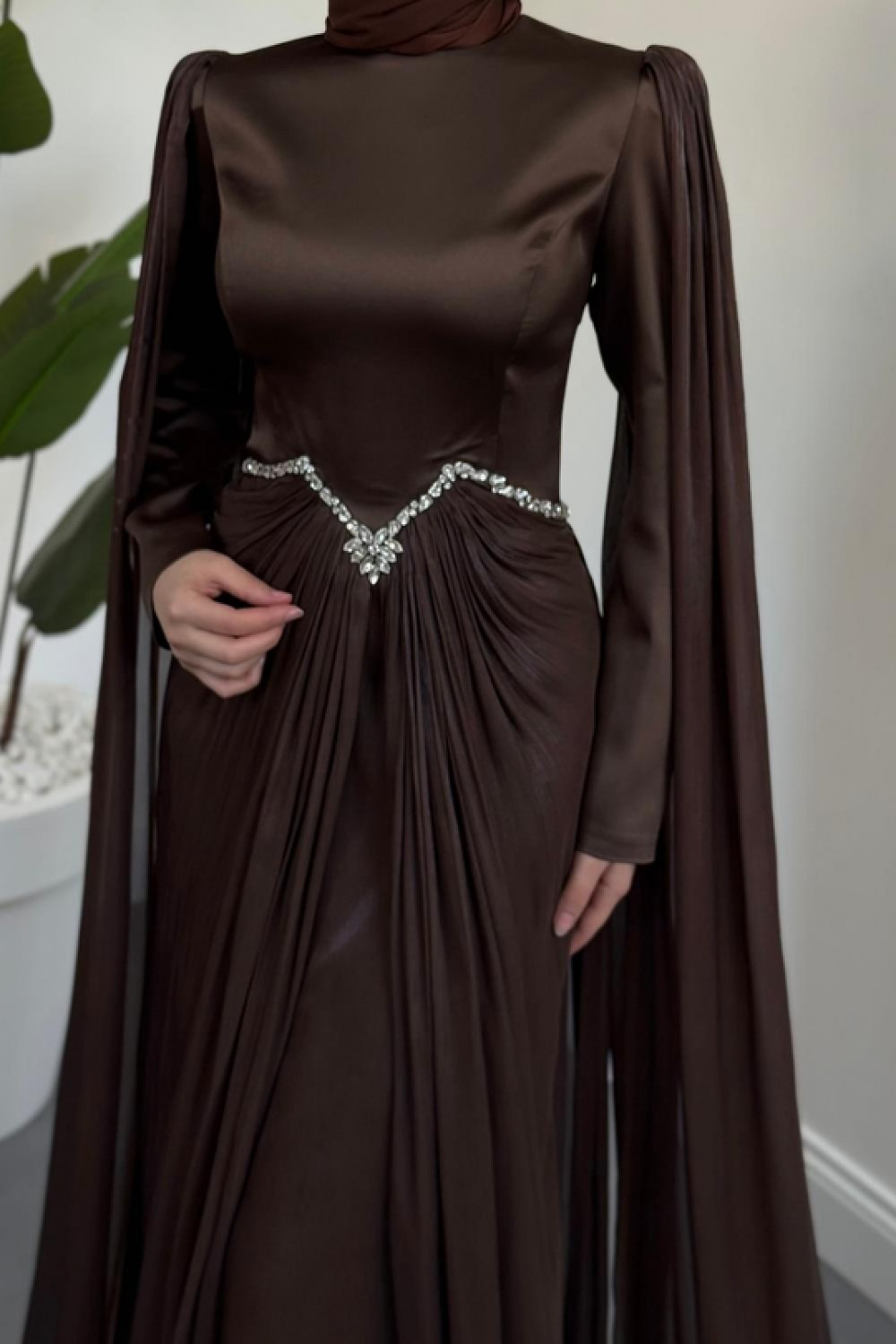 Loverna Taşlı Pelerinli Abiye Kahverengi