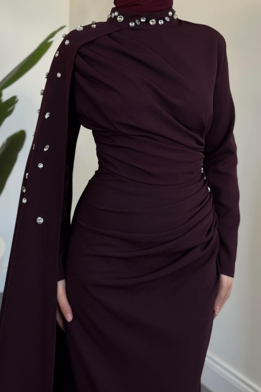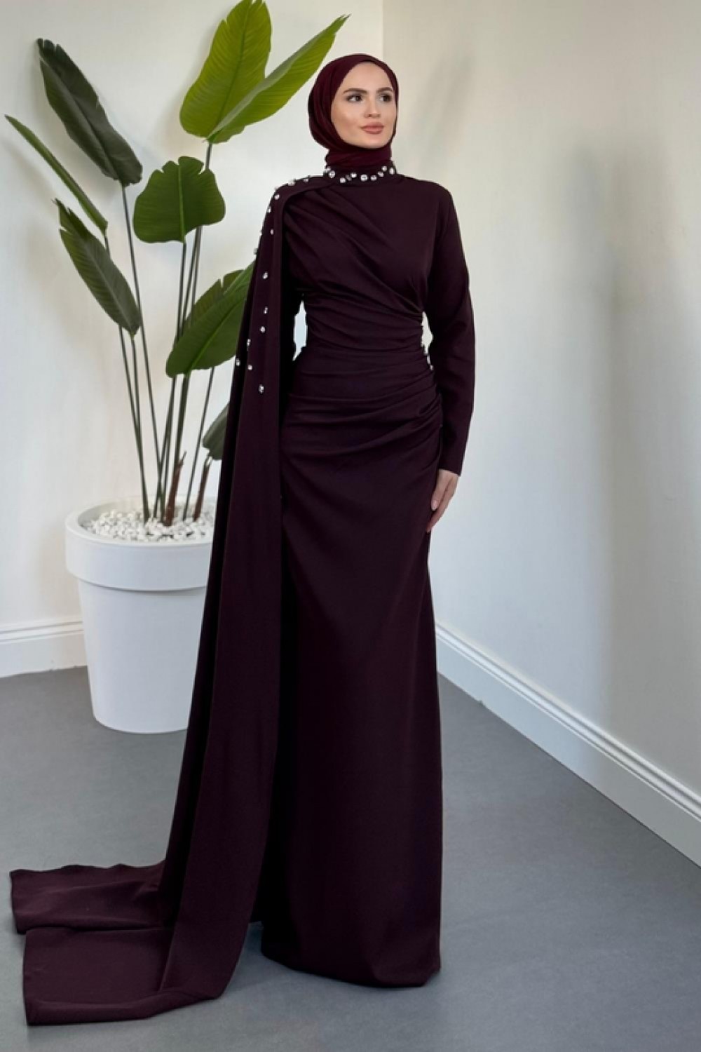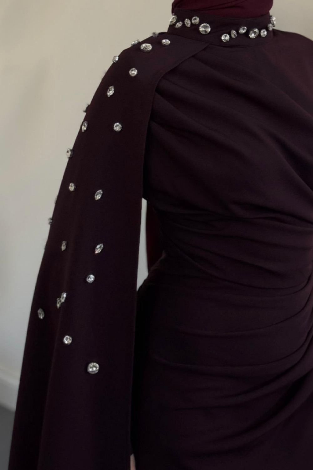 Feranya Yandan Taşlı Pelerinli Balık Abiye Mürdüm