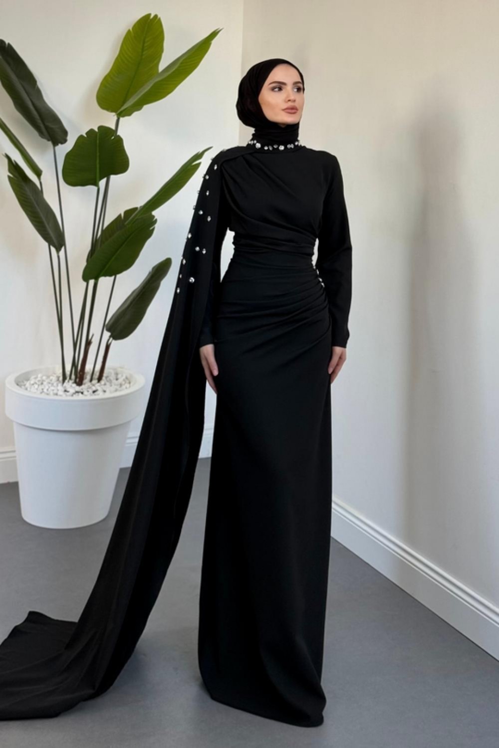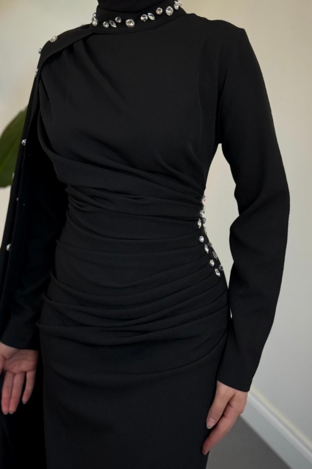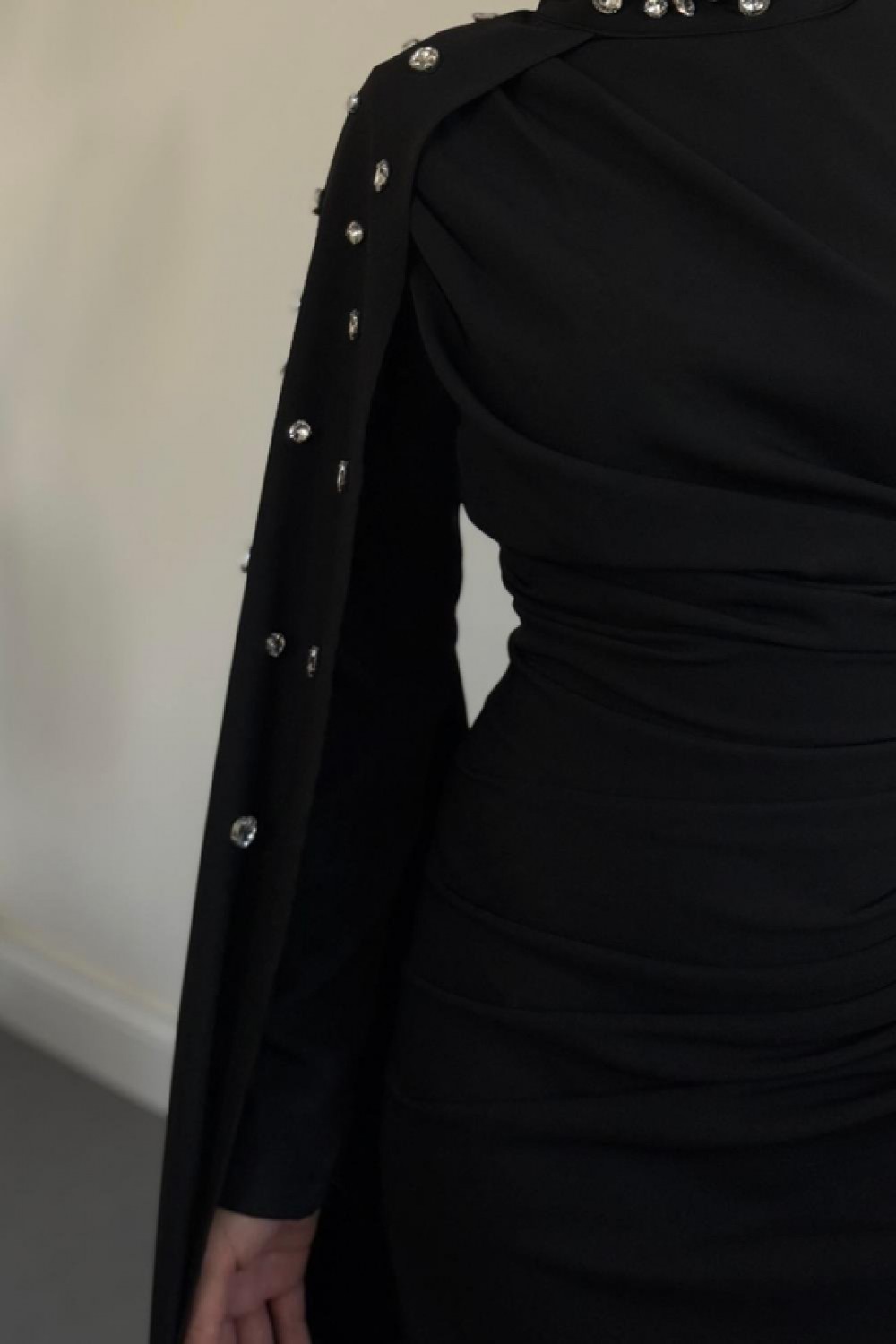 Feranya Yandan Taşlı Pelerinli Balık Abiye Siyah