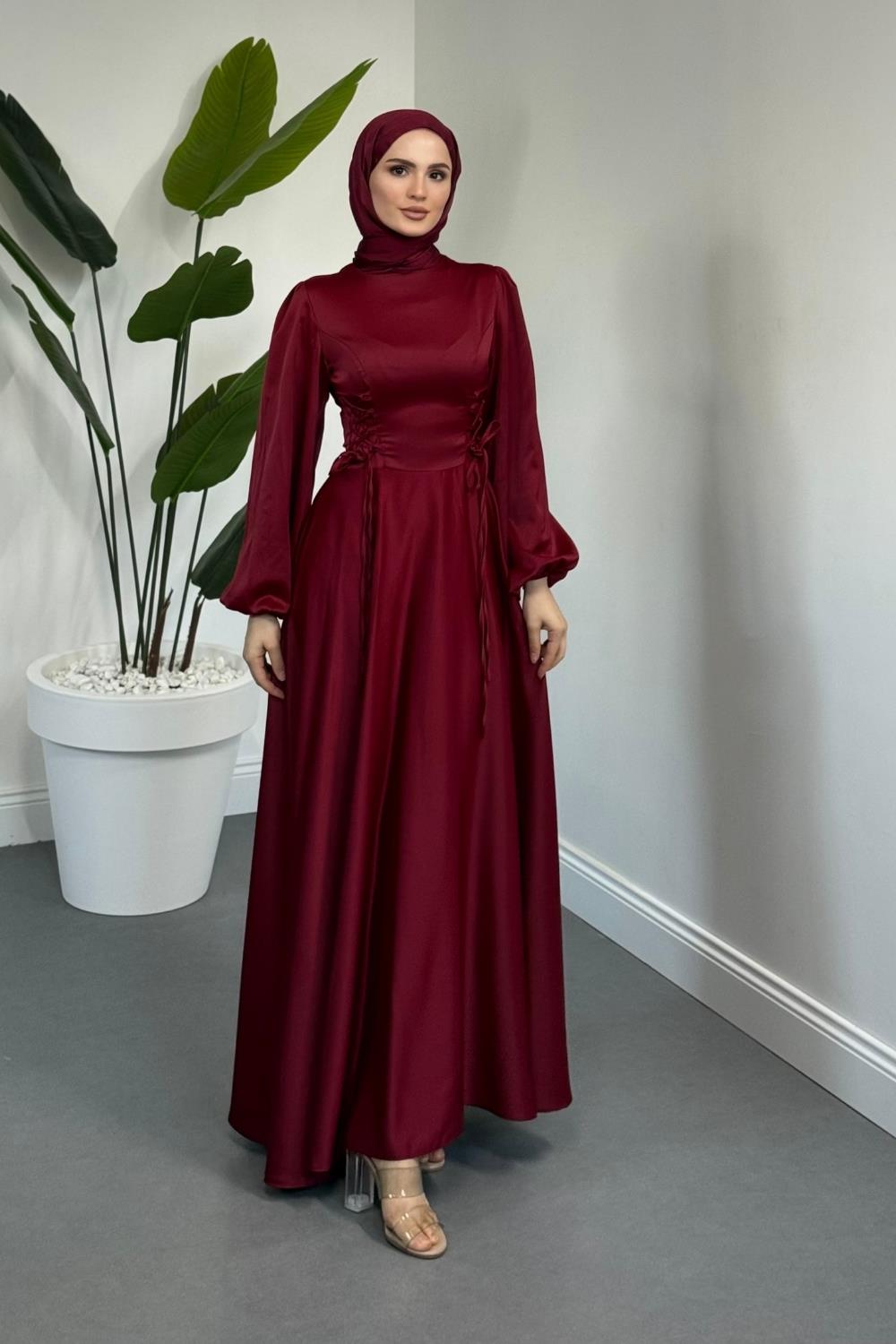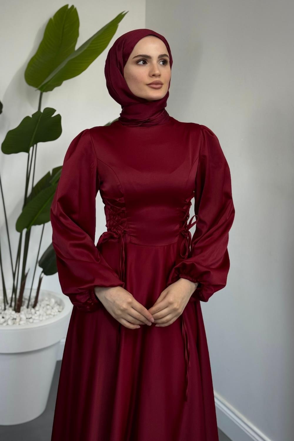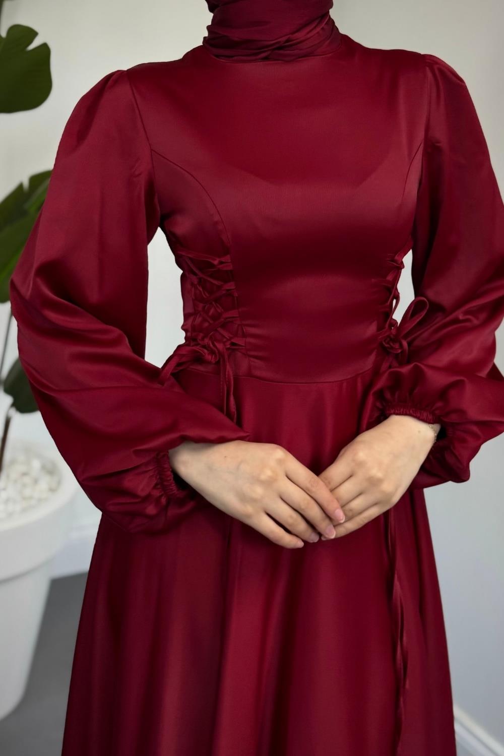 Orya Yanları Sıkmalı Saten Abiye Bordo