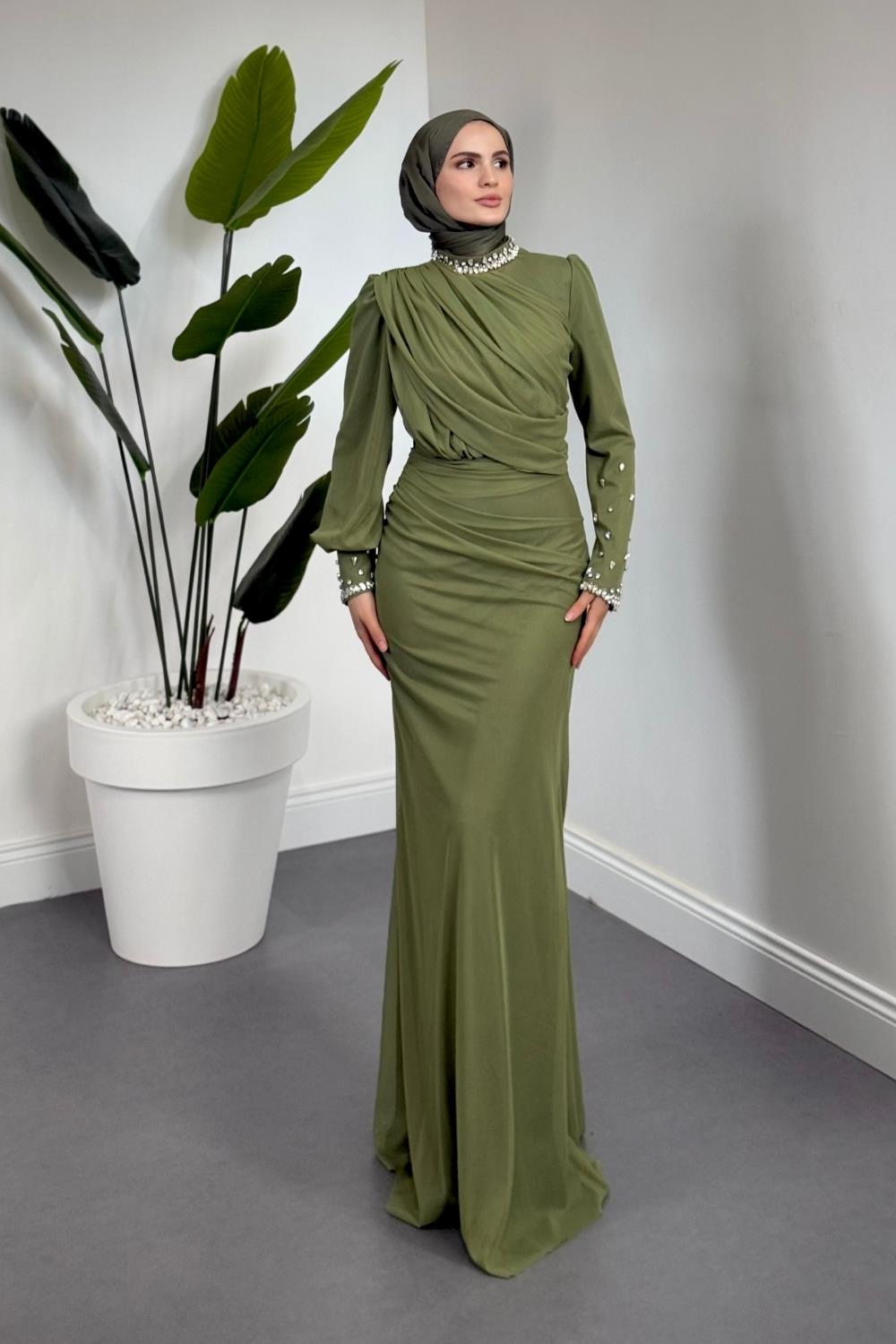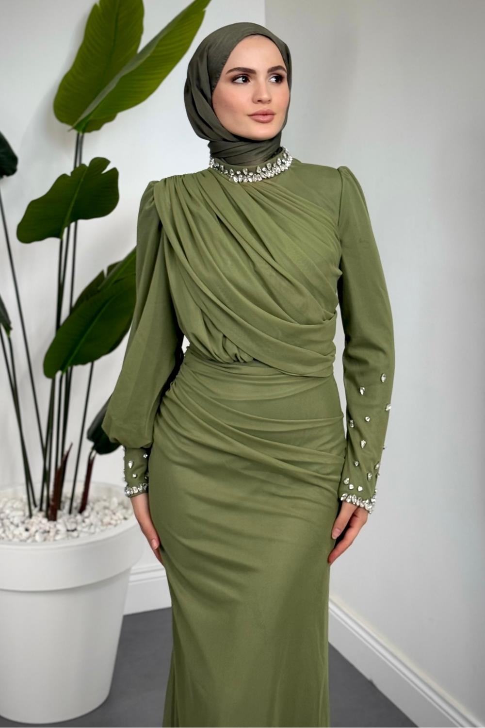 Lavrine Boynu Ve Kolu Taşlı Tül Abiye Haki