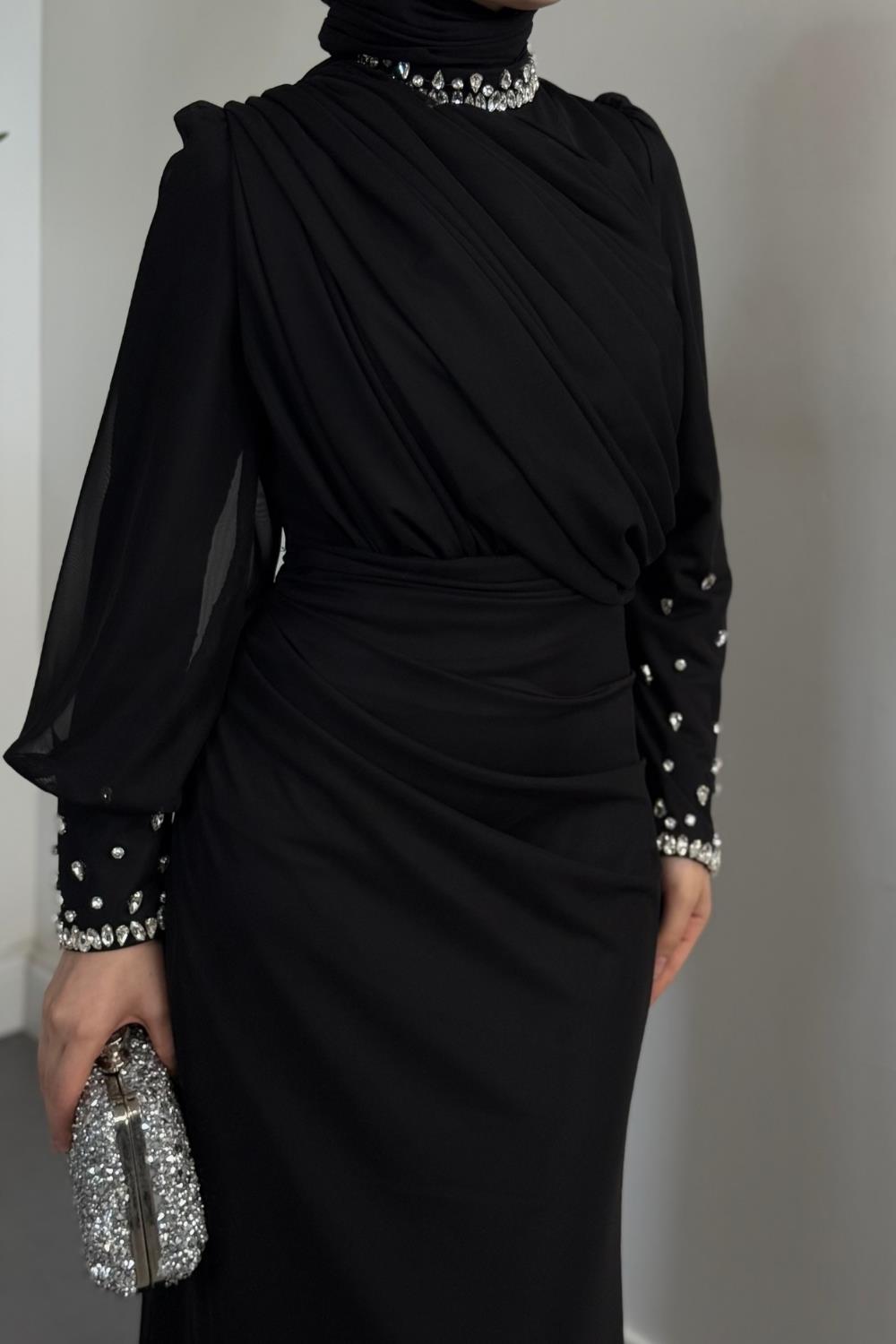 Lavrine Boynu Ve Kolu Taşlı Tül Abiye Siyah