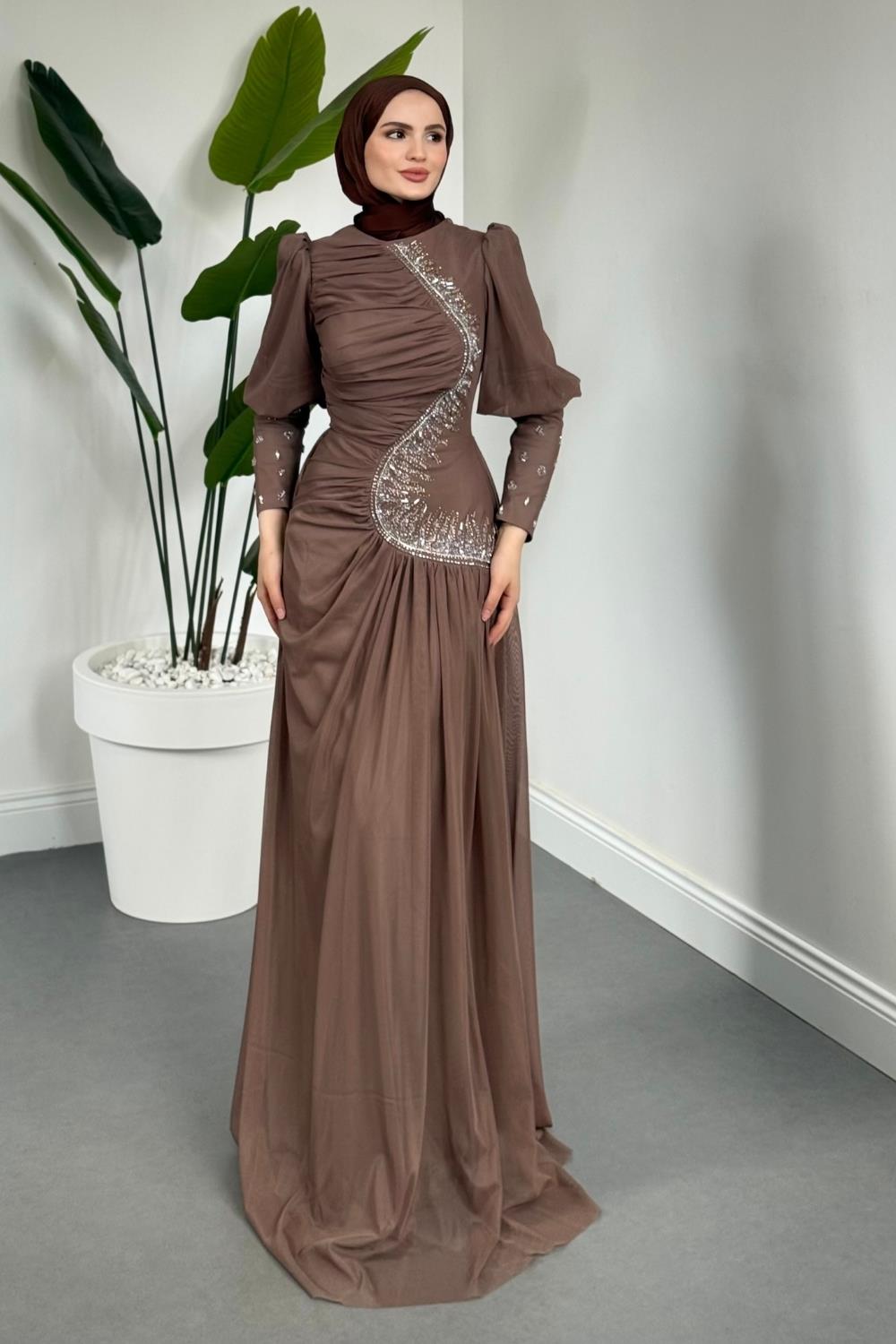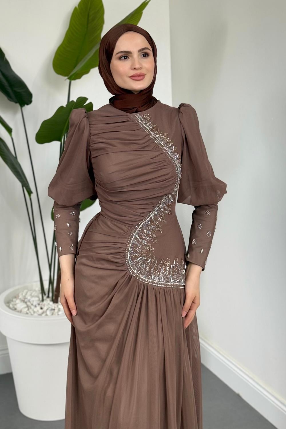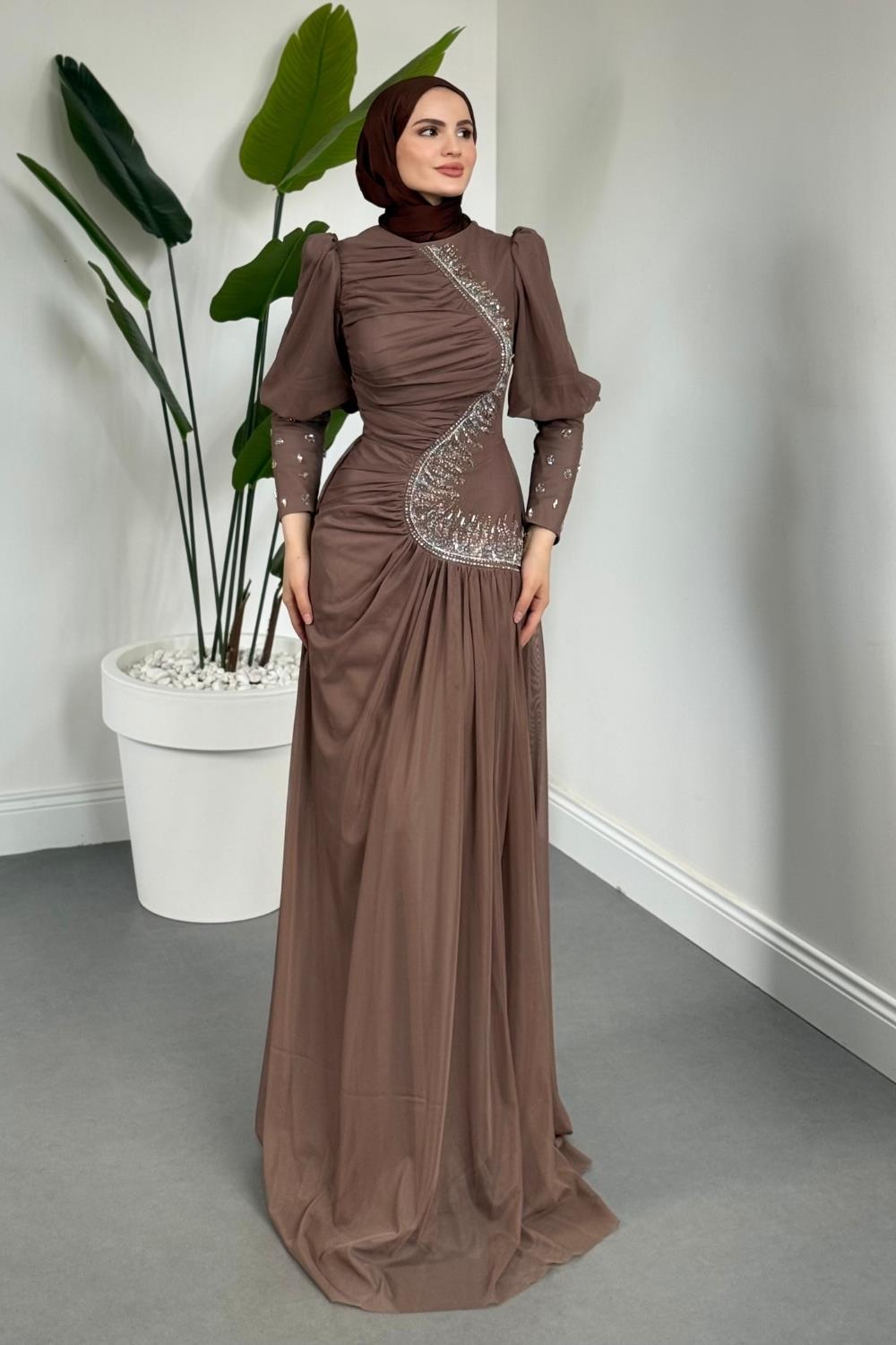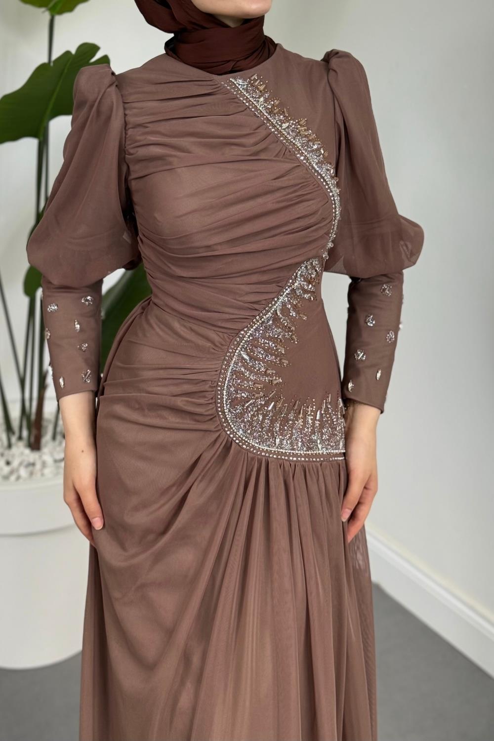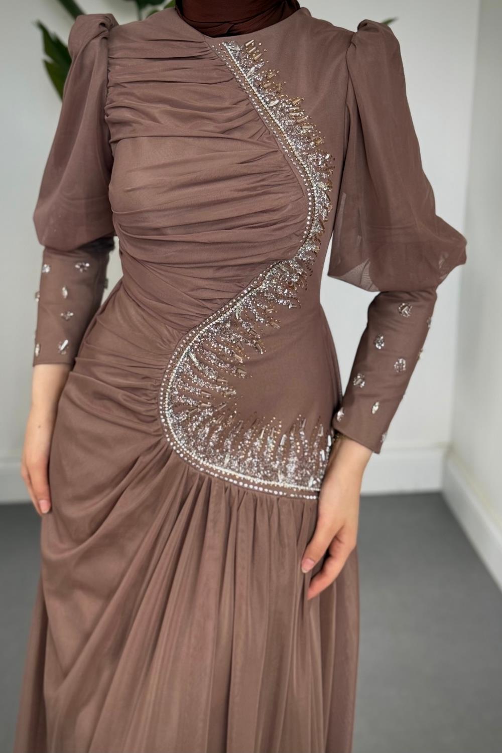 Aveline Yandan Taşlı Tül Abiye Vizon