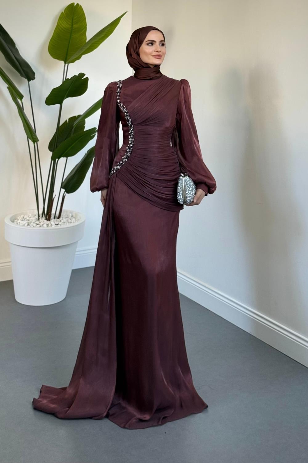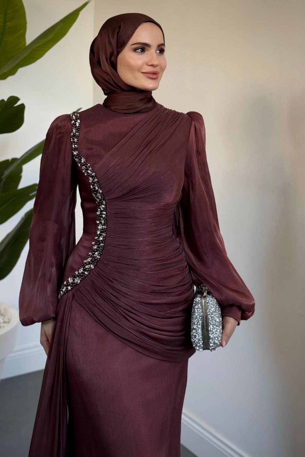 Ansel Yandan Taşlı Drapeli Janjan Abiye Gül Kurusu