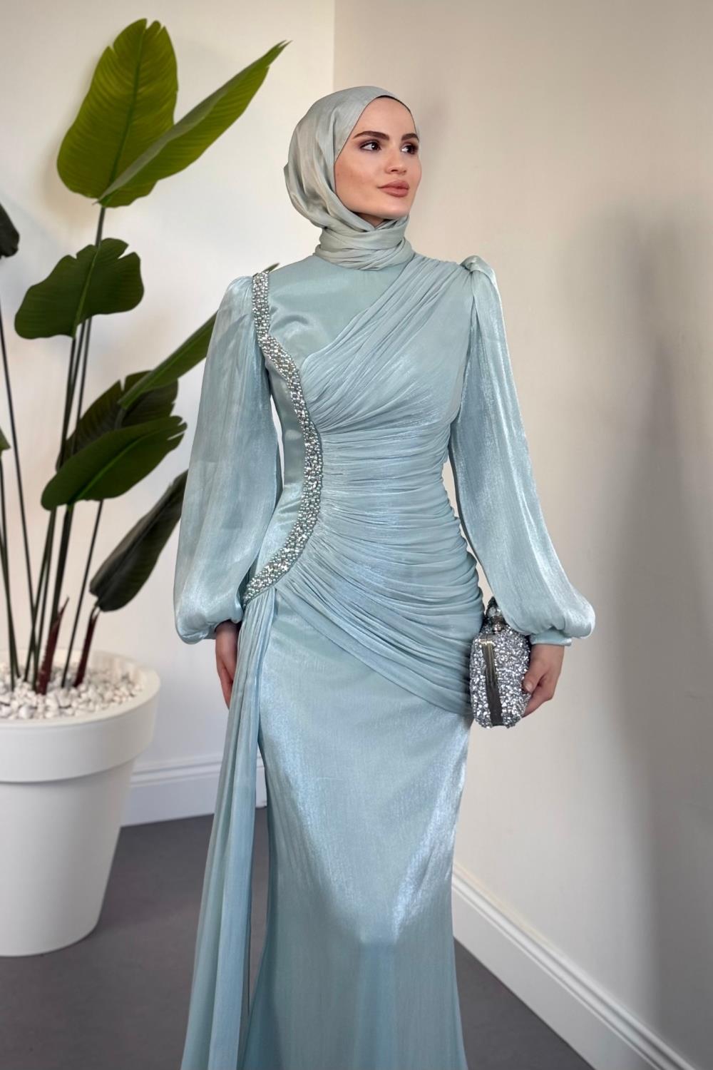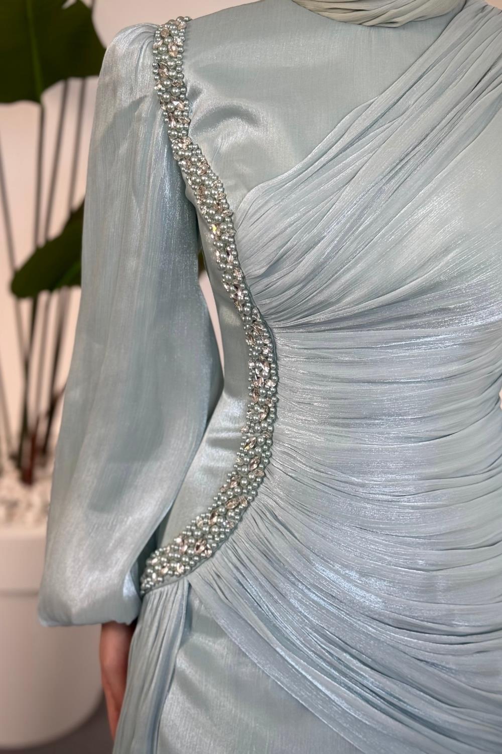 Ansel Yandan Taşlı Drapeli Janjan Abiye Mint