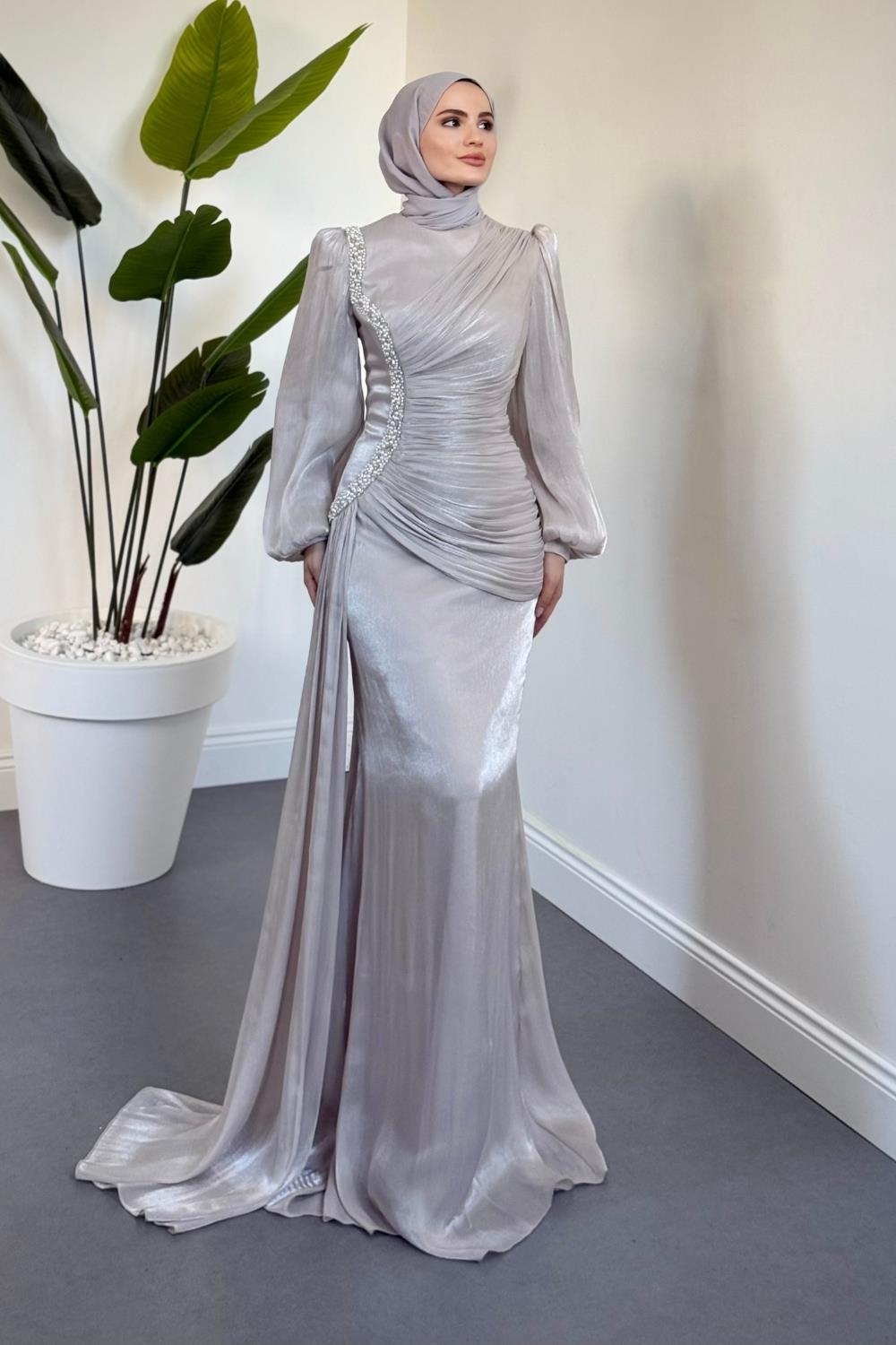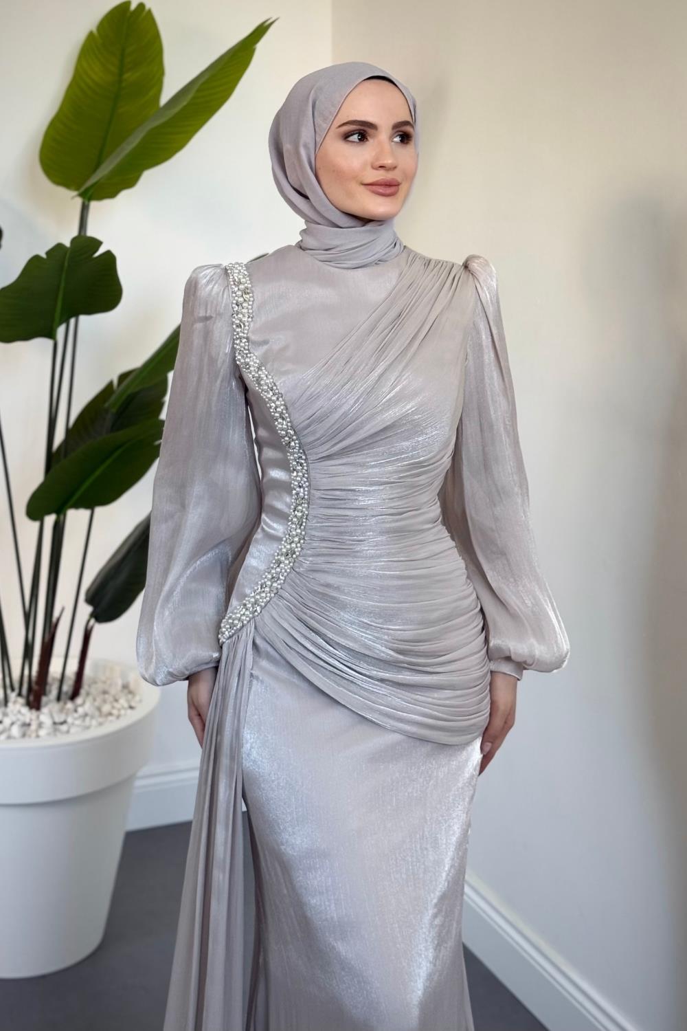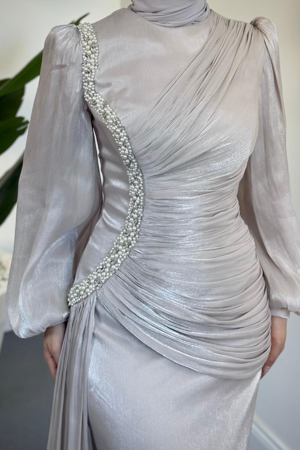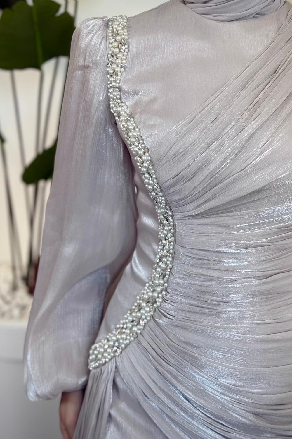 Ansel Yandan Taşlı Drapeli Janjan Abiye Taş
