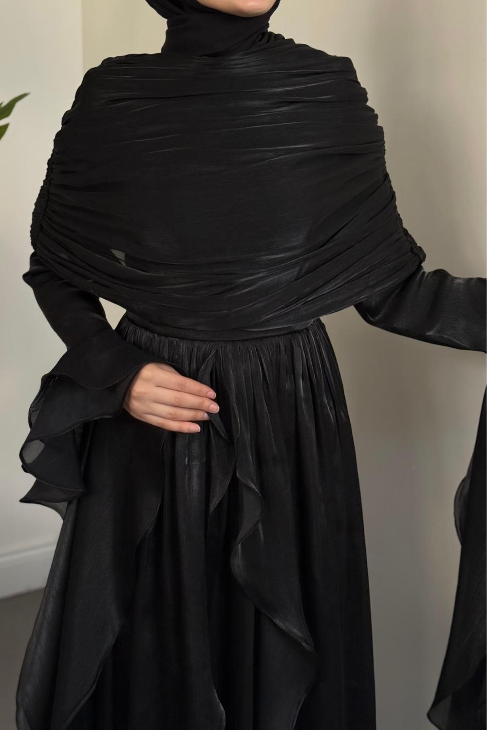 Naruna Pelerinli Fırfırlı Abiye Siyah