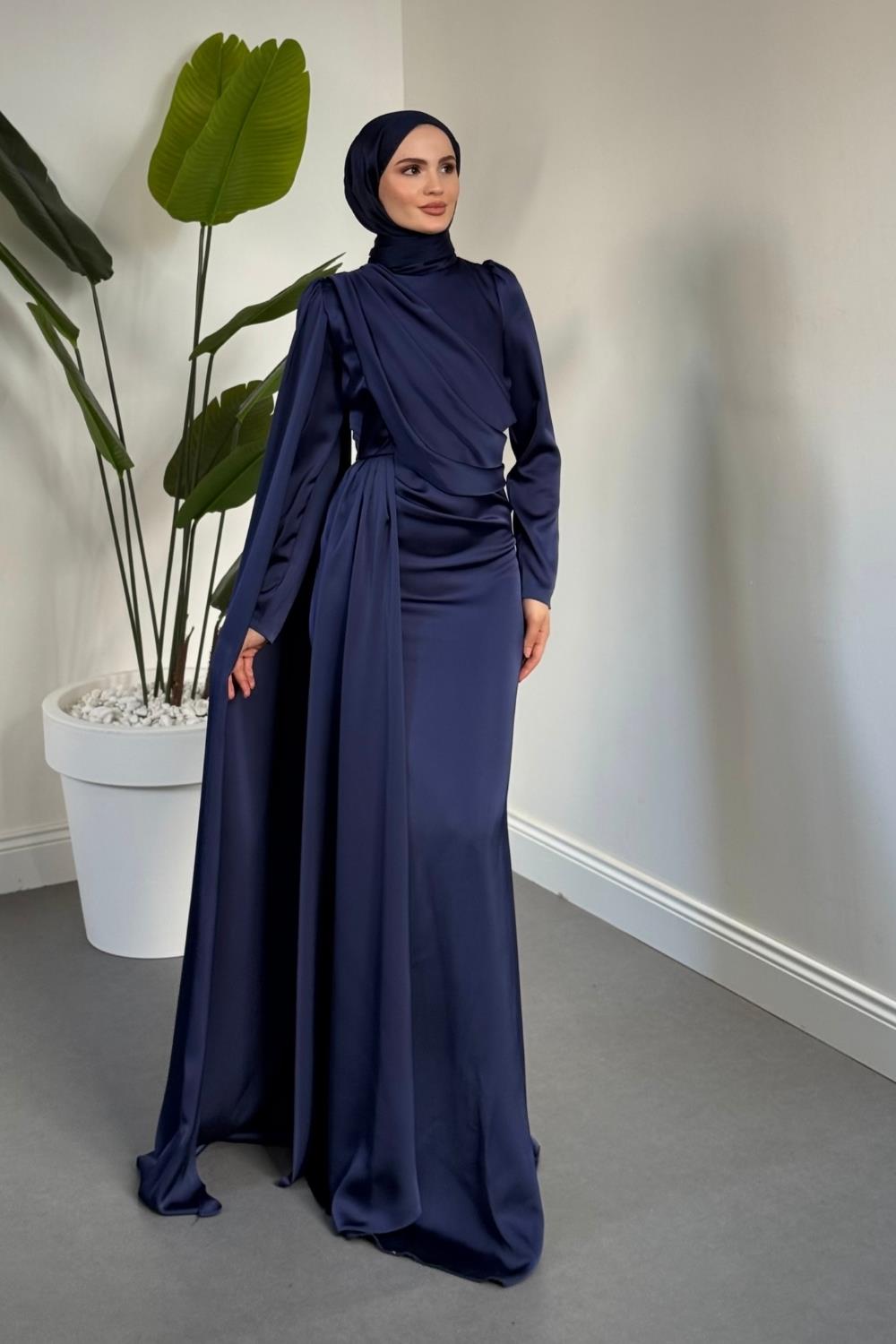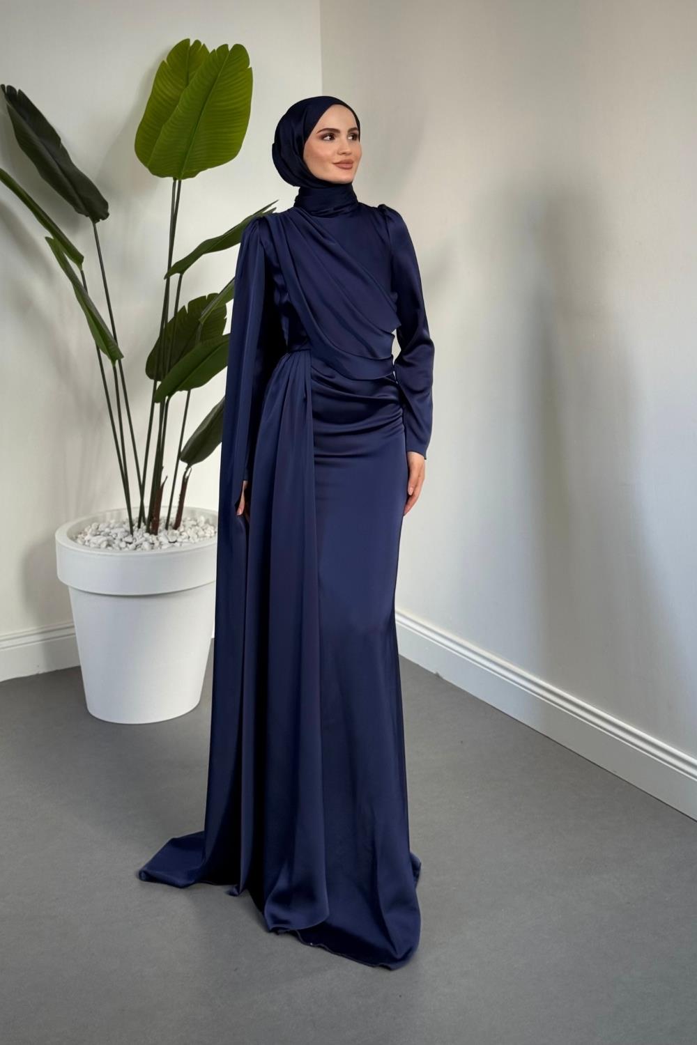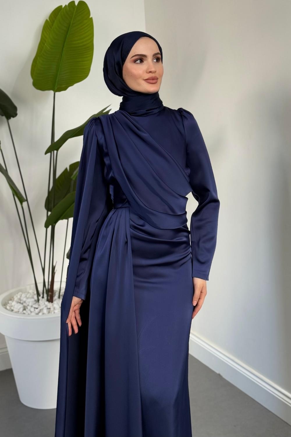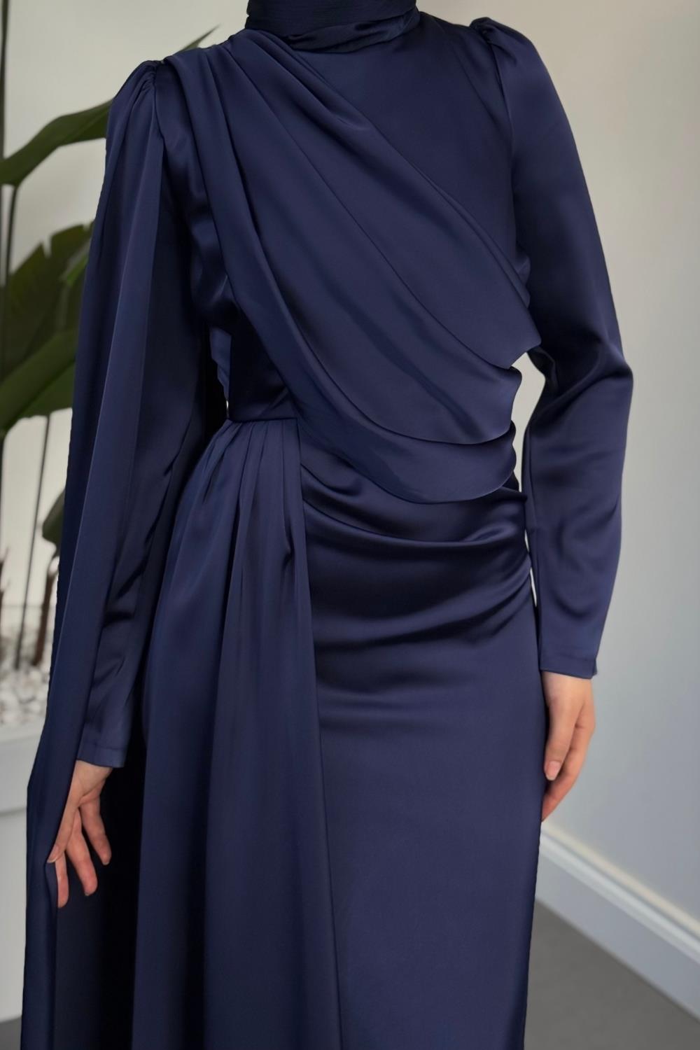 Morley Pelerinli Drapeli Saten Balık Abiye Lacivert