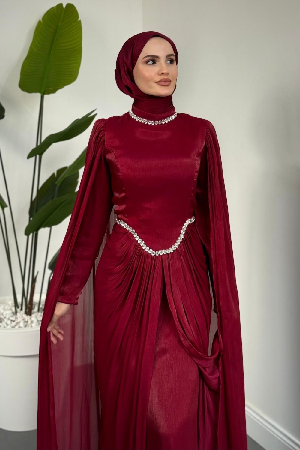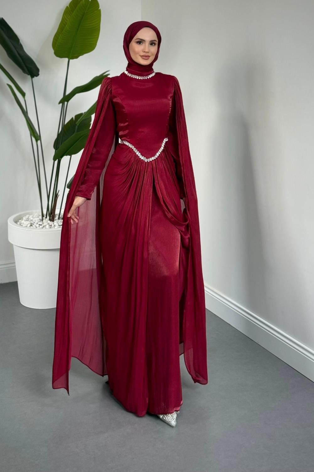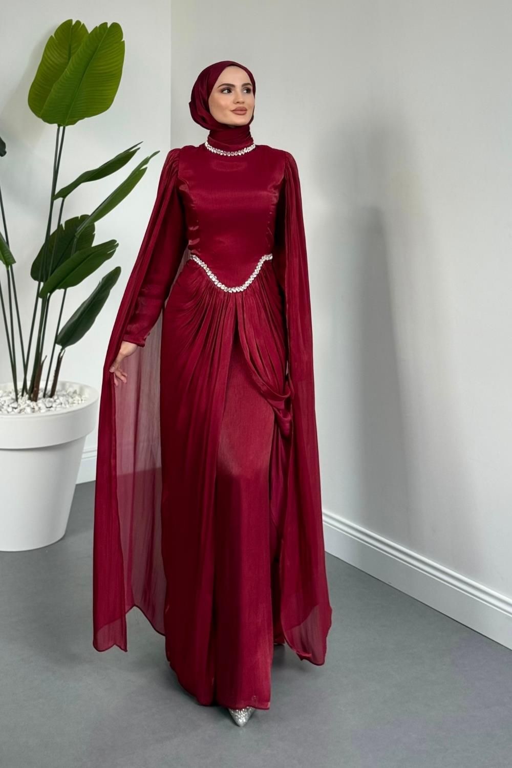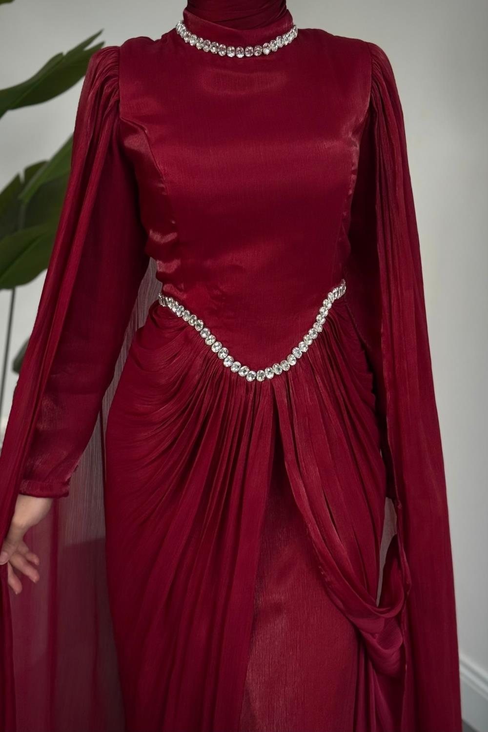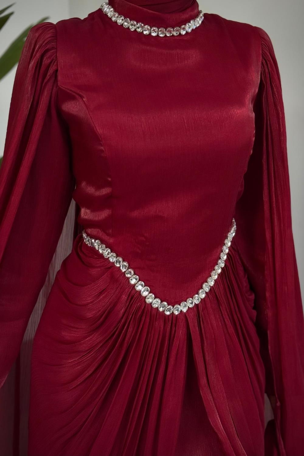 Maelis Beli Ve Boynu Taşlı Abiye Bordo