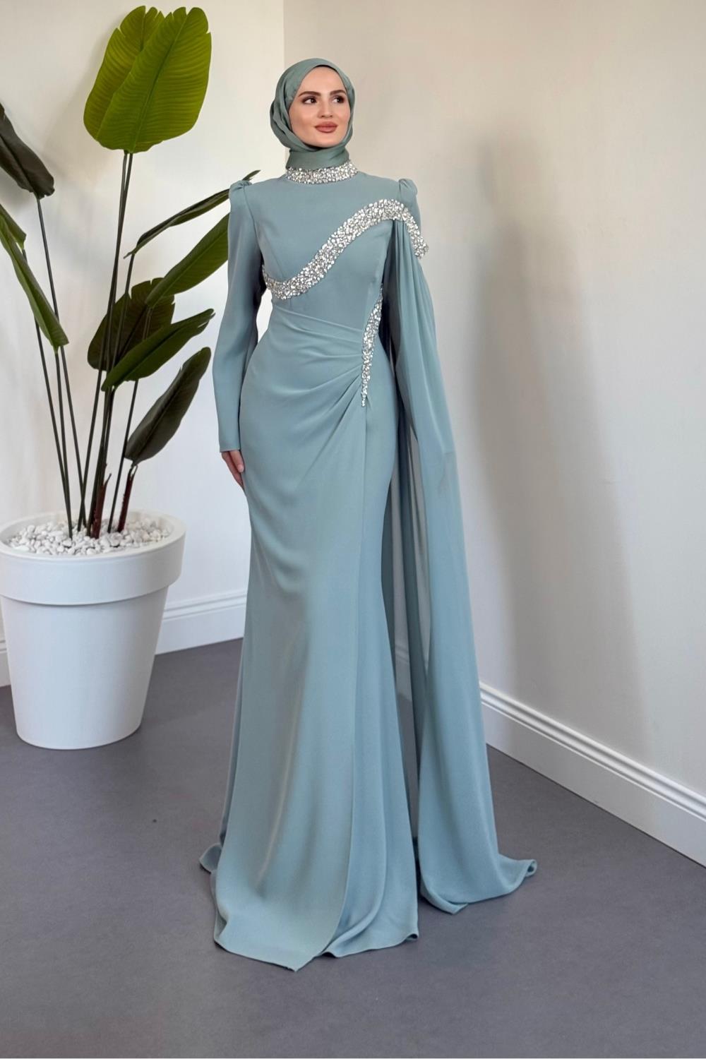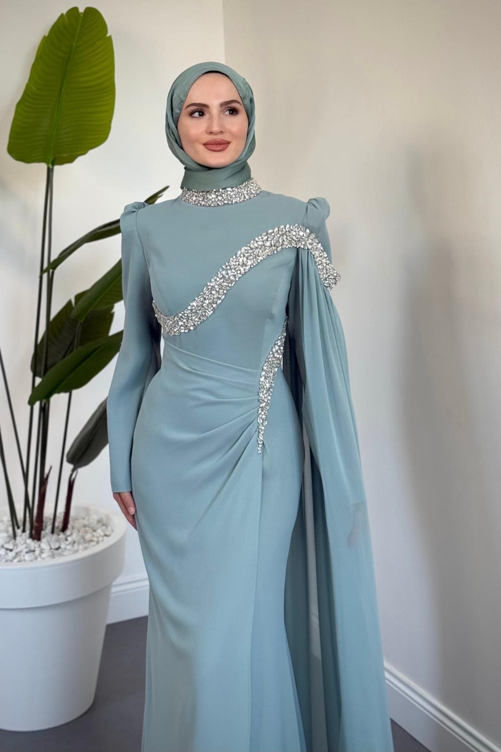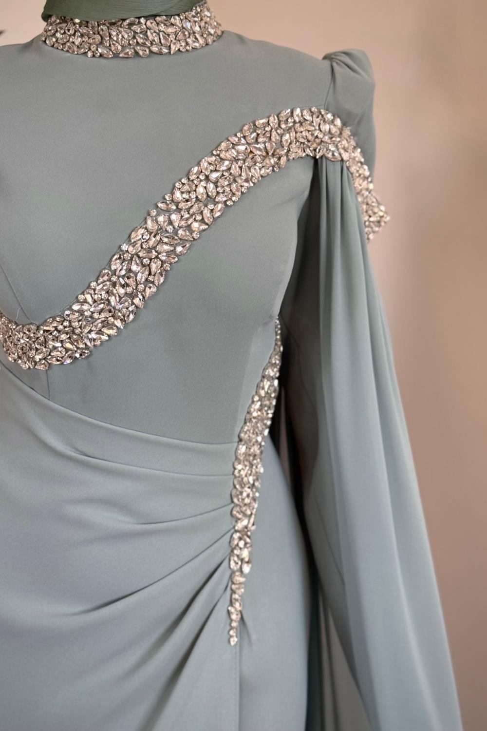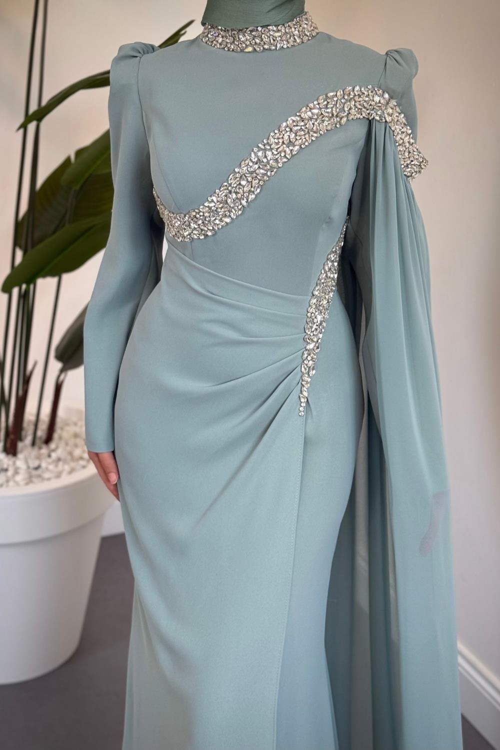 Feriha Yandan Pelerinli Taşlı Özel Tasarım Abiye Mint