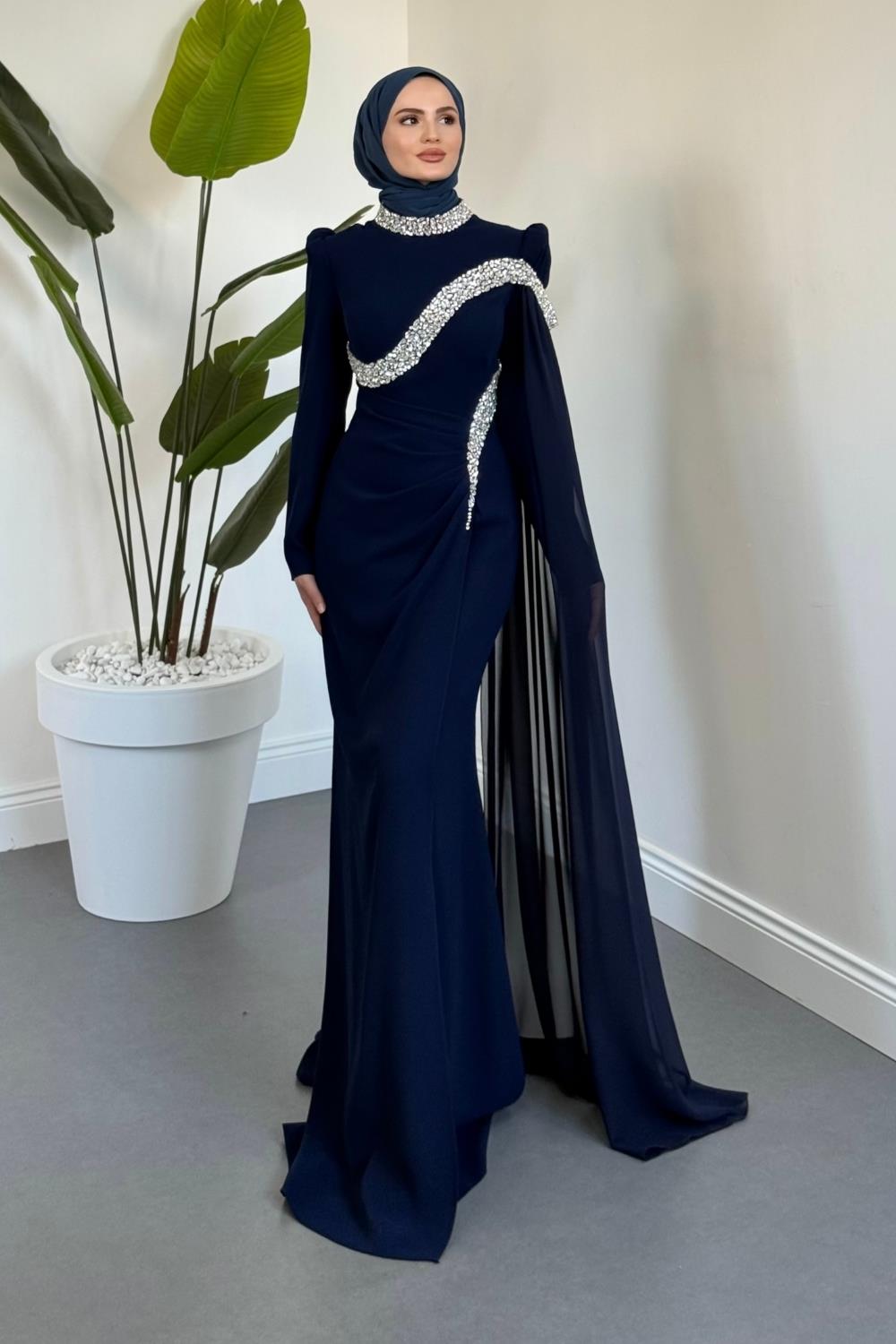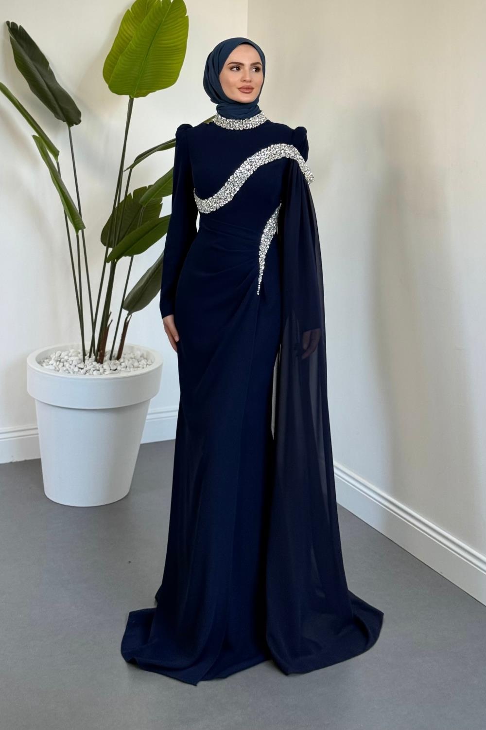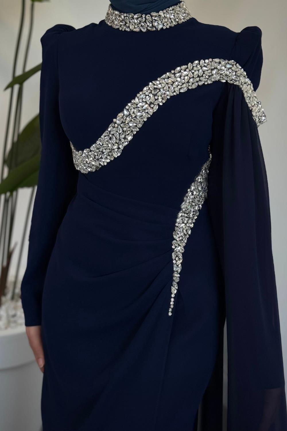 Feriha Yandan Pelerinli Taşlı Özel Tasarım Abiye Lacivert