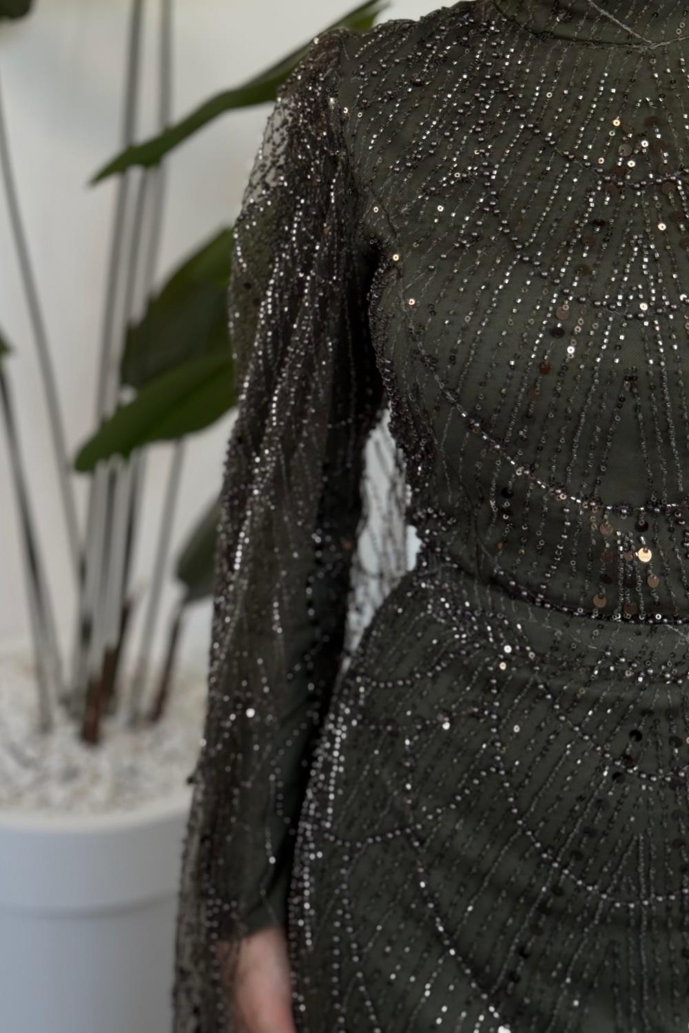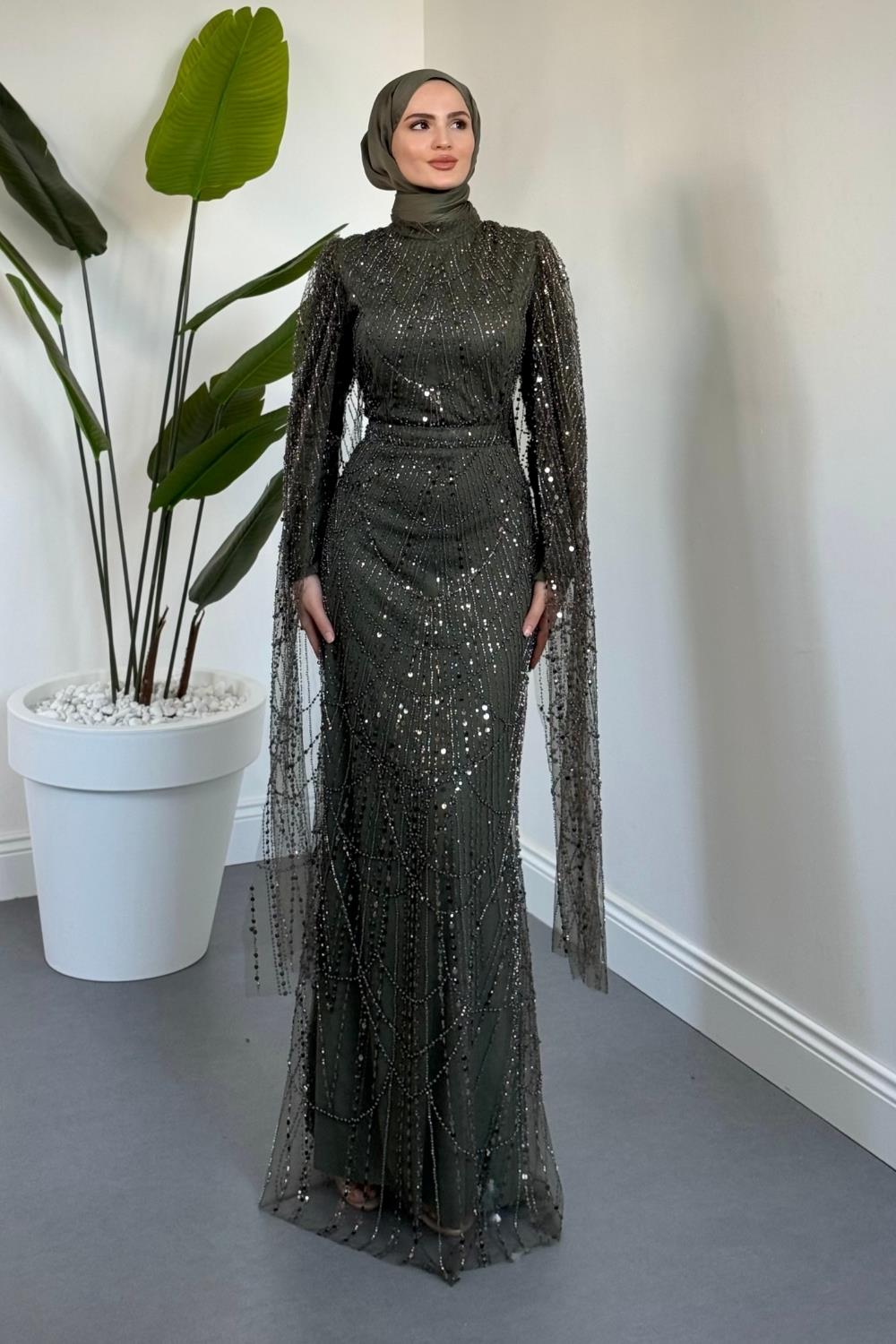Eloria Pelerinli Boncuk İşlemeli Abiye Haki