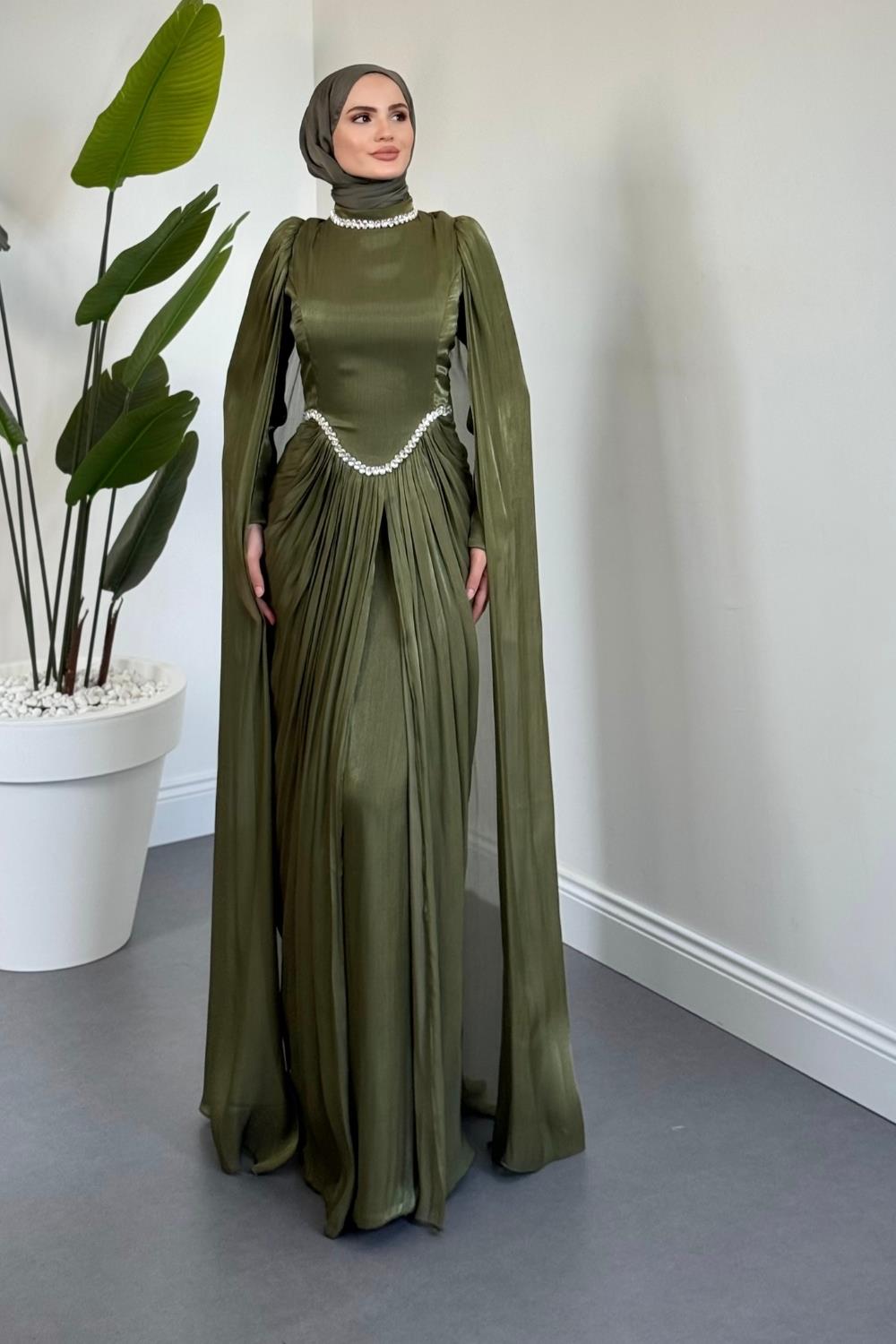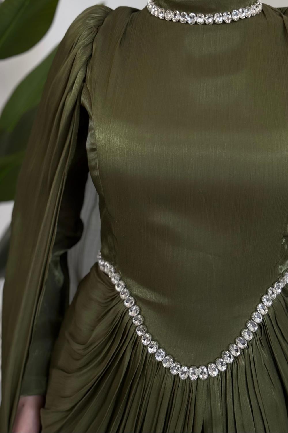Maelis Beli Ve Boynu Taşlı Abiye Haki