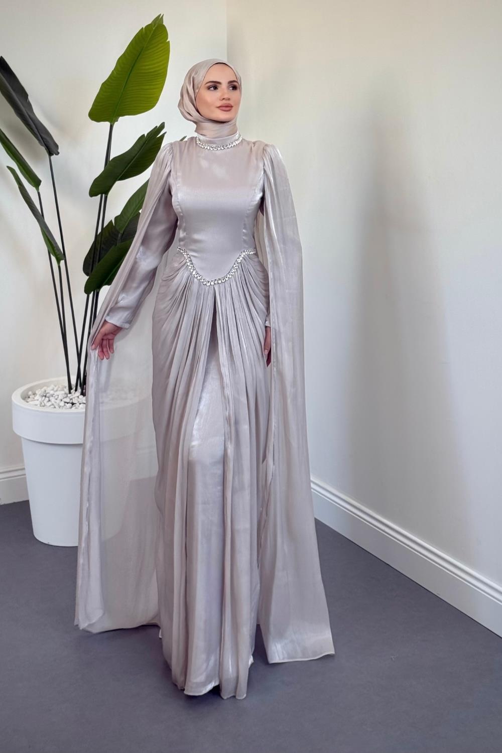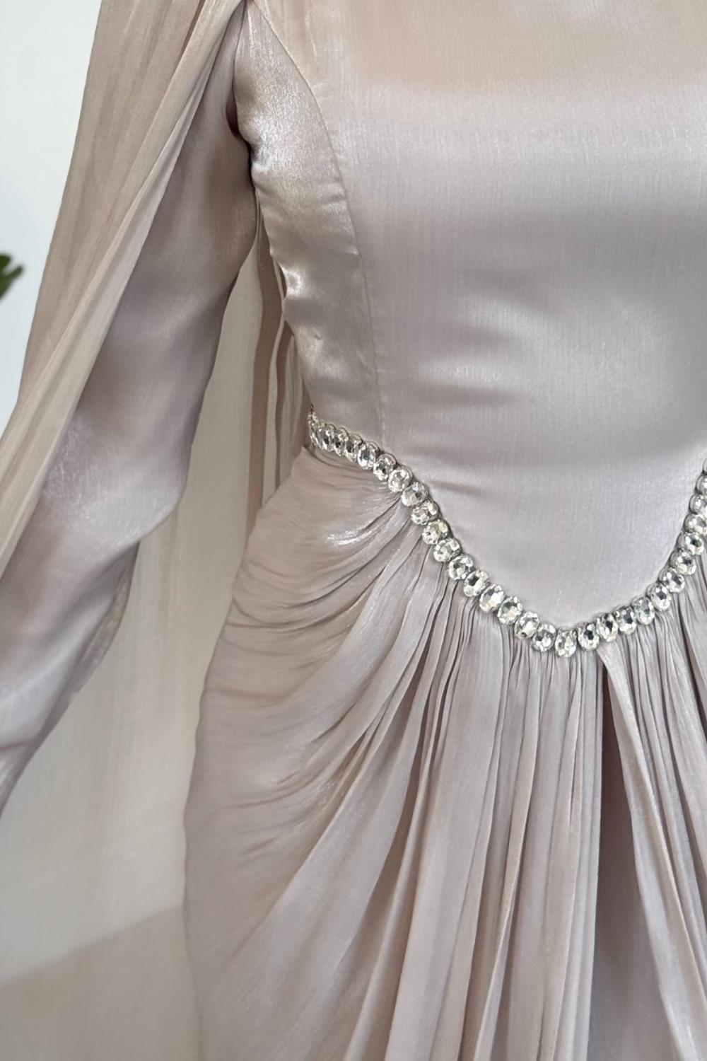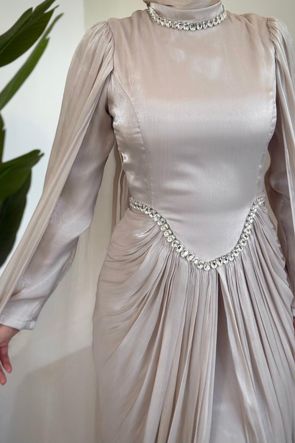Maelis Beli Ve Boynu Taşlı Abiye Krem