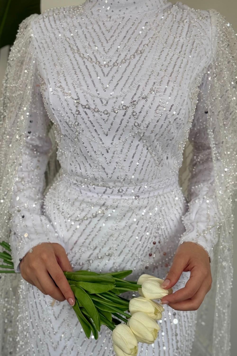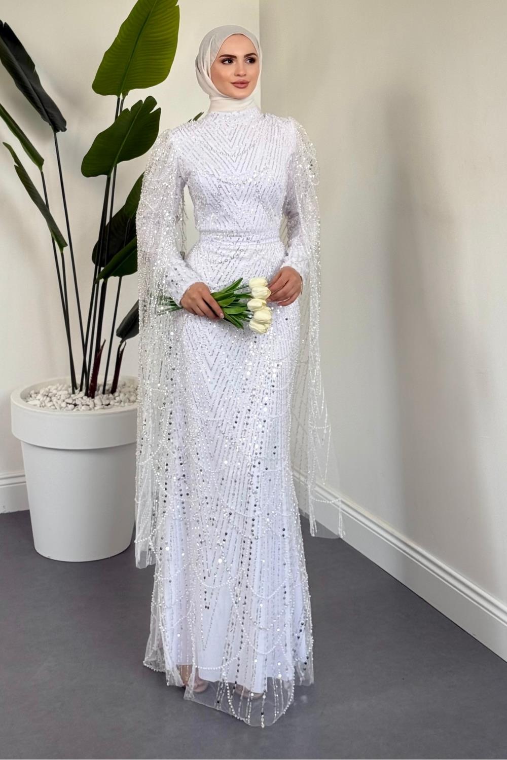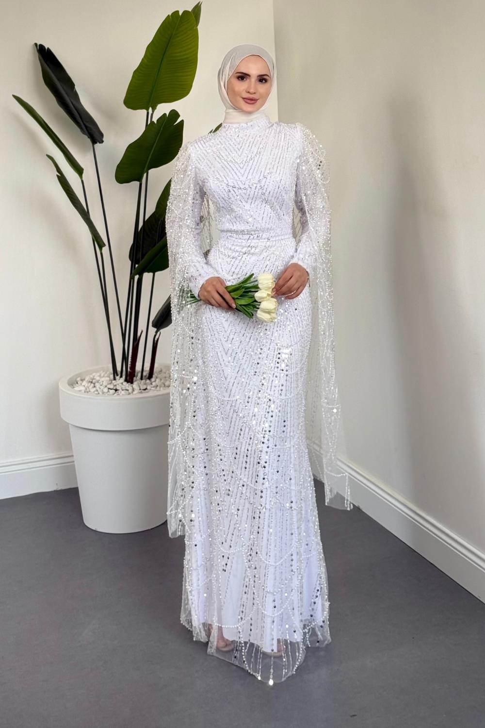 Eloria Pelerinli Boncuk İşlemeli Abiye Beyaz