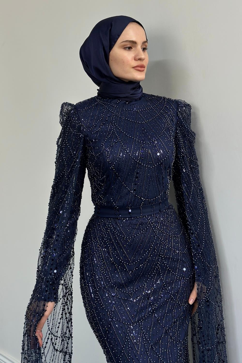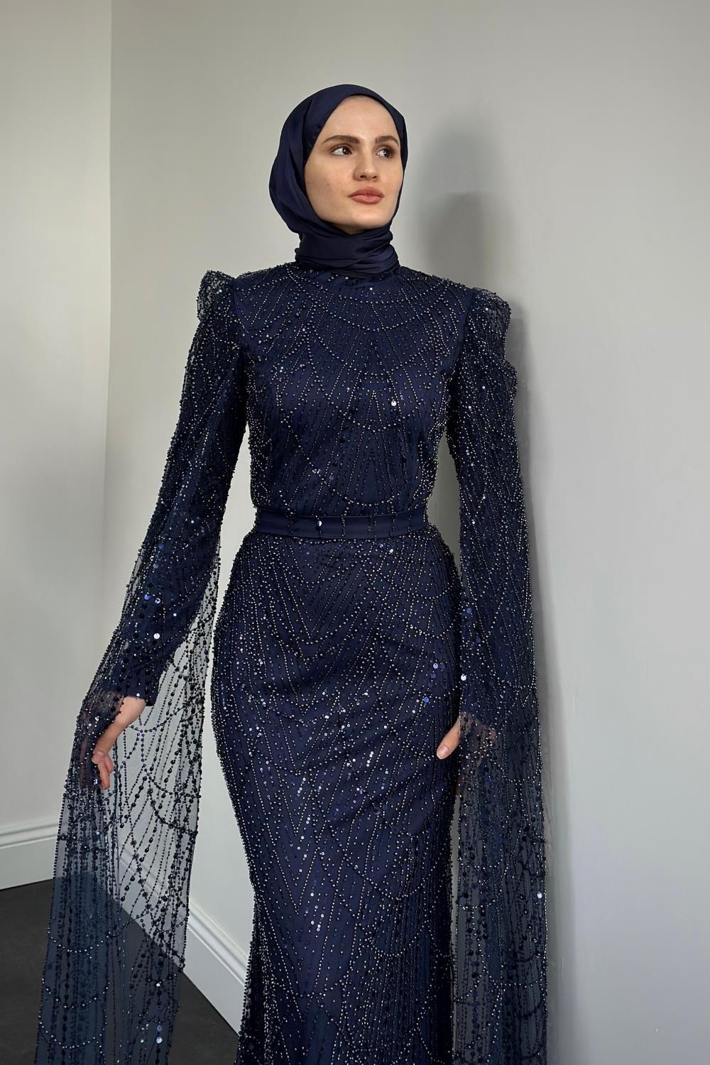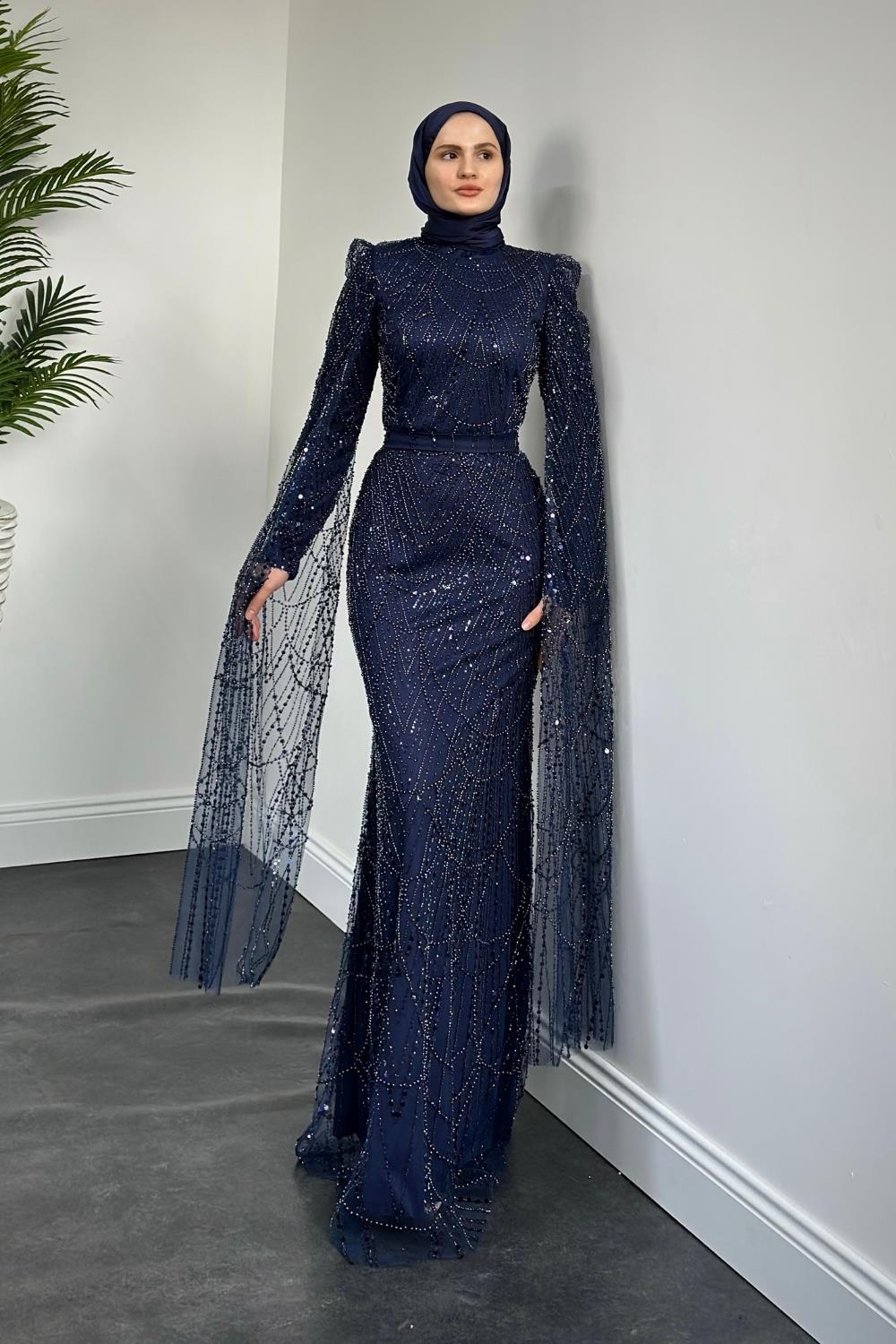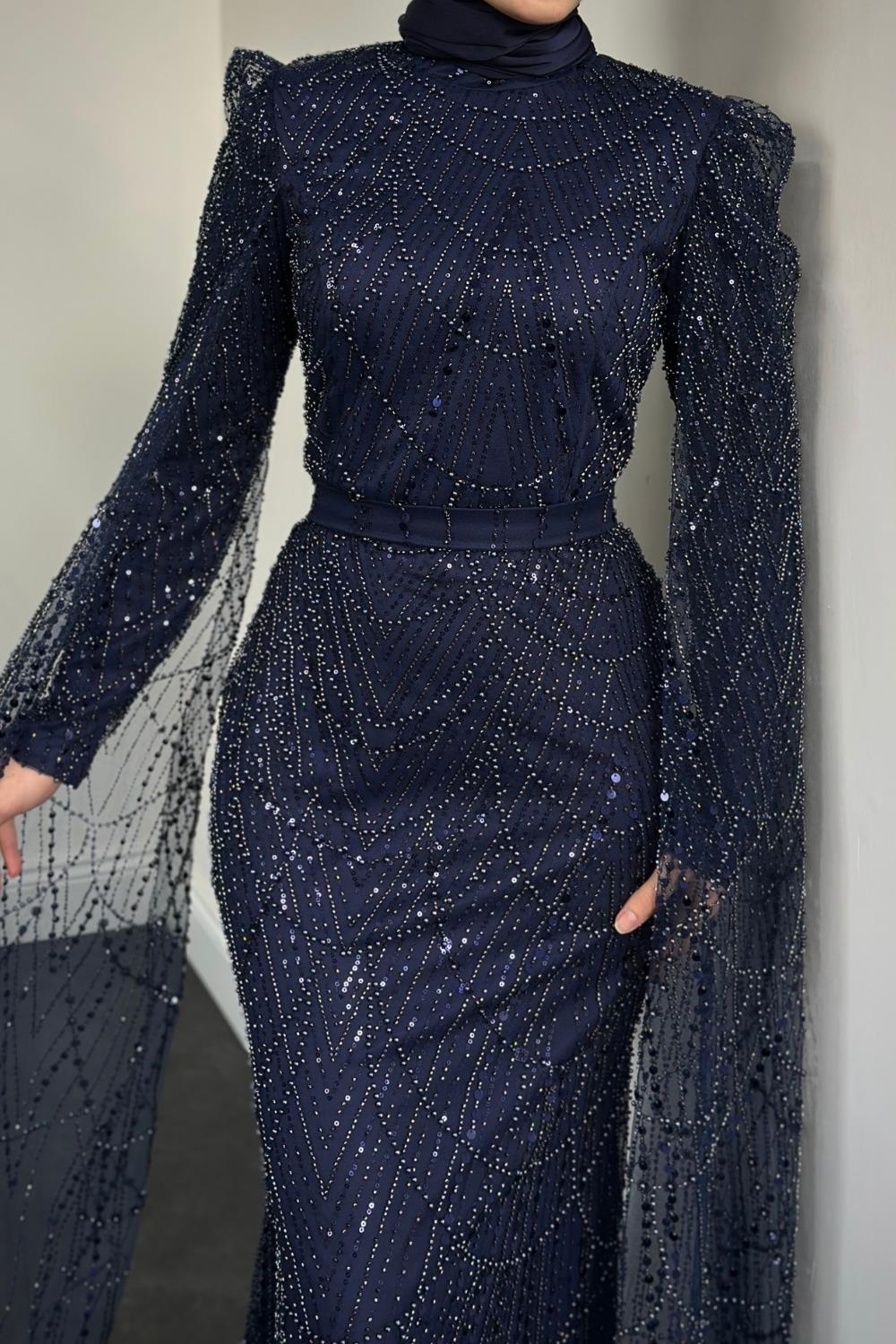 Eloria Pelerinli Boncuk İşlemeli Abiye Lacivert