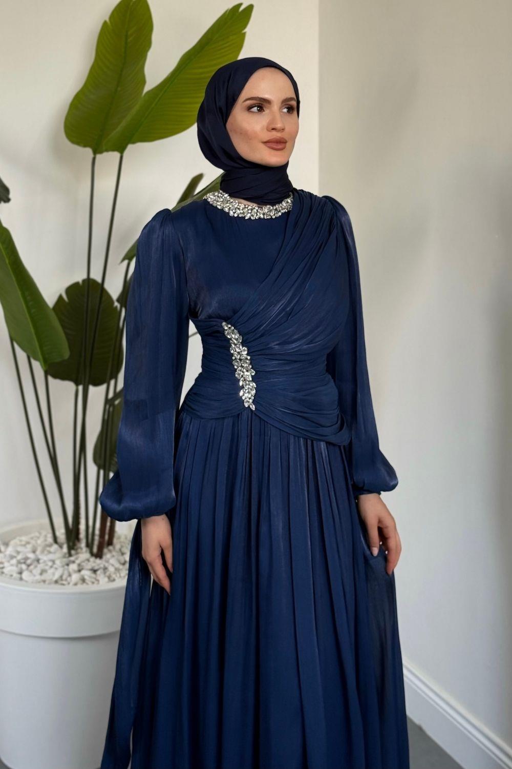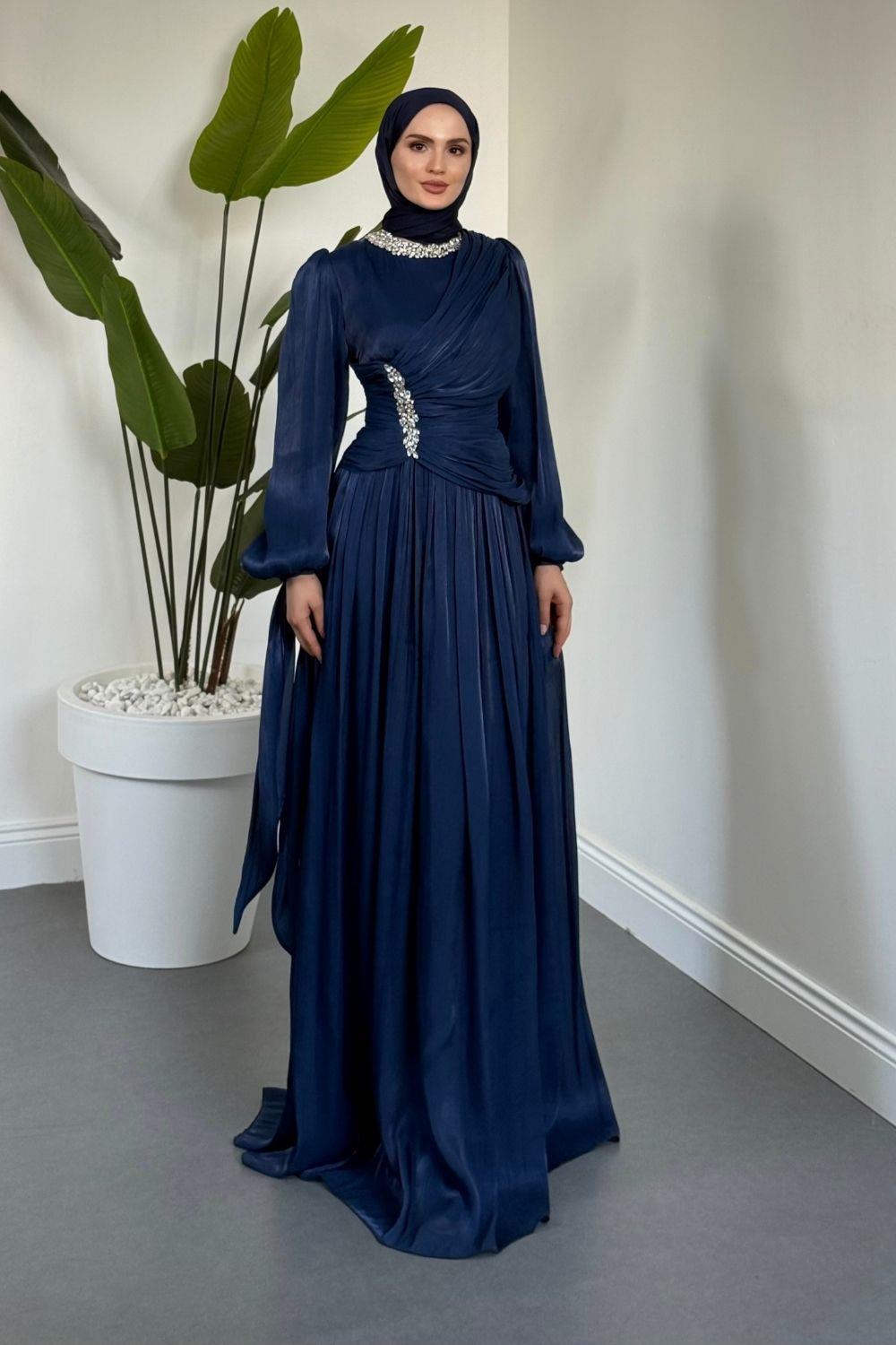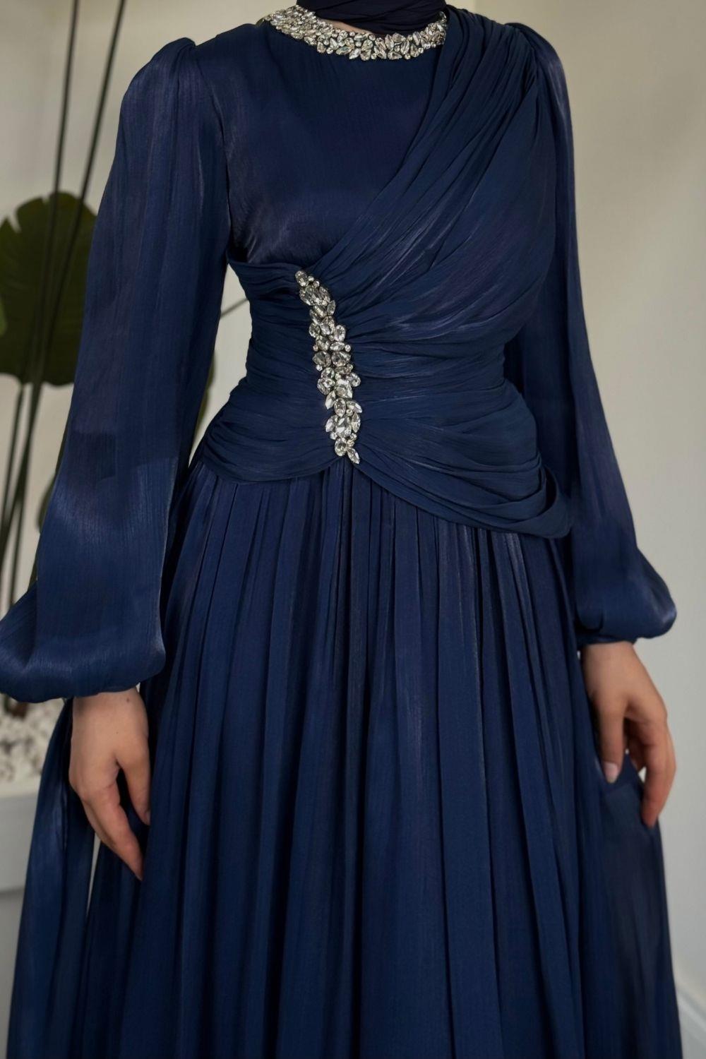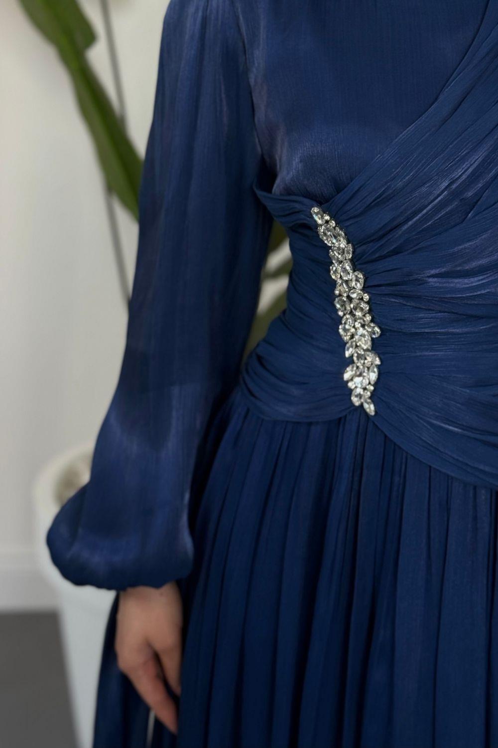 Corlie Beli Taşlı Drapeli Jan Jan Abiye Lacivert