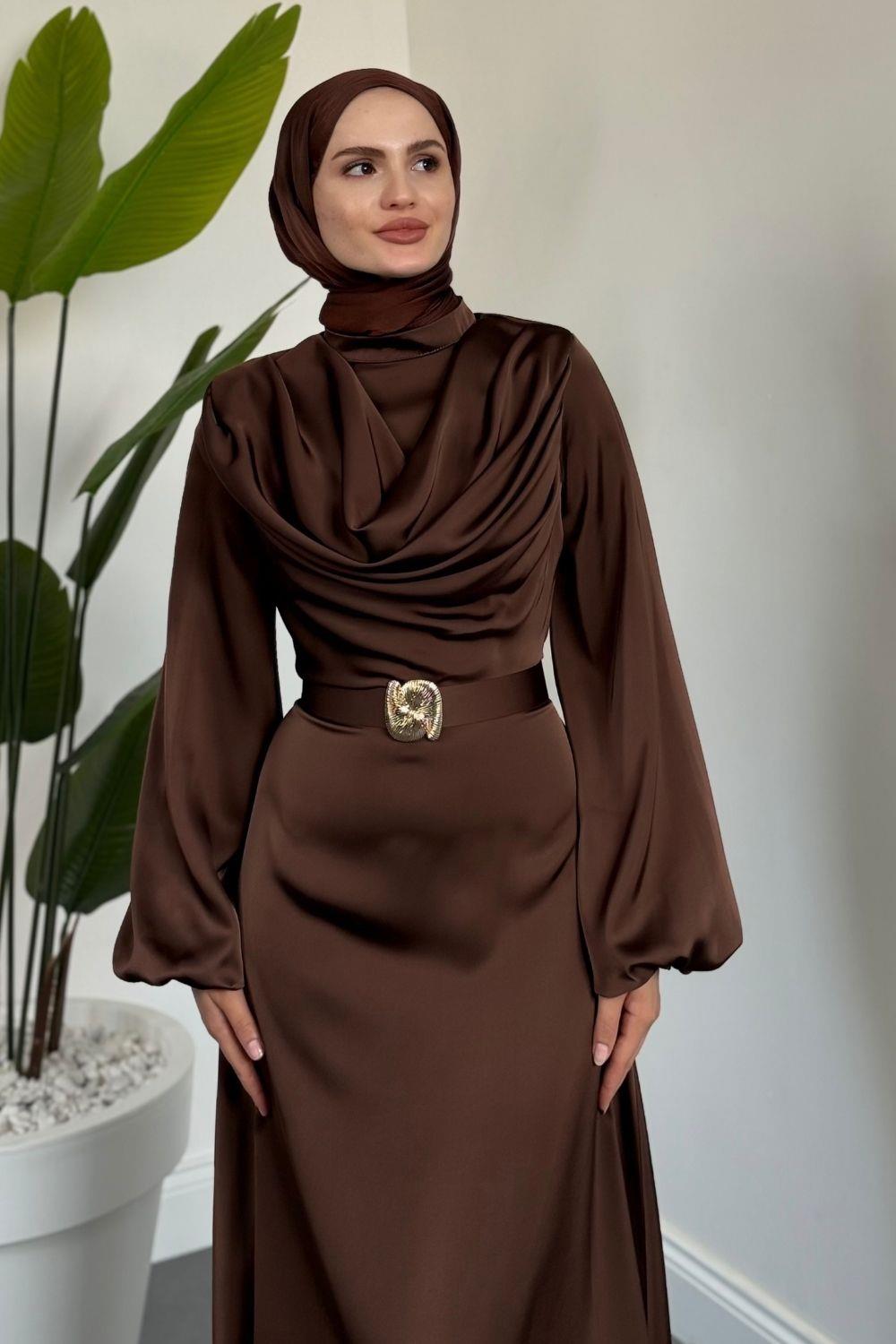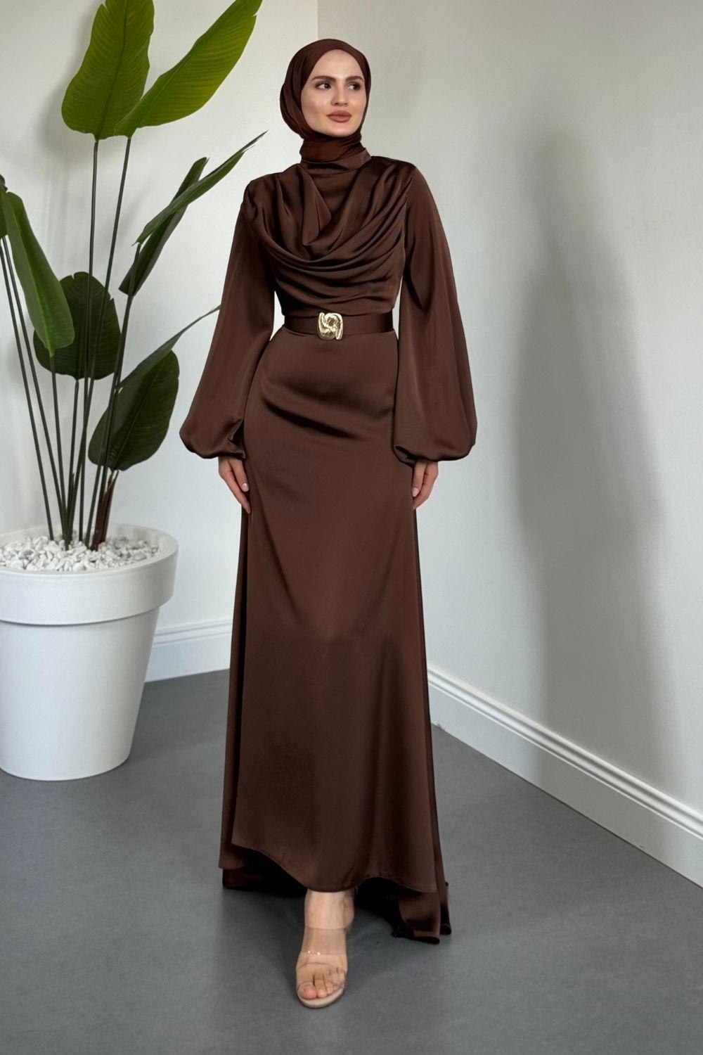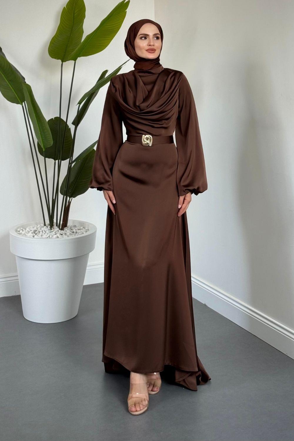 Merryna Kemerli Kuyruklu Saten Abiye Kahverengi