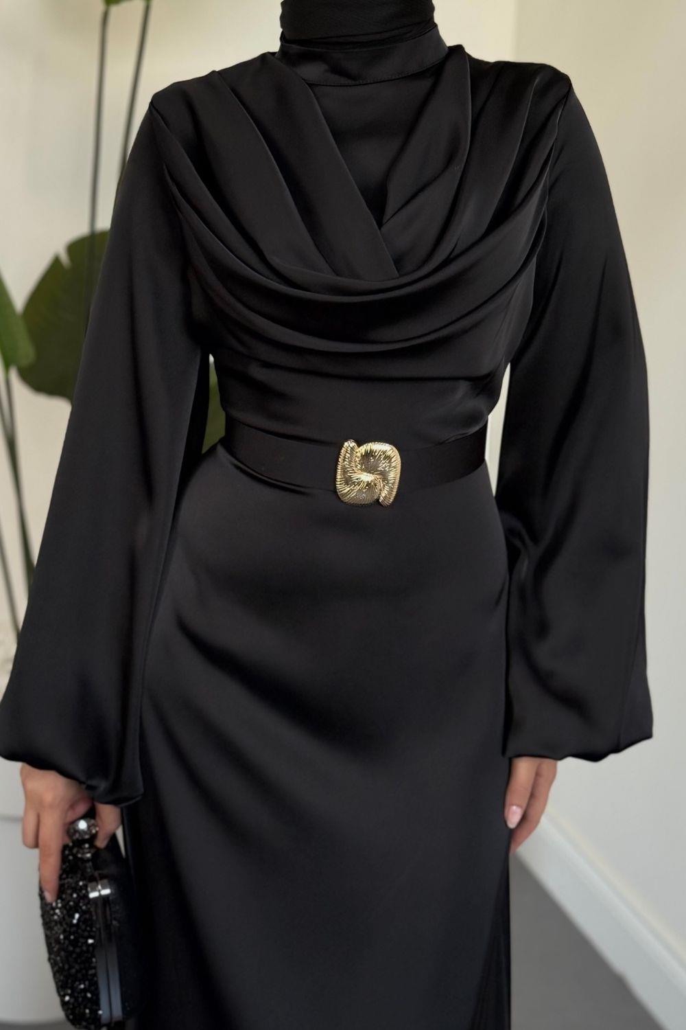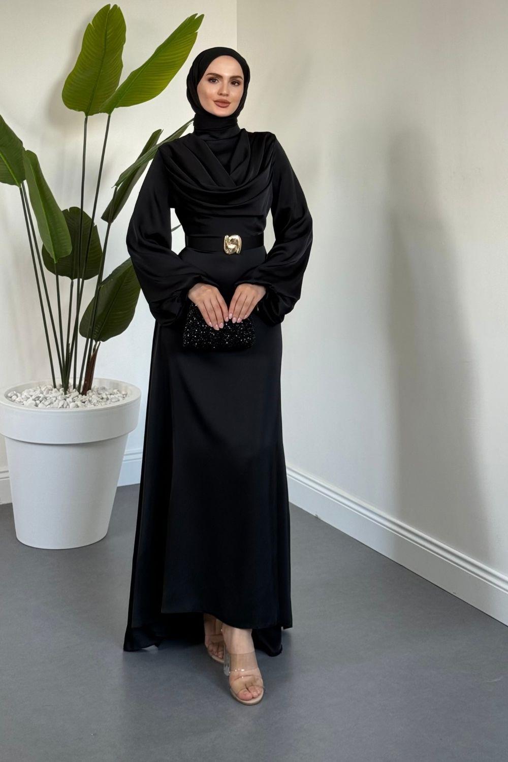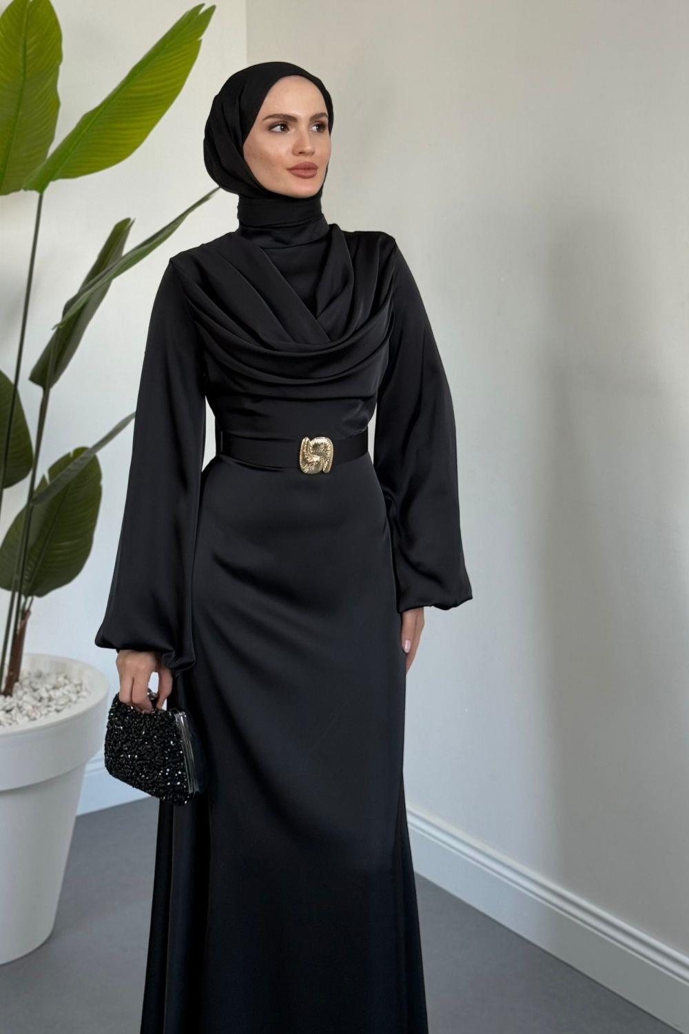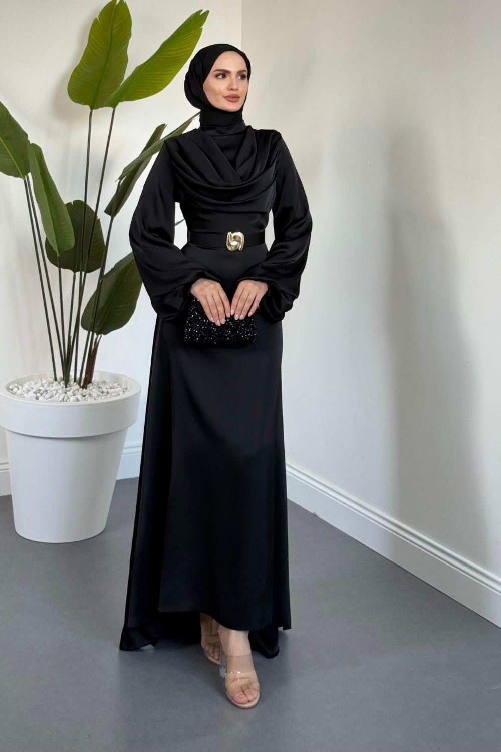 Merryna Kemerli Kuyruklu Saten Abiye Siyah