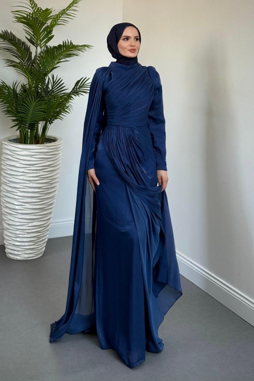 Rosalinne Tek Omuz Pelerinli Drapeli Jan Jan Abiye Lacivert