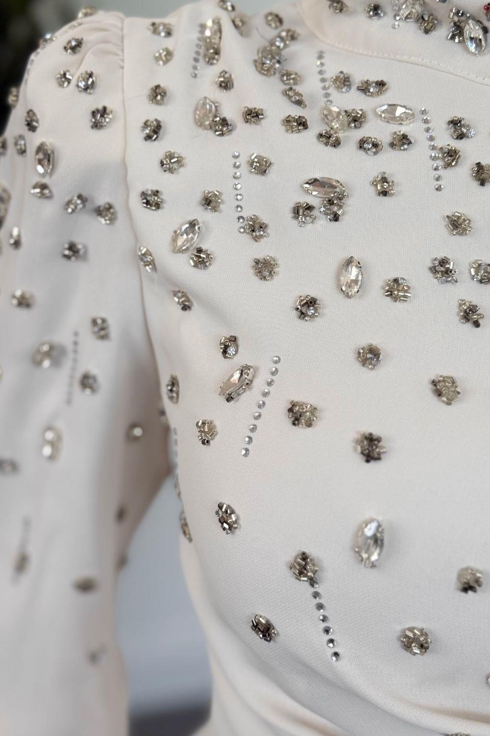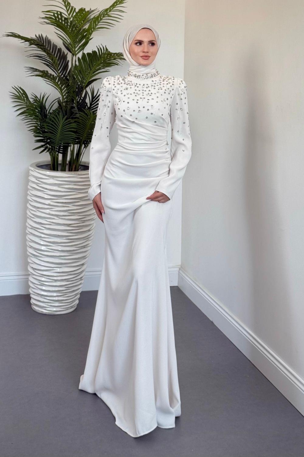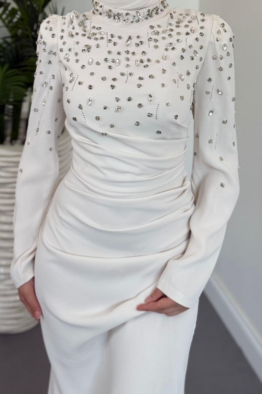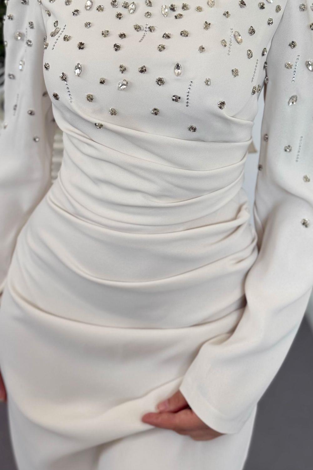 Lidya Taşlı Drapeli Balık Abiye Krem