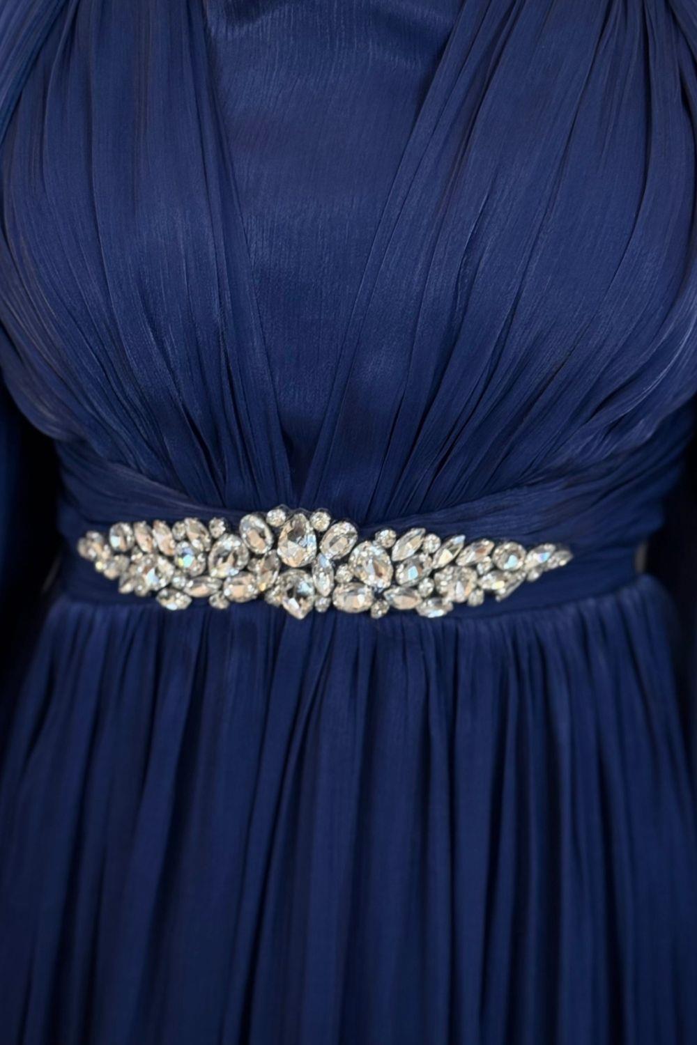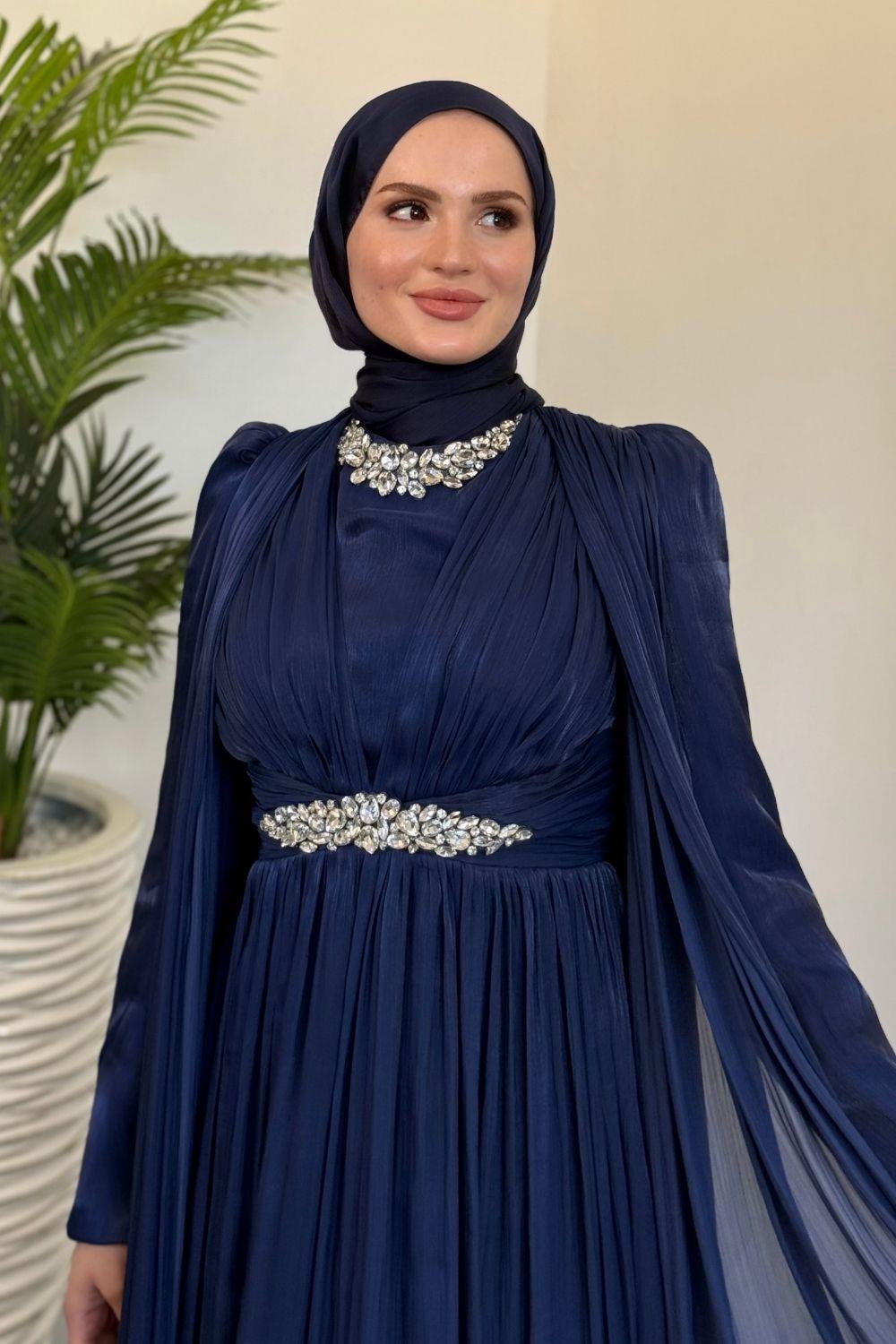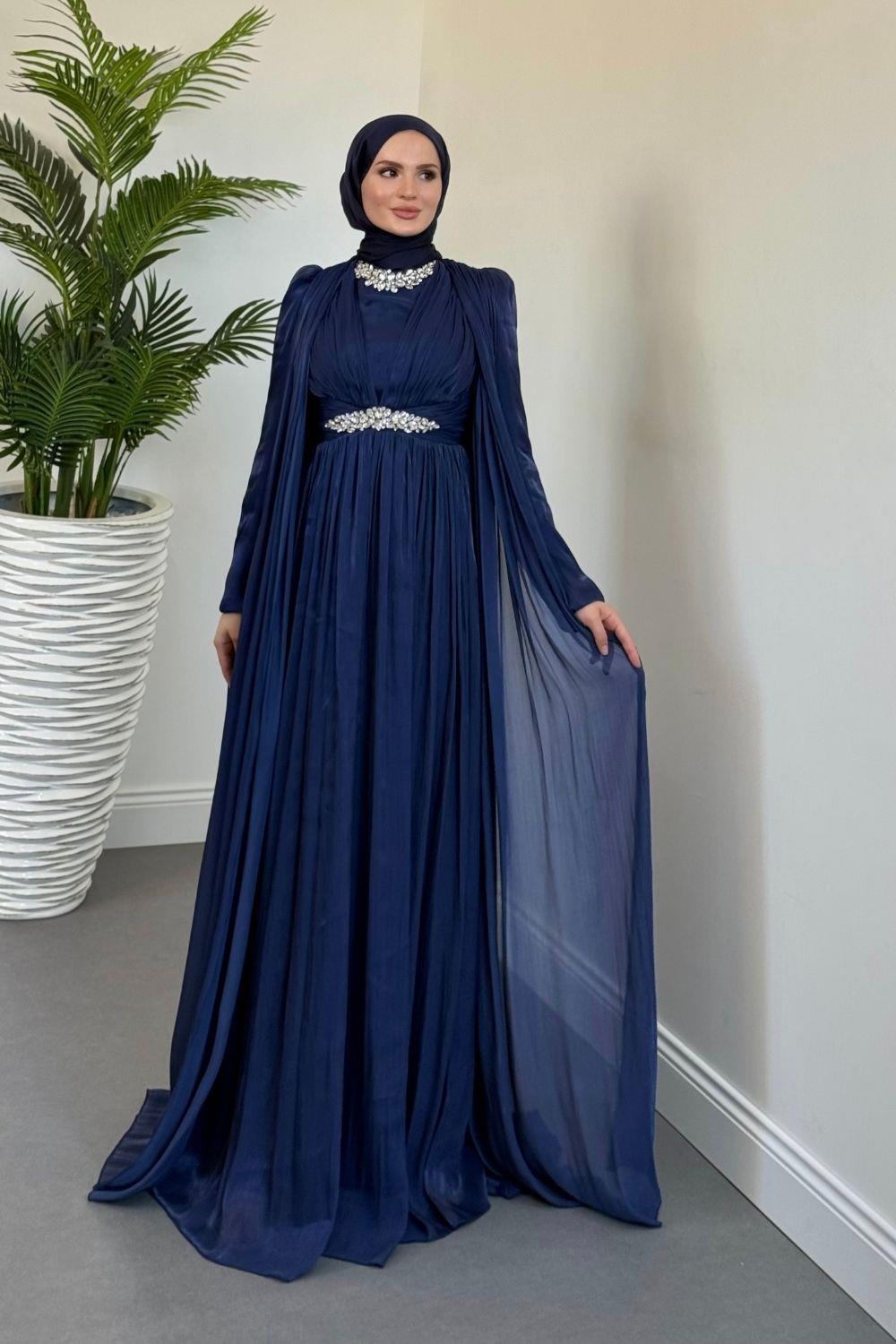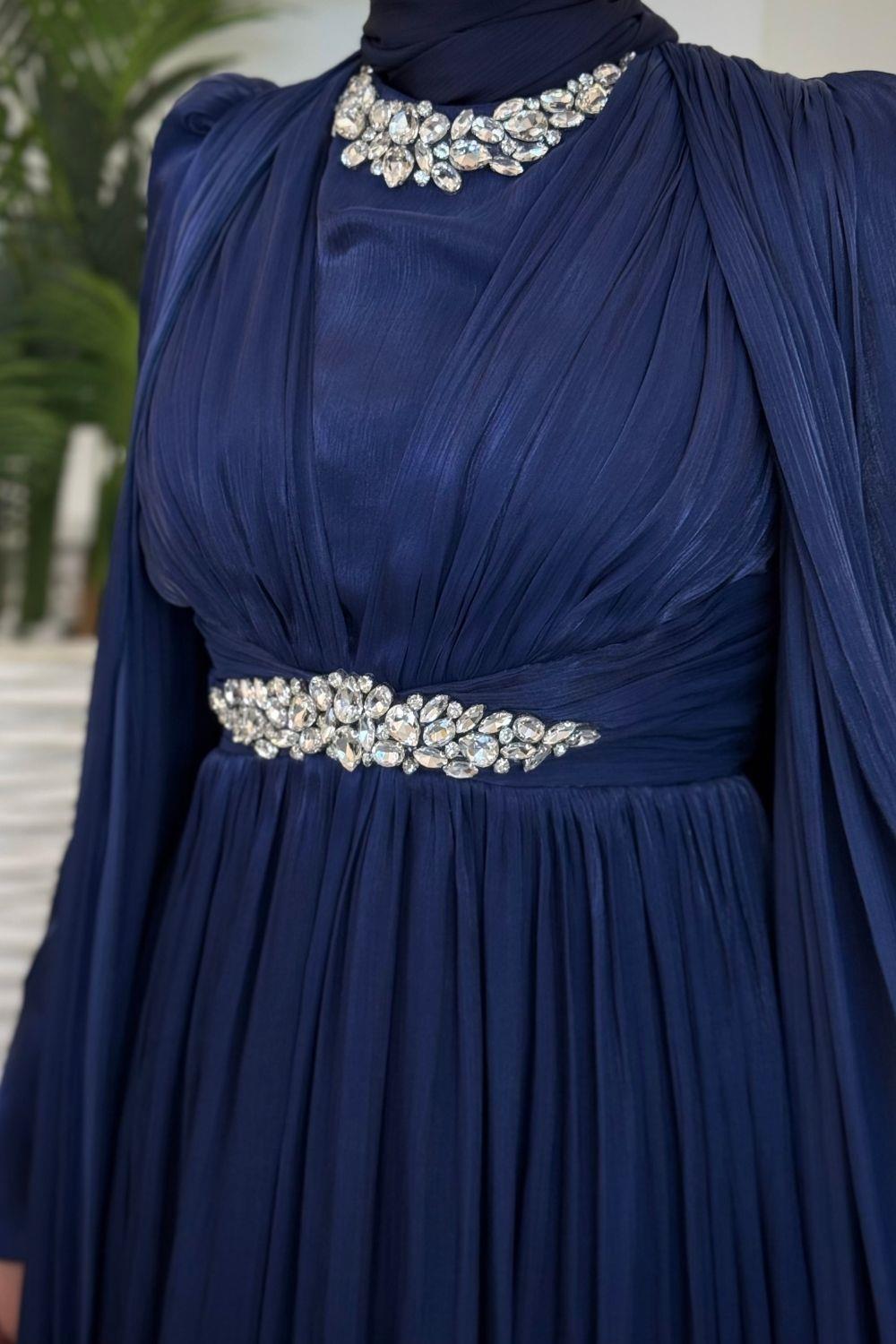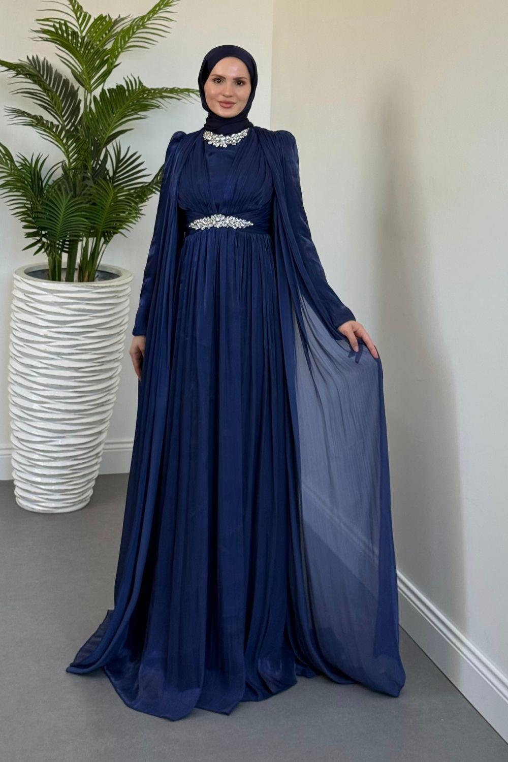 Solea Kolları Pelerinli Taşlı Abiye Lacivert