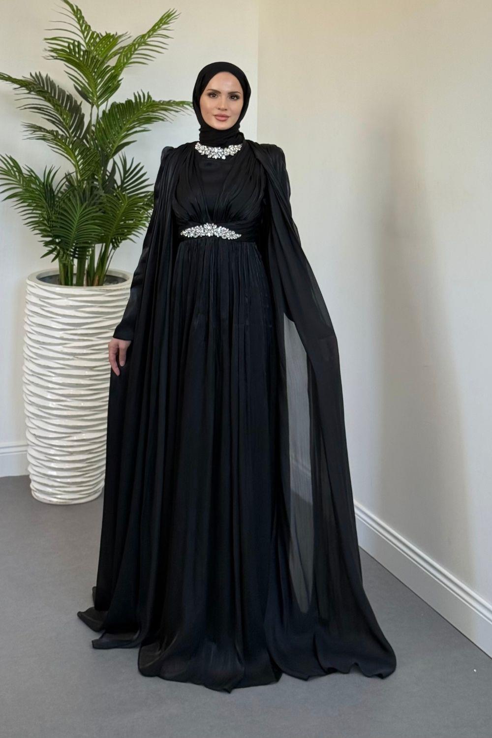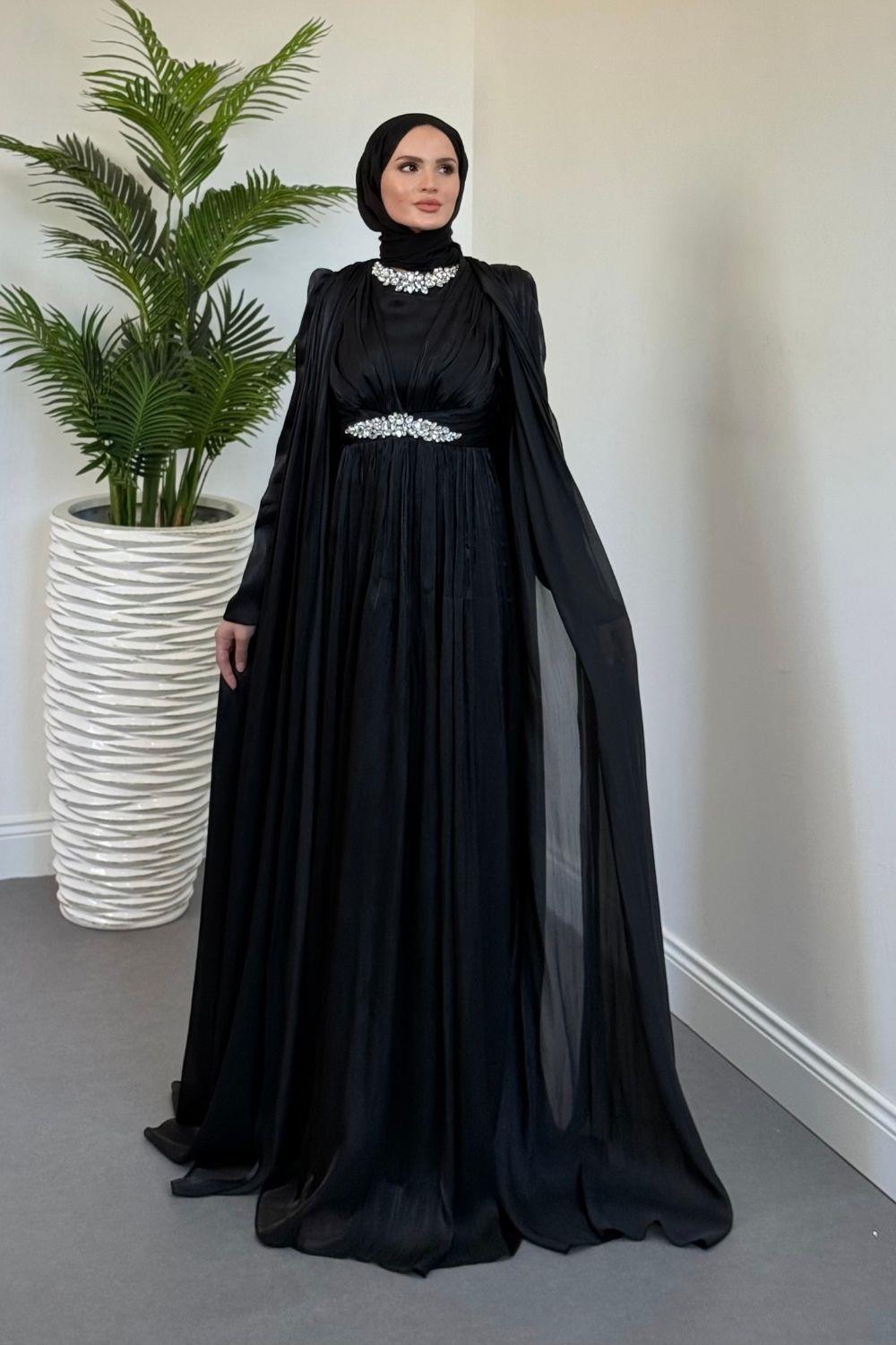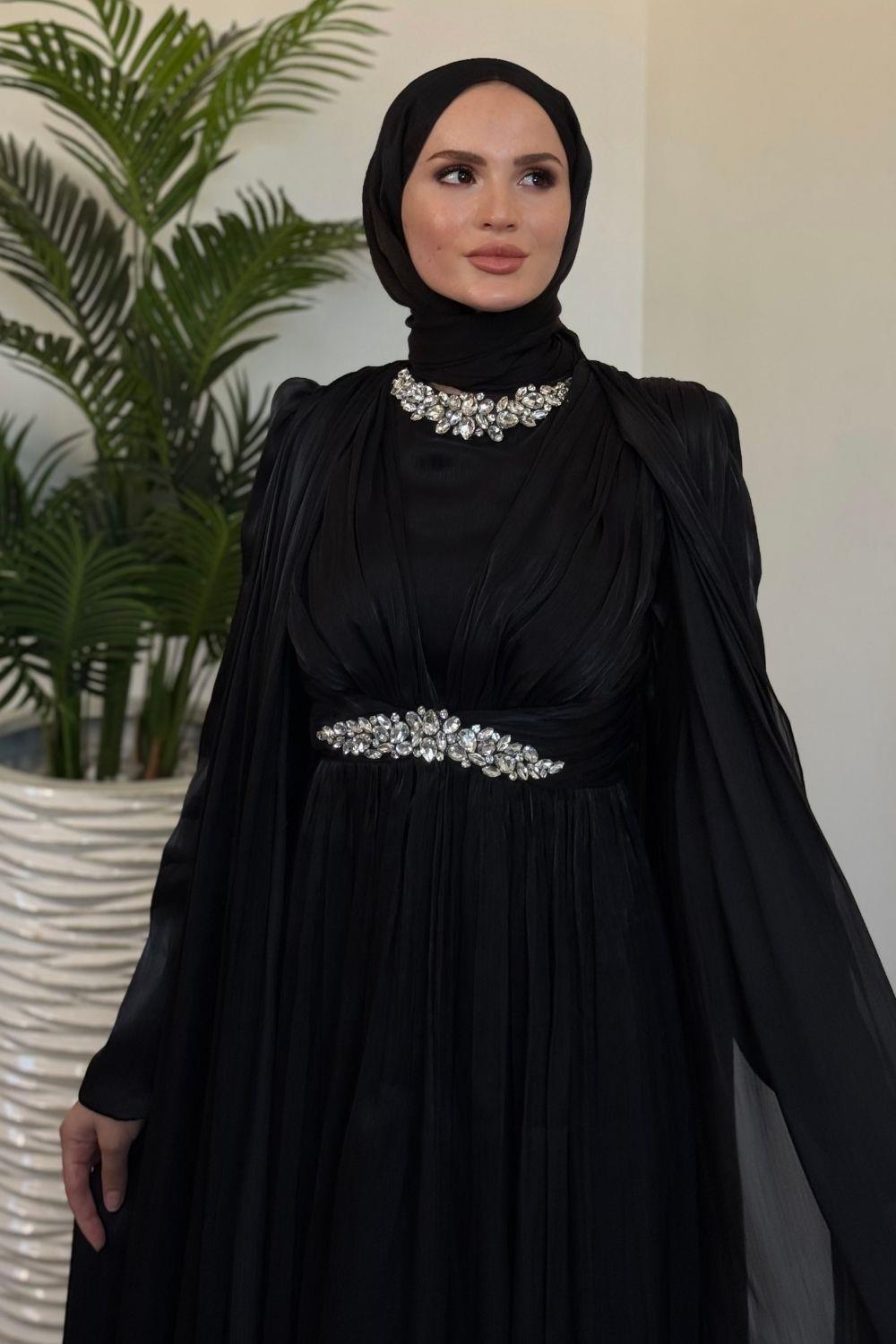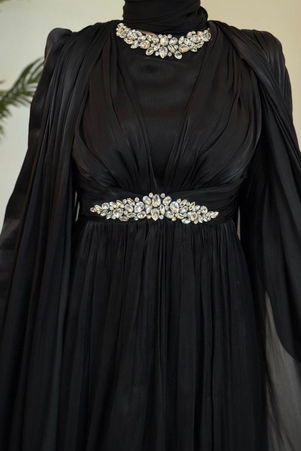 Solea Kolları Pelerinli Taşlı Abiye Siyah