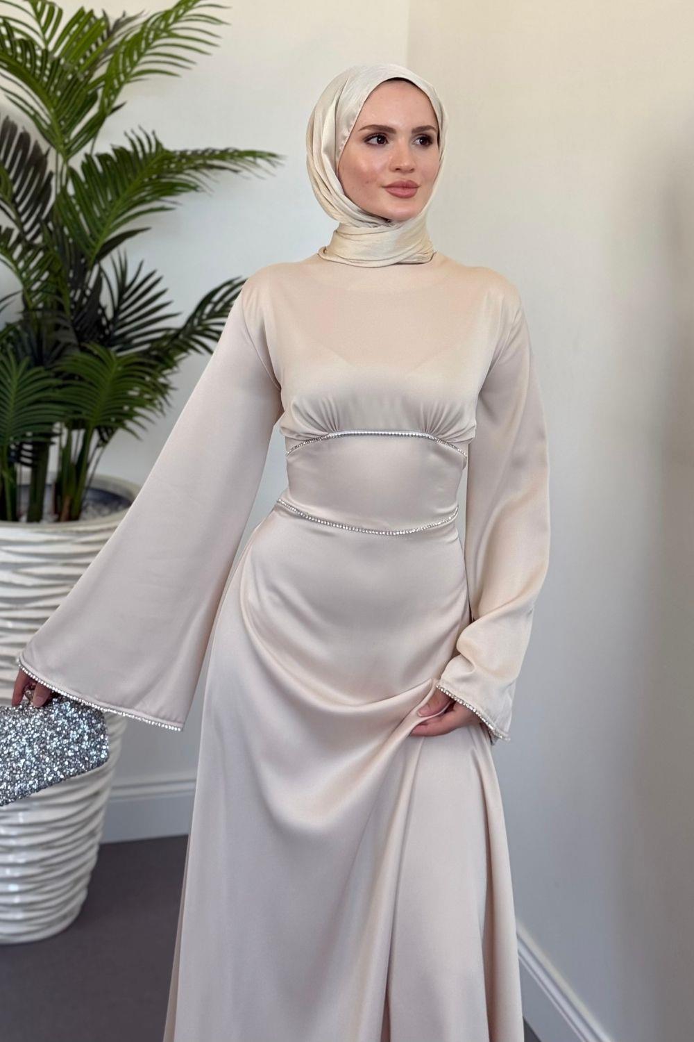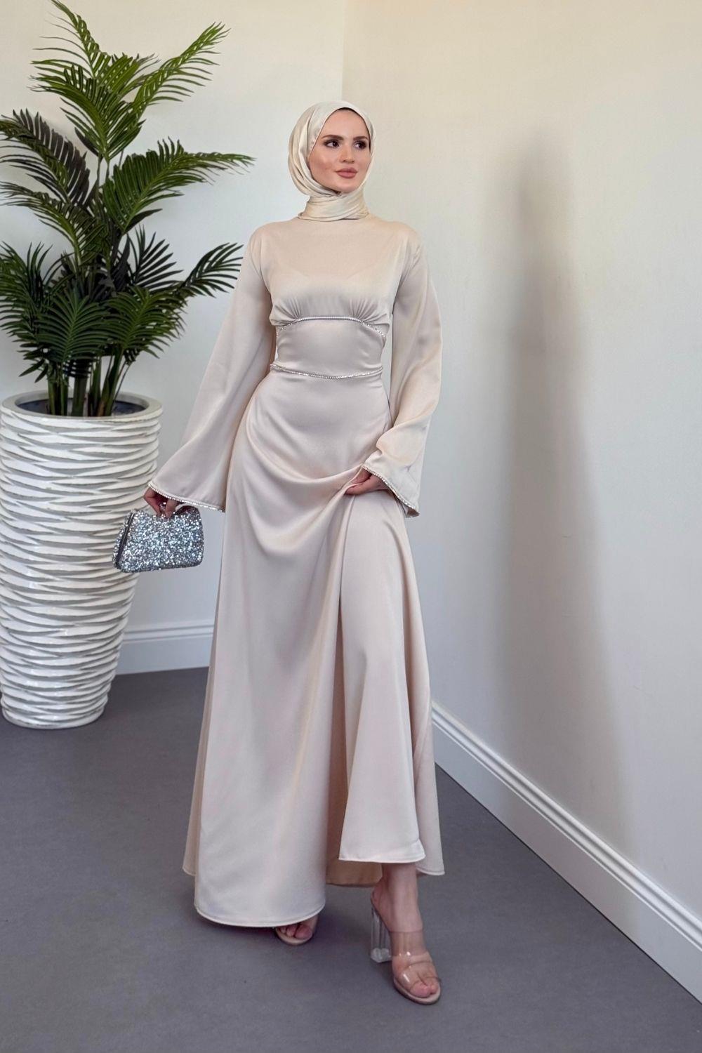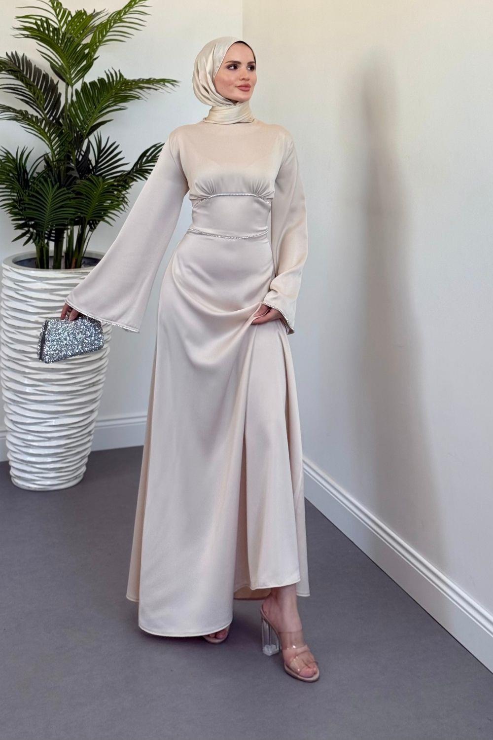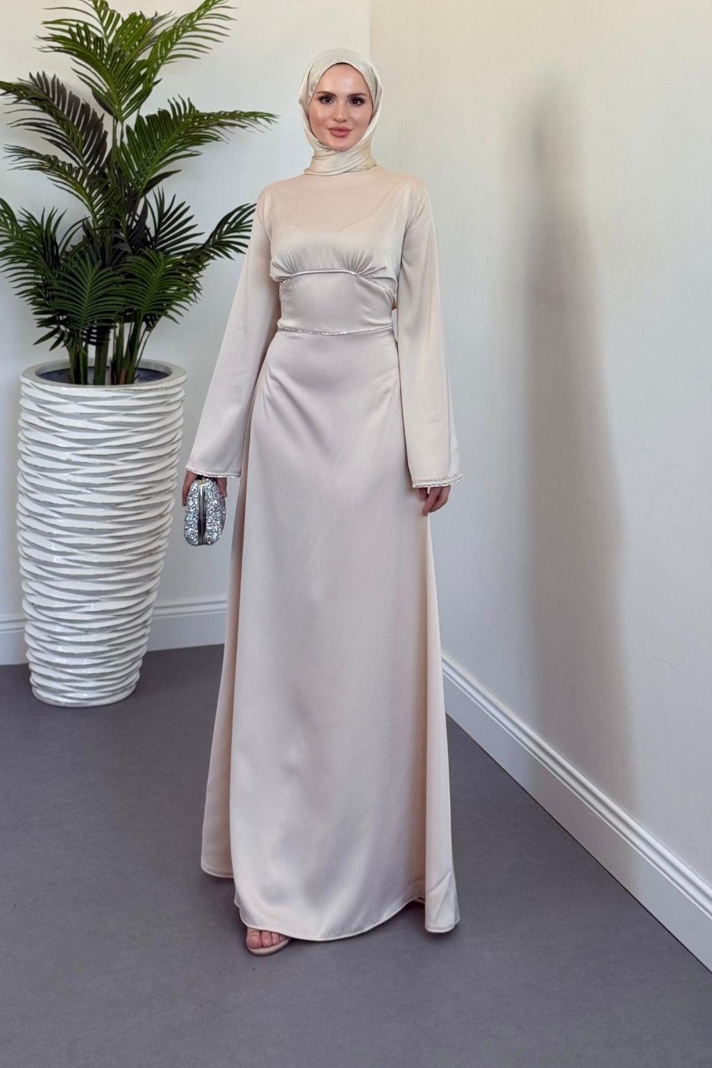 Vlasi Kolu Ve Beli Baget Taşlı Saten Abiye Krem