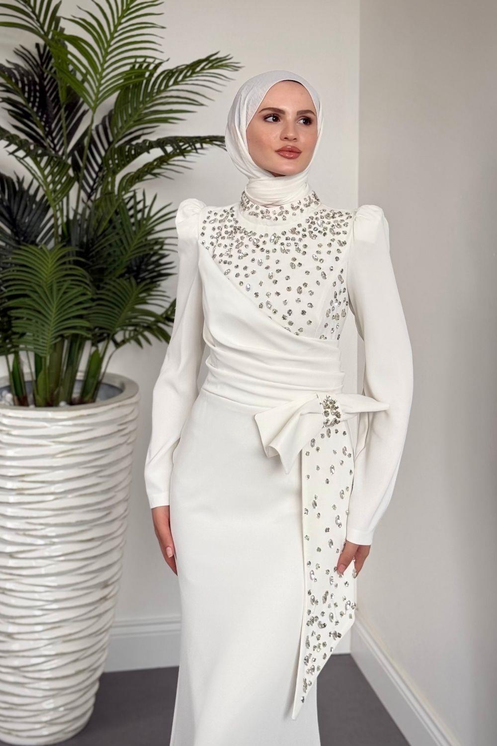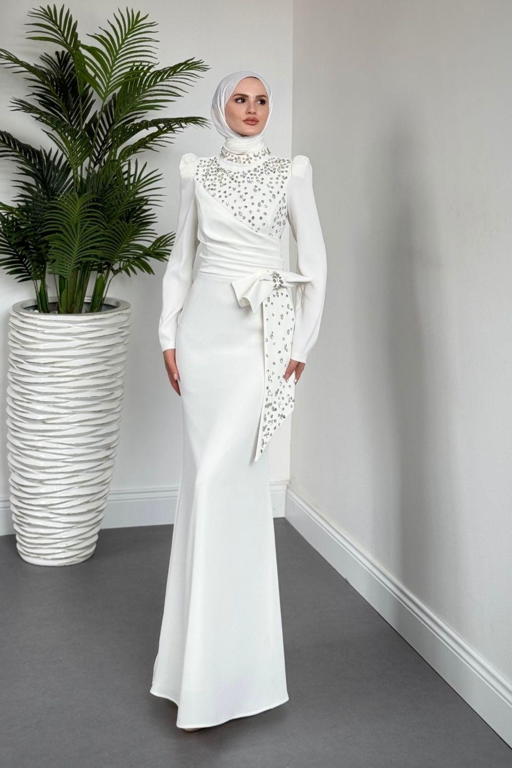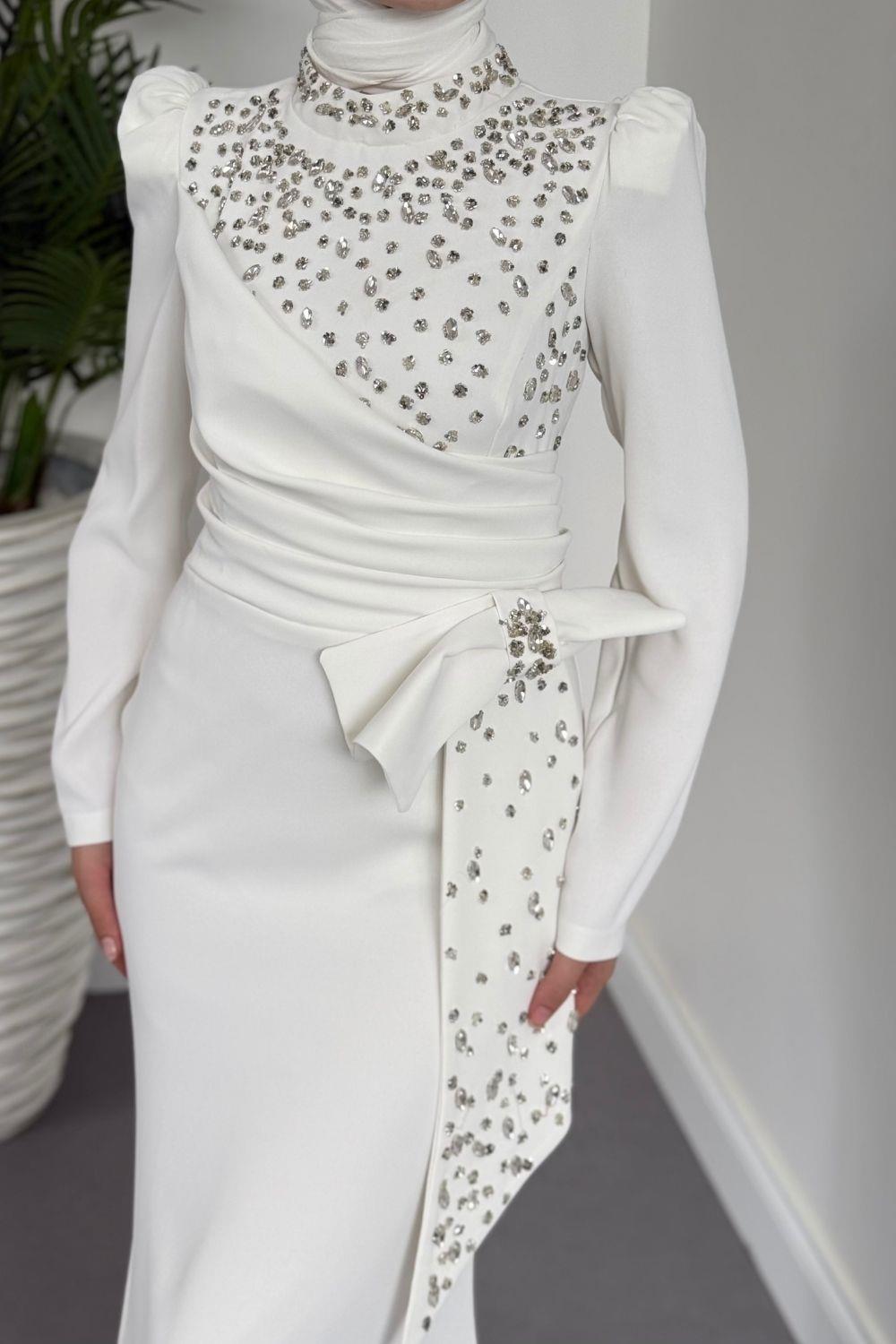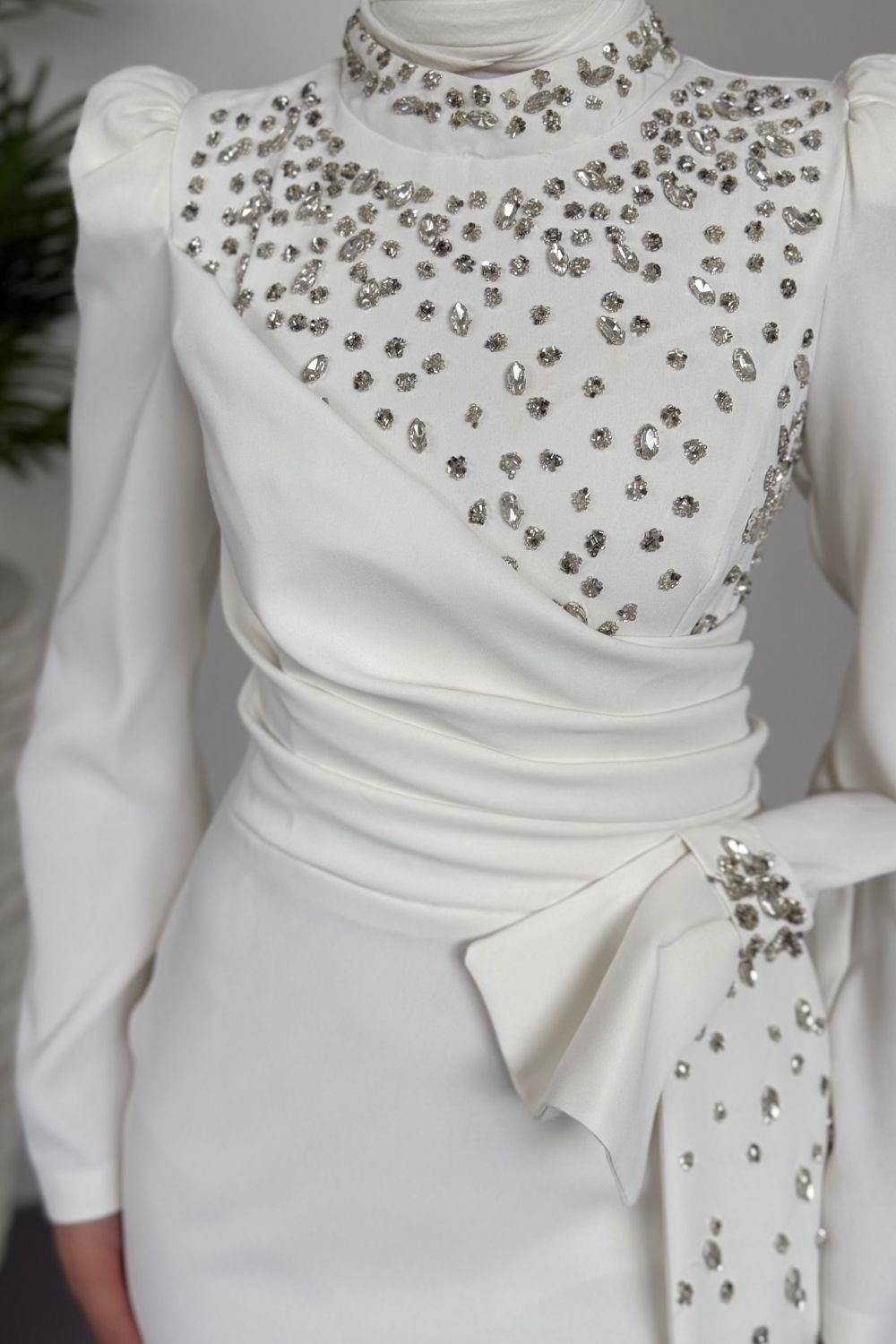 Lalissa Yandan Fiyonklu Taşlı Krep Abiye Beyaz