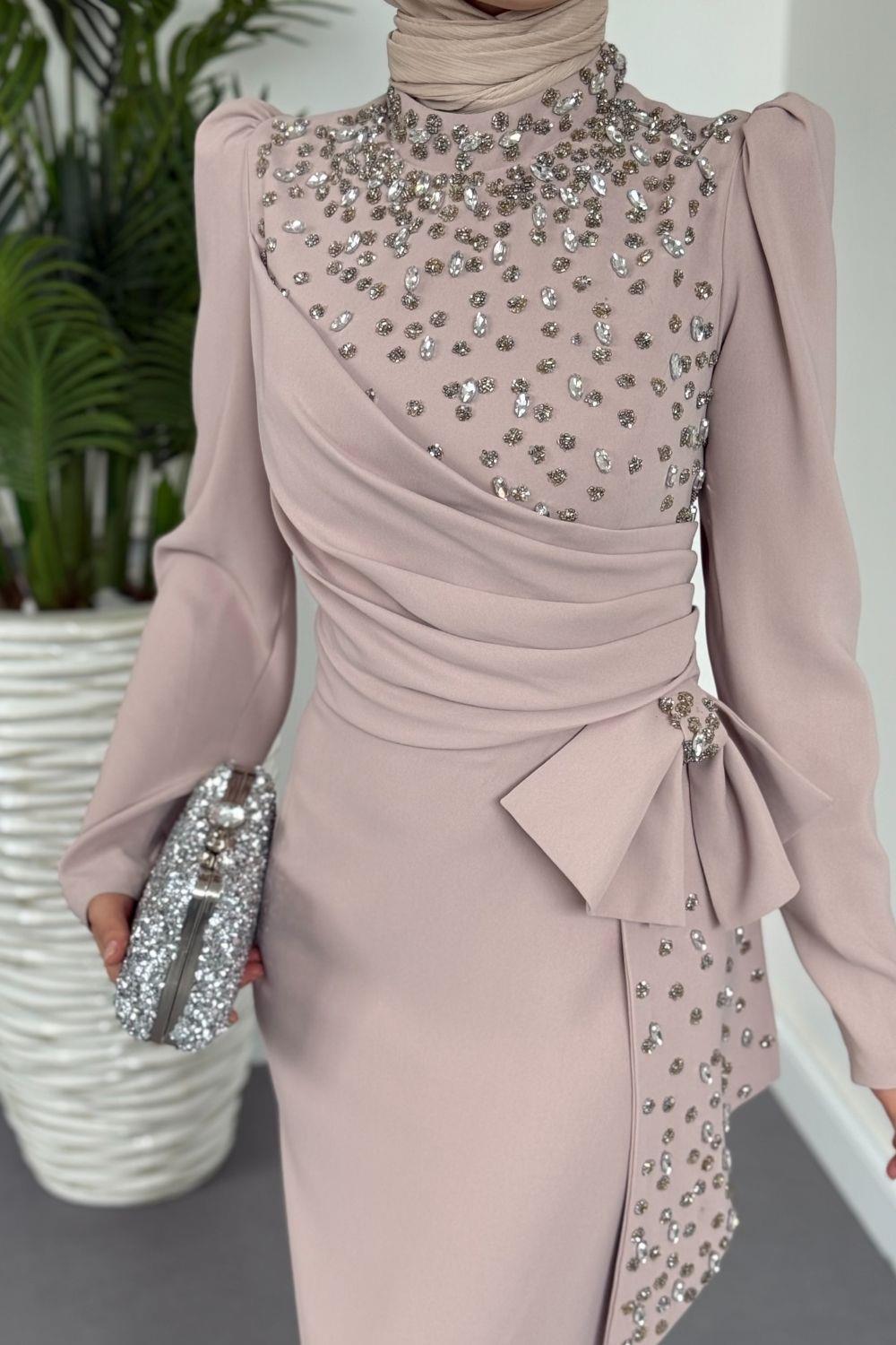 Lalissa Yandan Fiyonklu Taşlı Krep Abiye Vizon