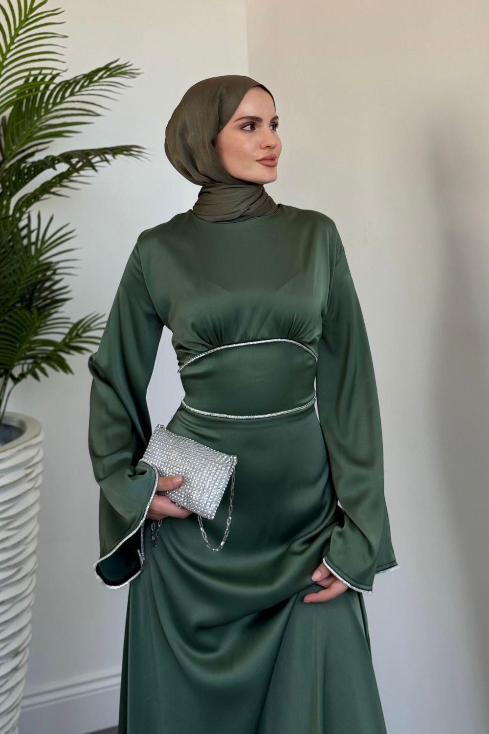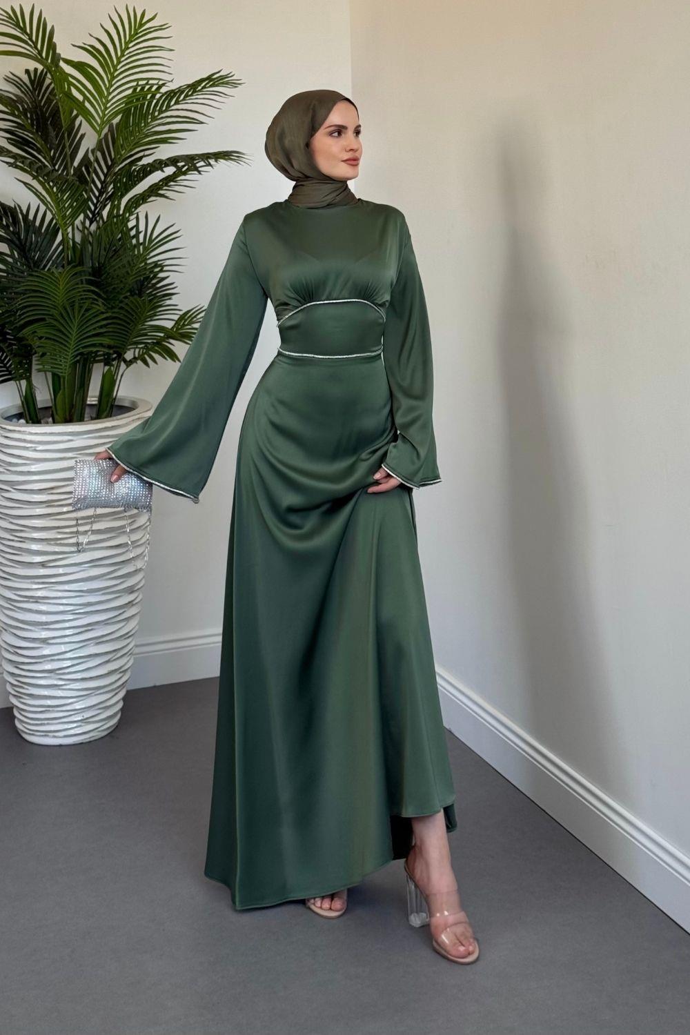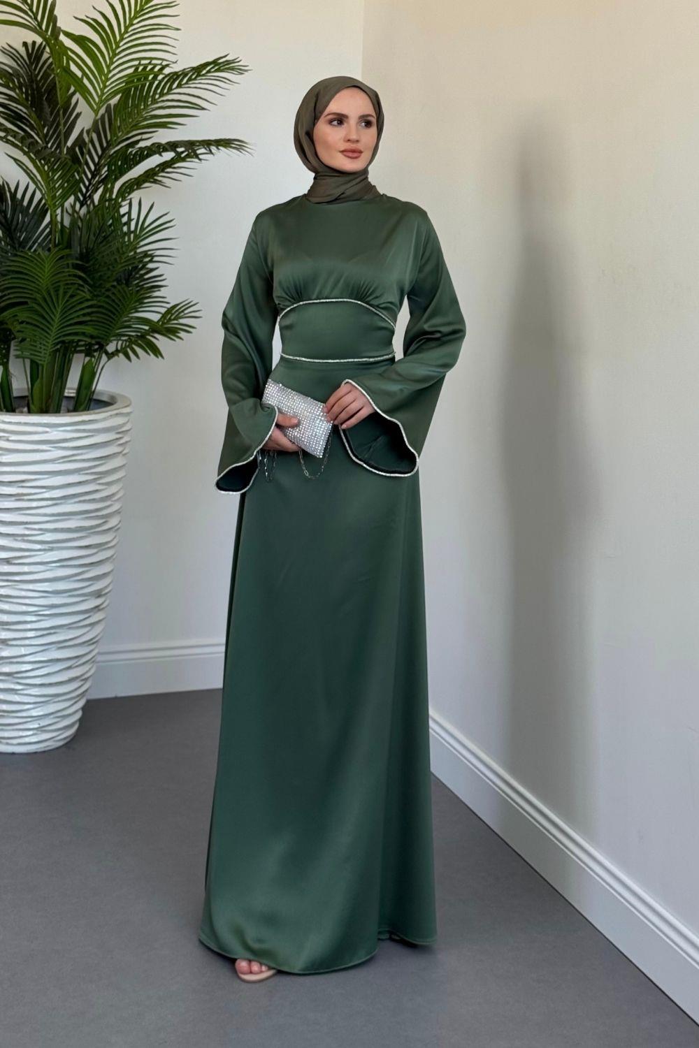 Vlasi Kolu Ve Beli Baget Taşlı Saten Abiye Yeşil