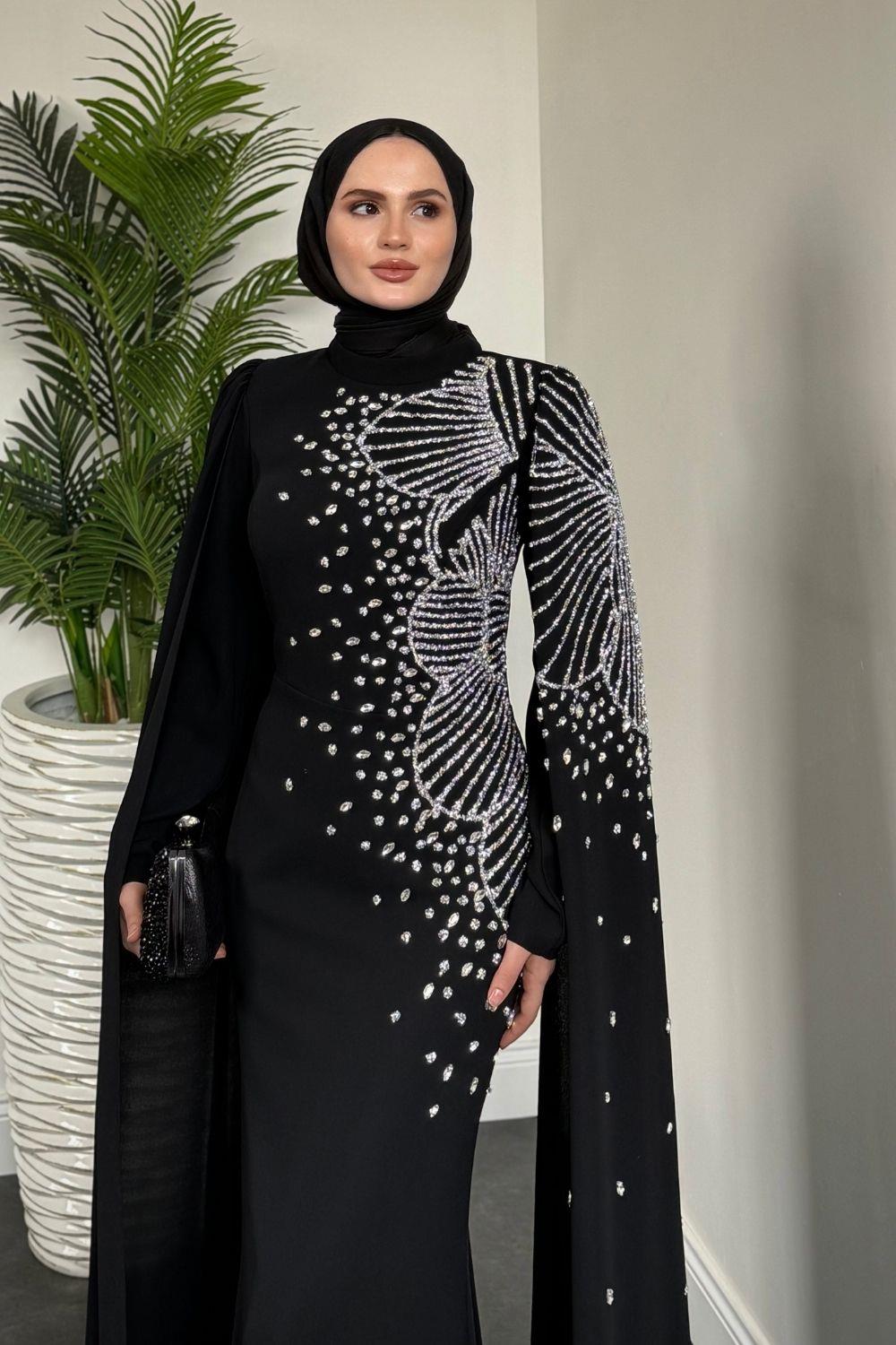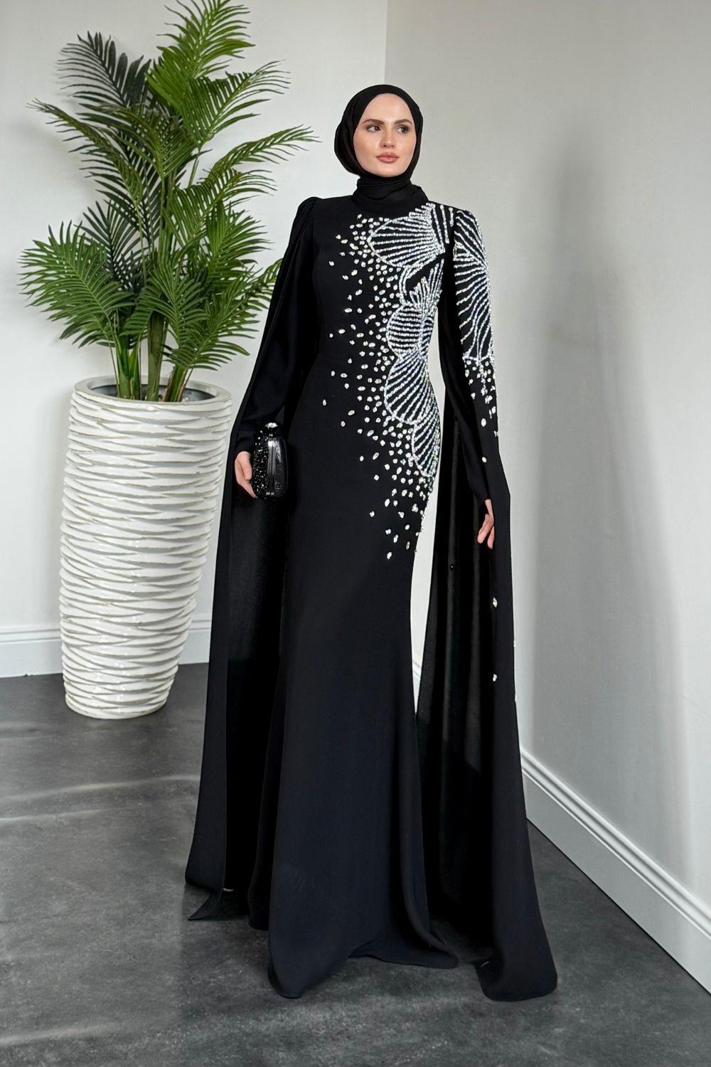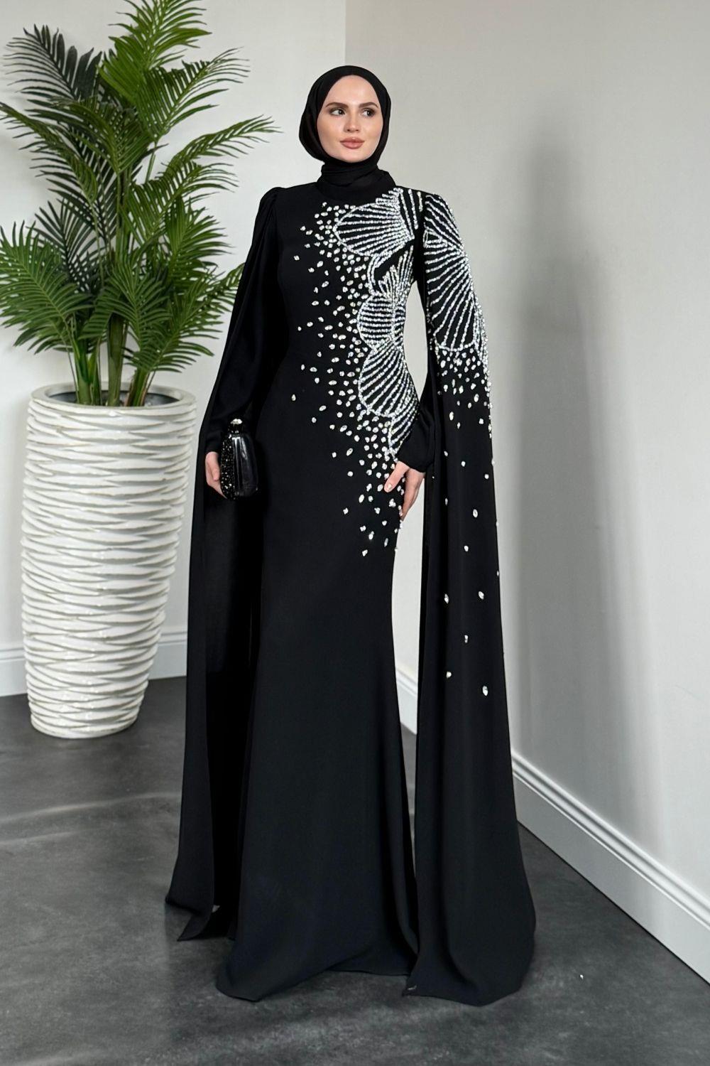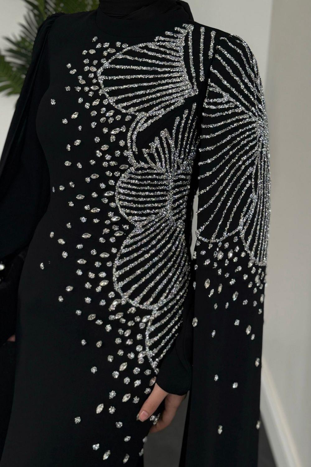 Carla Yandan Taşlı Abiye Siyah