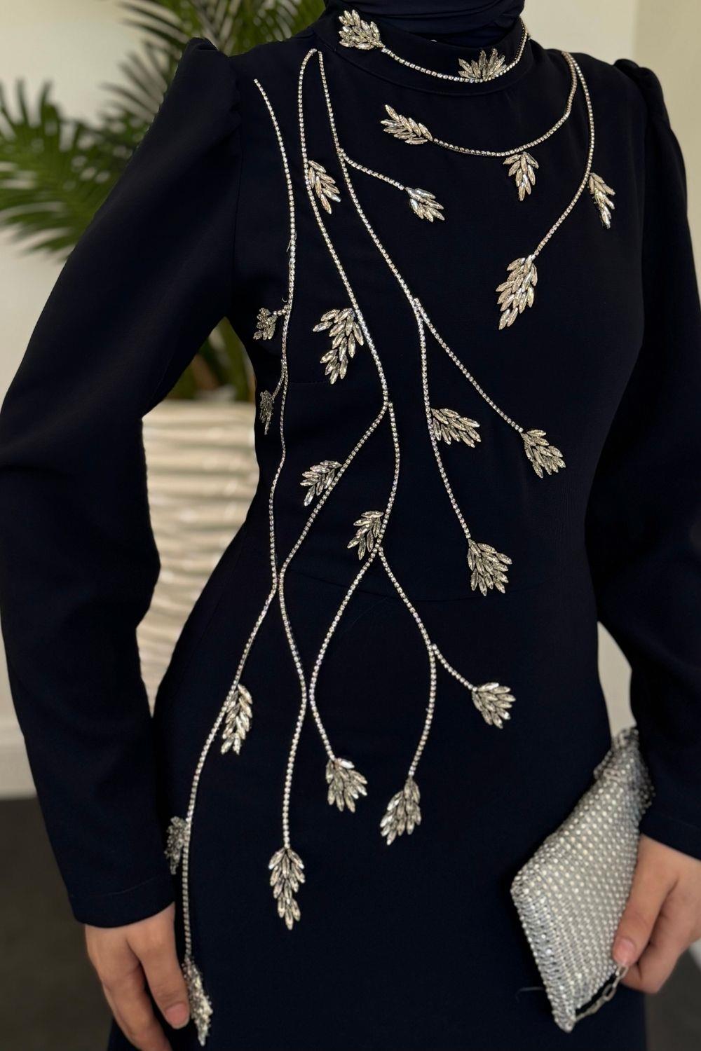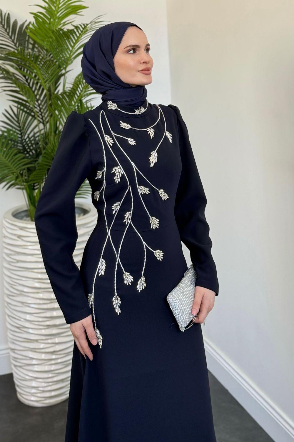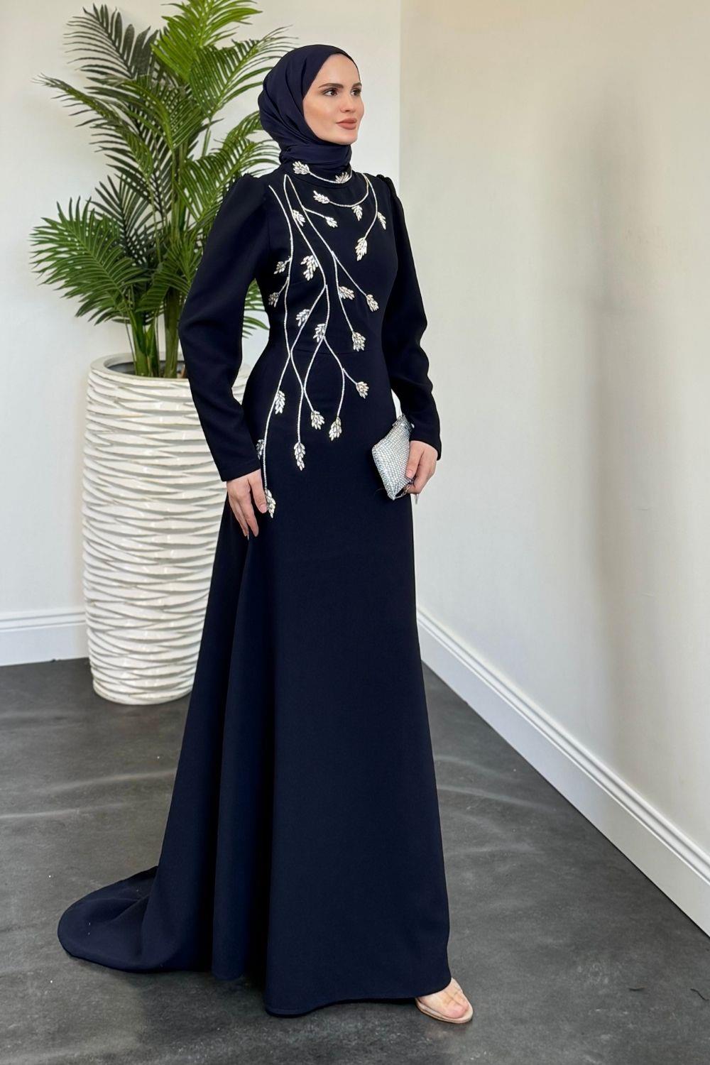 Arinya Yandan Taşlı Kuyruklu Abiye Lacivert