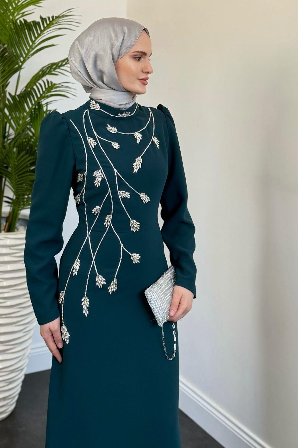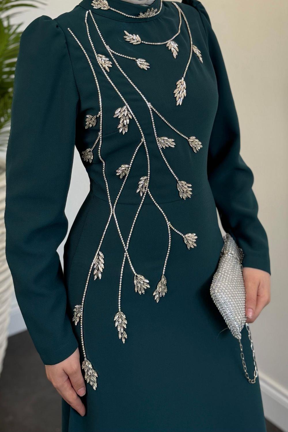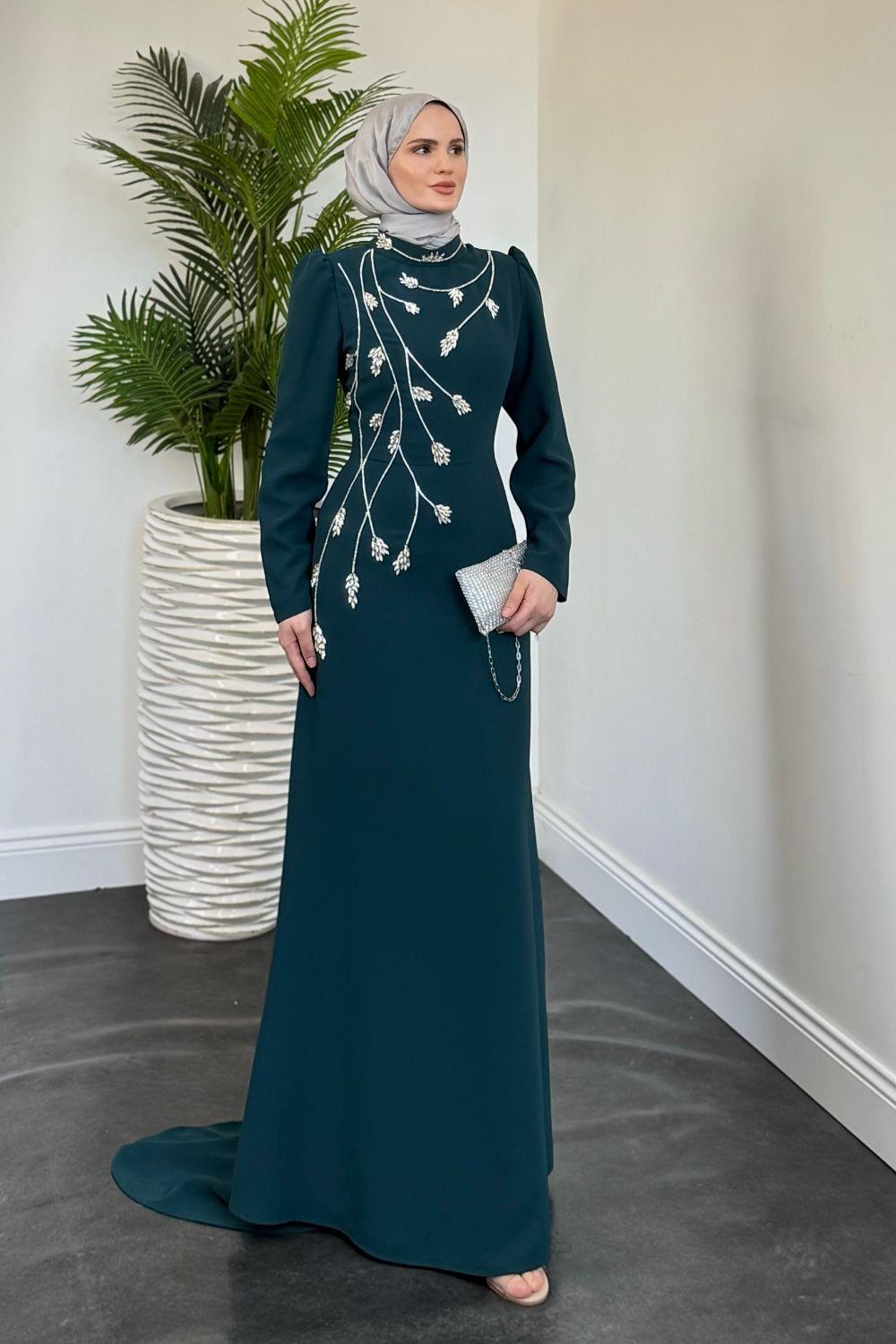 Arinya Yandan Taşlı Kuyruklu Abiye Petrol Yeşili