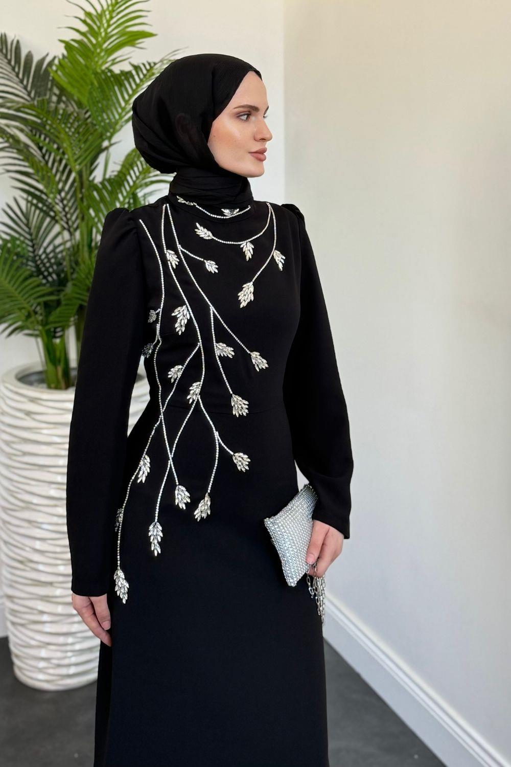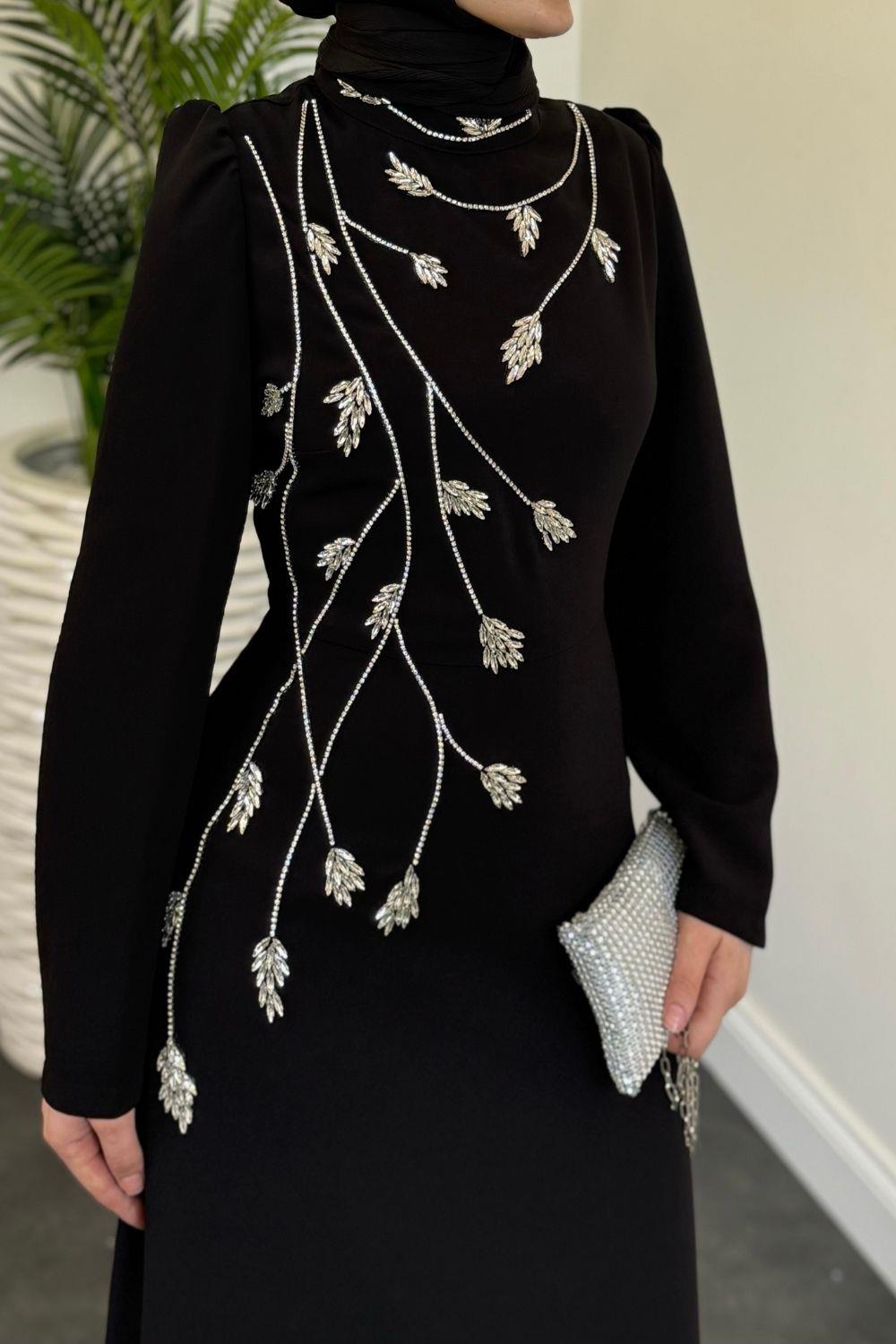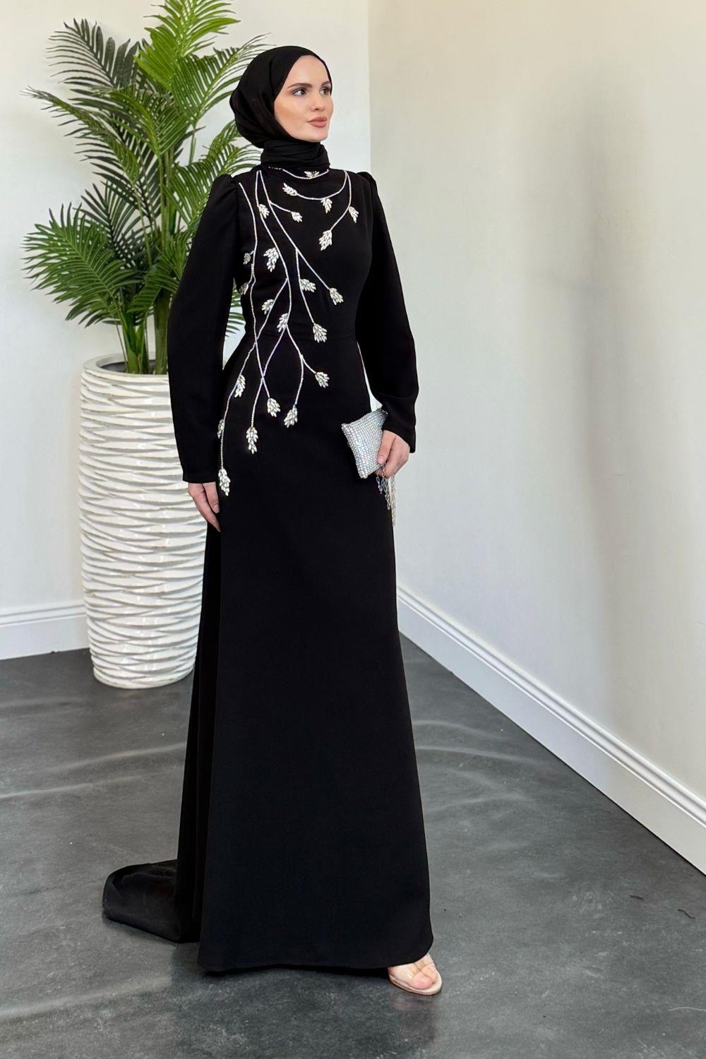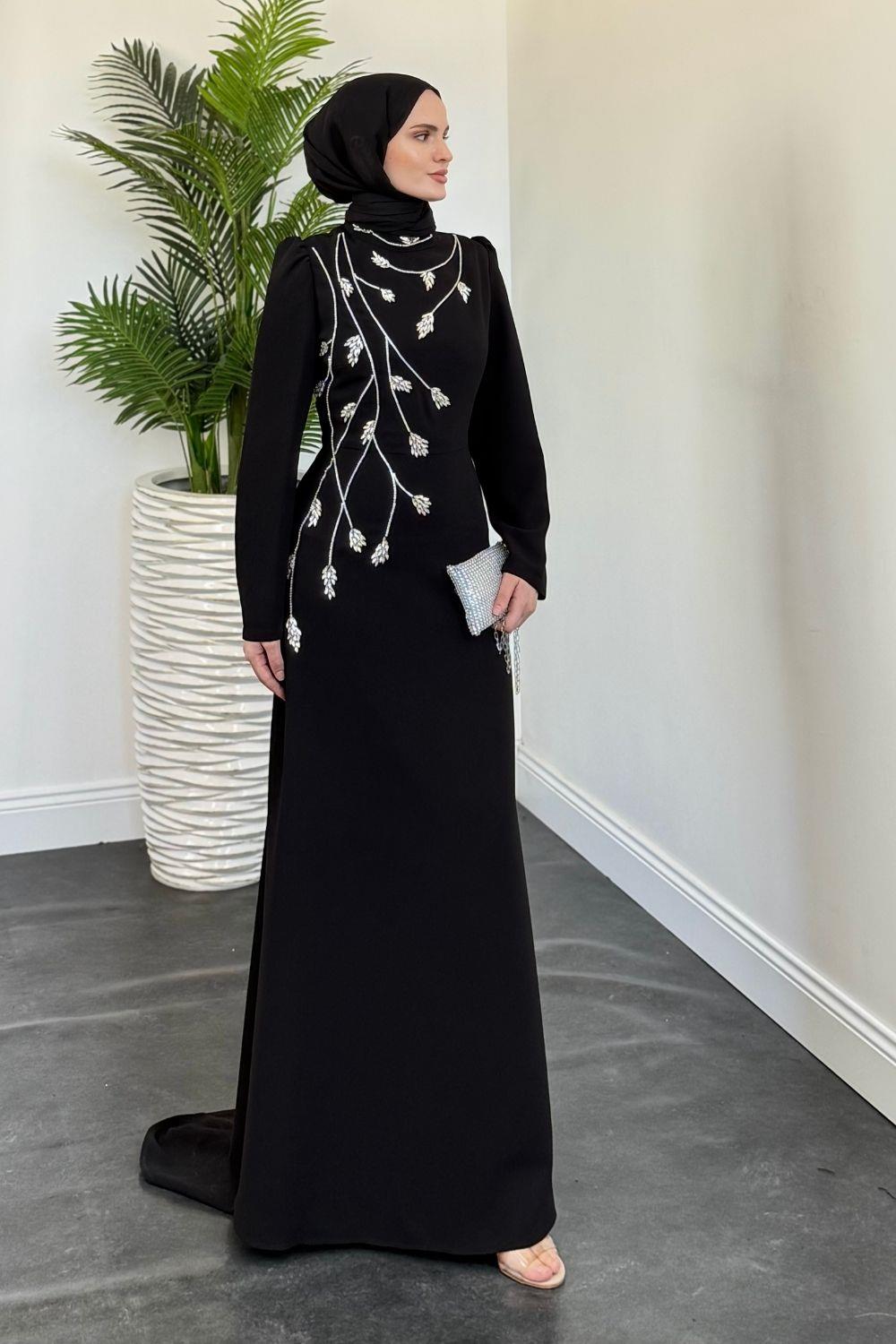 Arinya Yandan Taşlı Kuyruklu Abiye Siyah