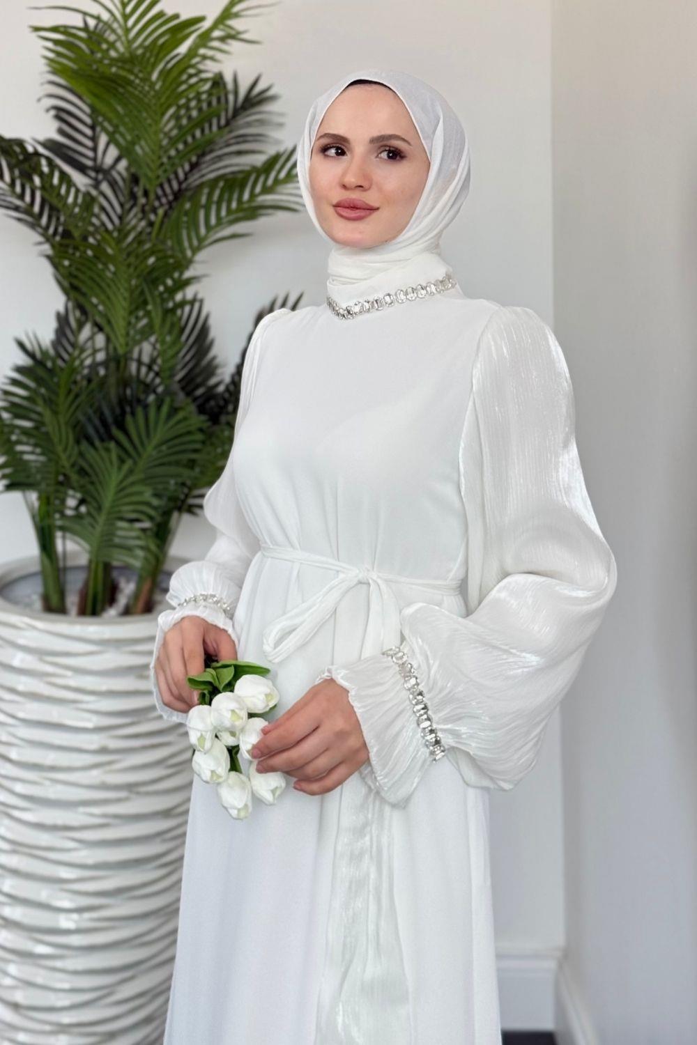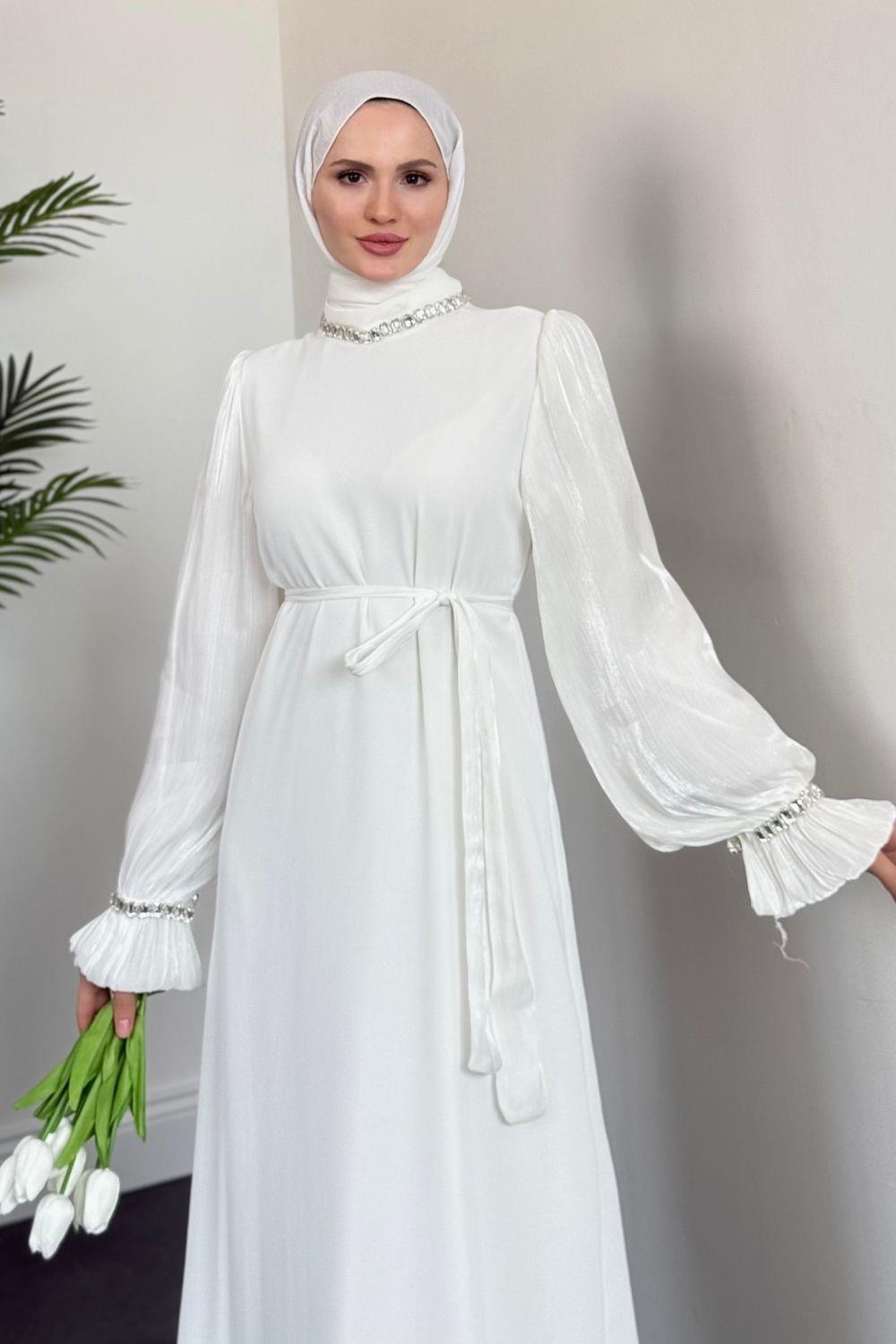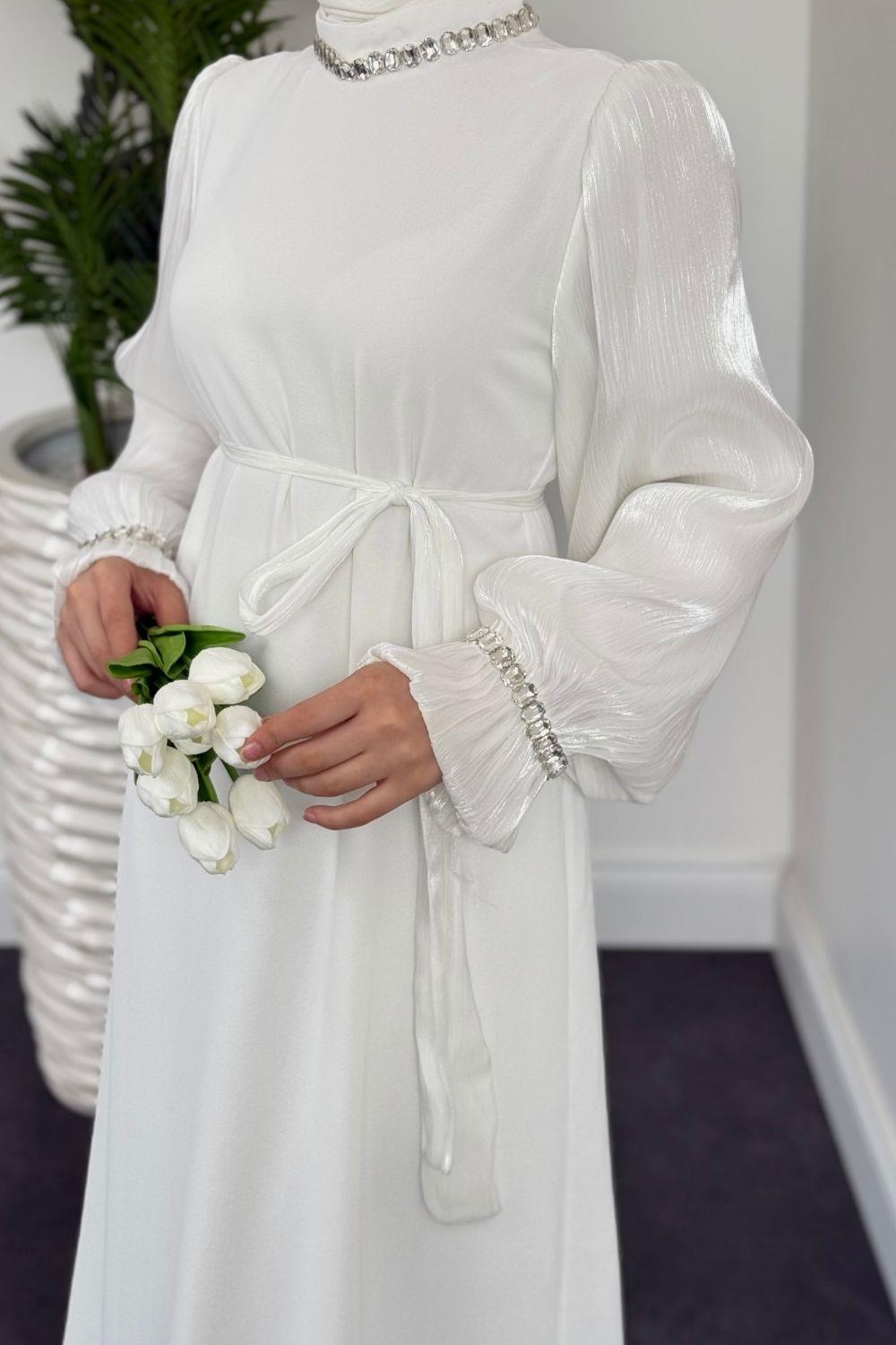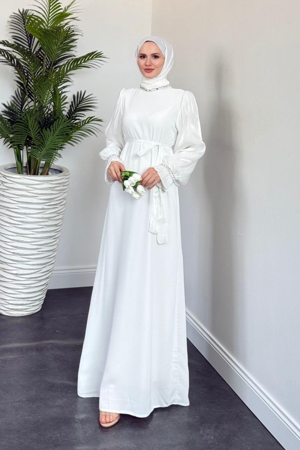 Anna Boynu ve Kolu Baget Taş İşlemeli Abiye Beyaz(KEMERSİZ)