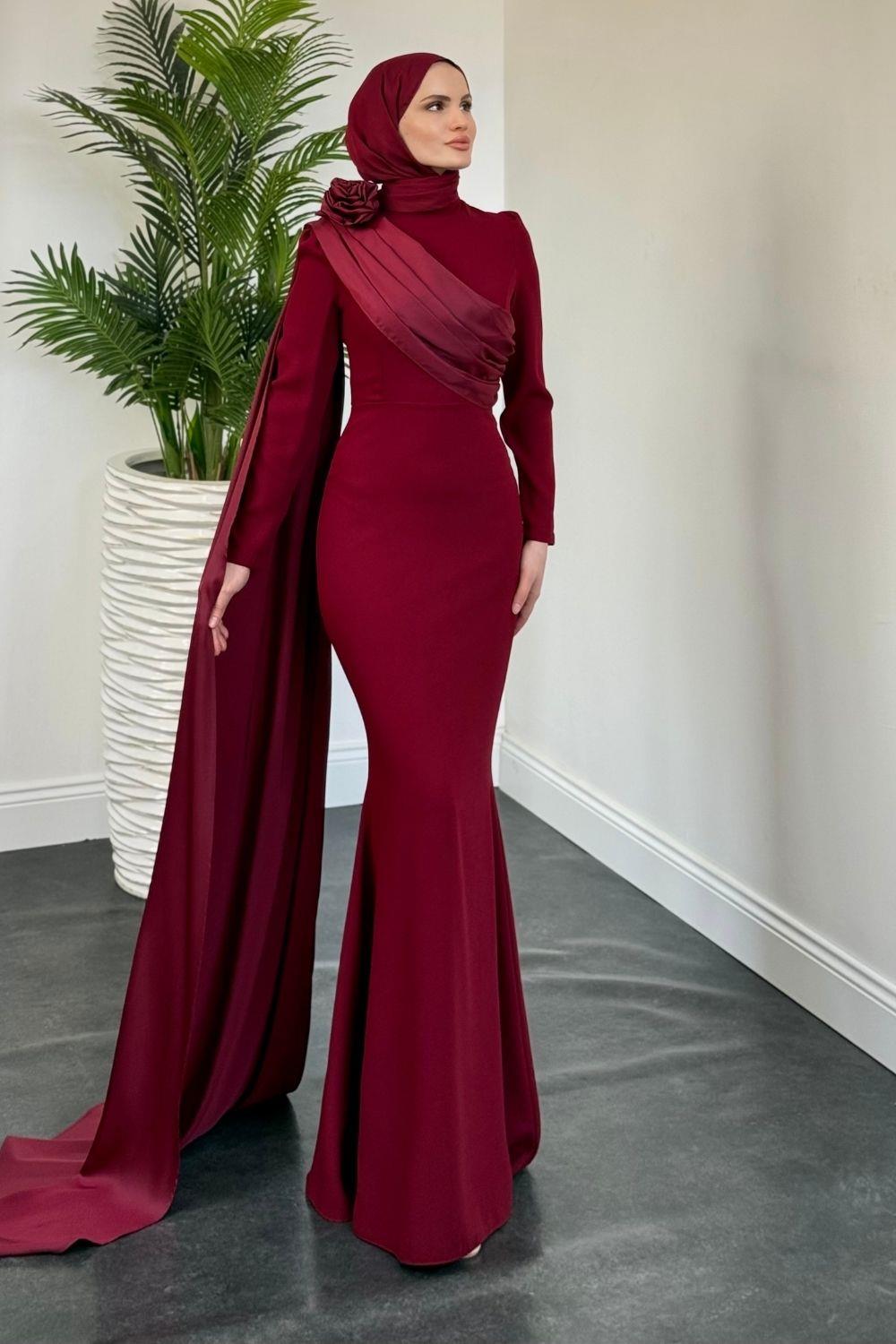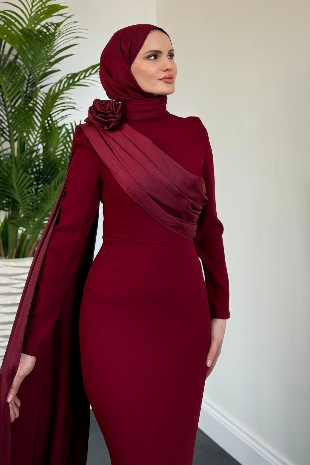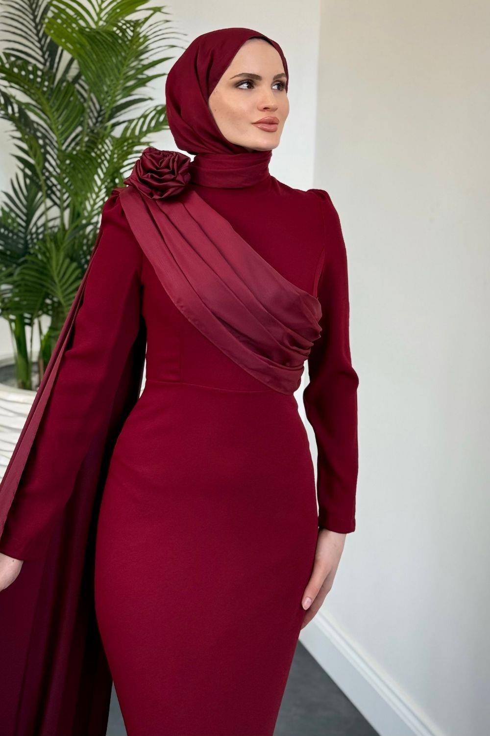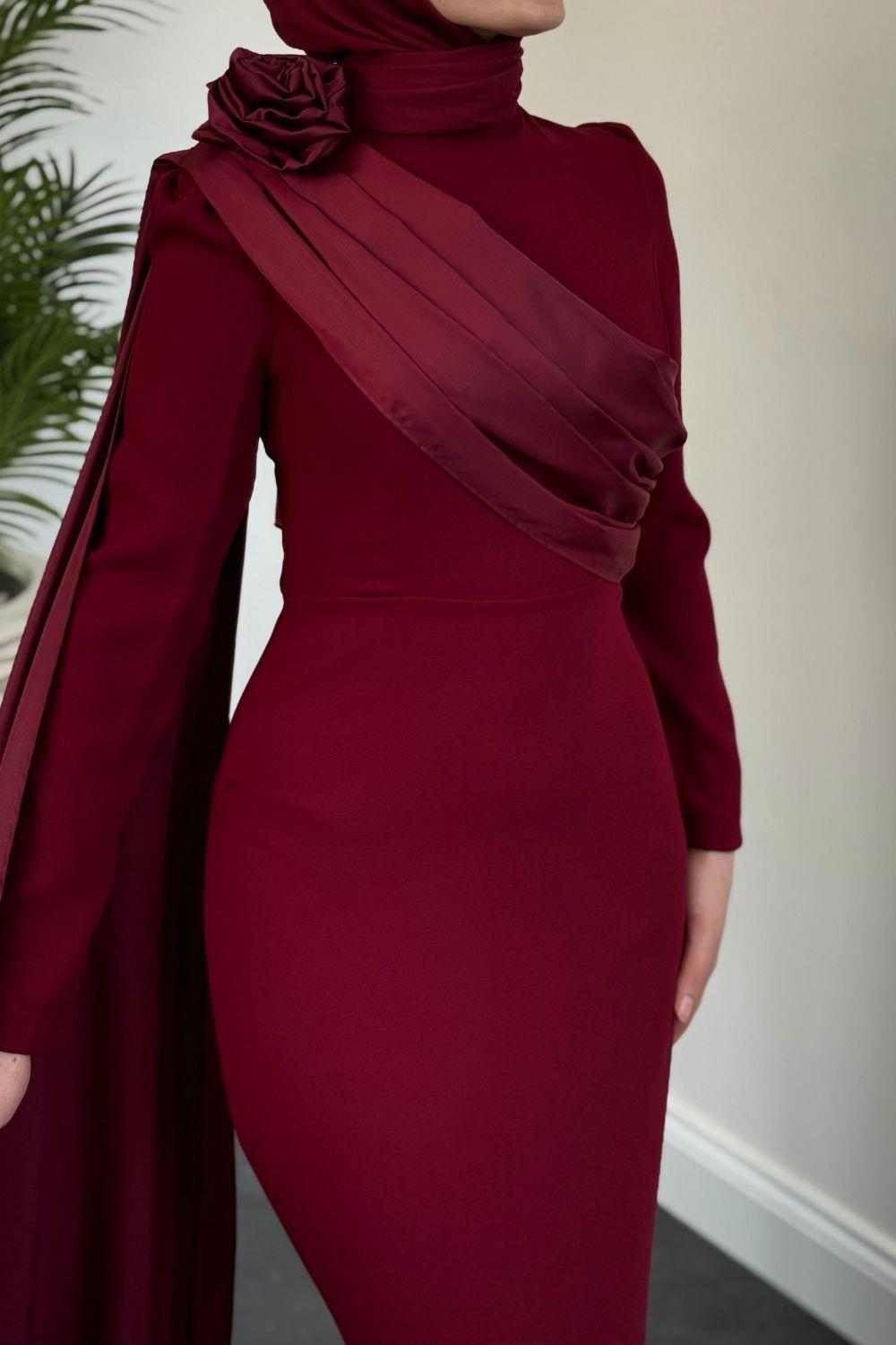 Castilya Pelerinli Omzu Gül Abiye Bordo