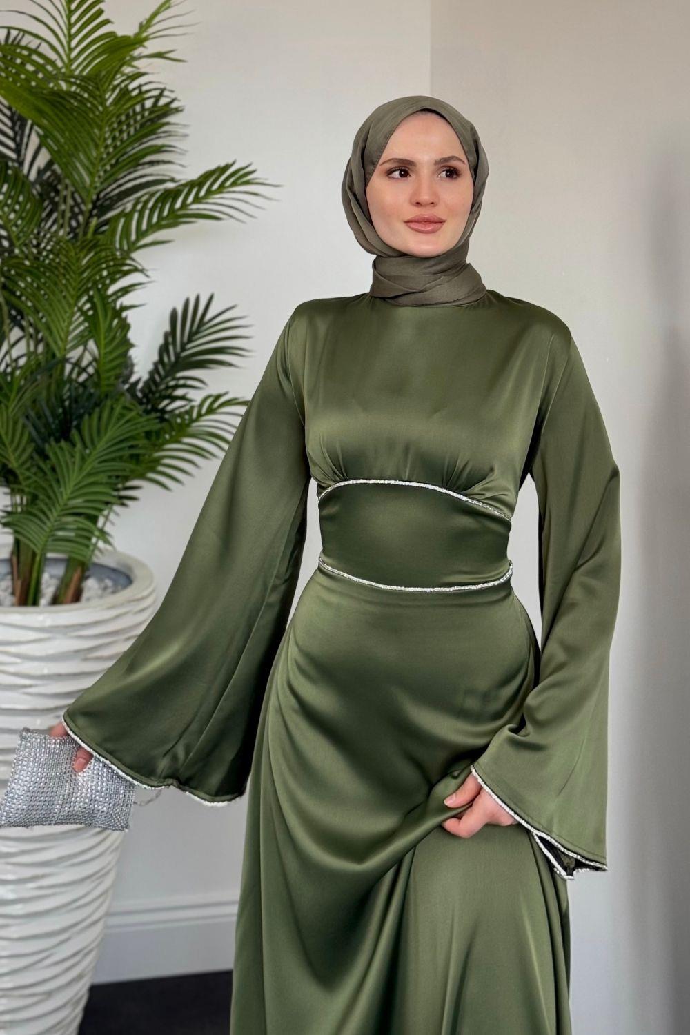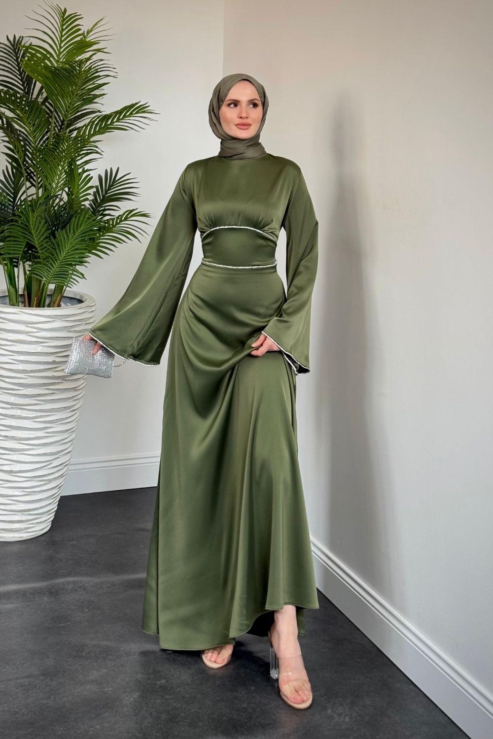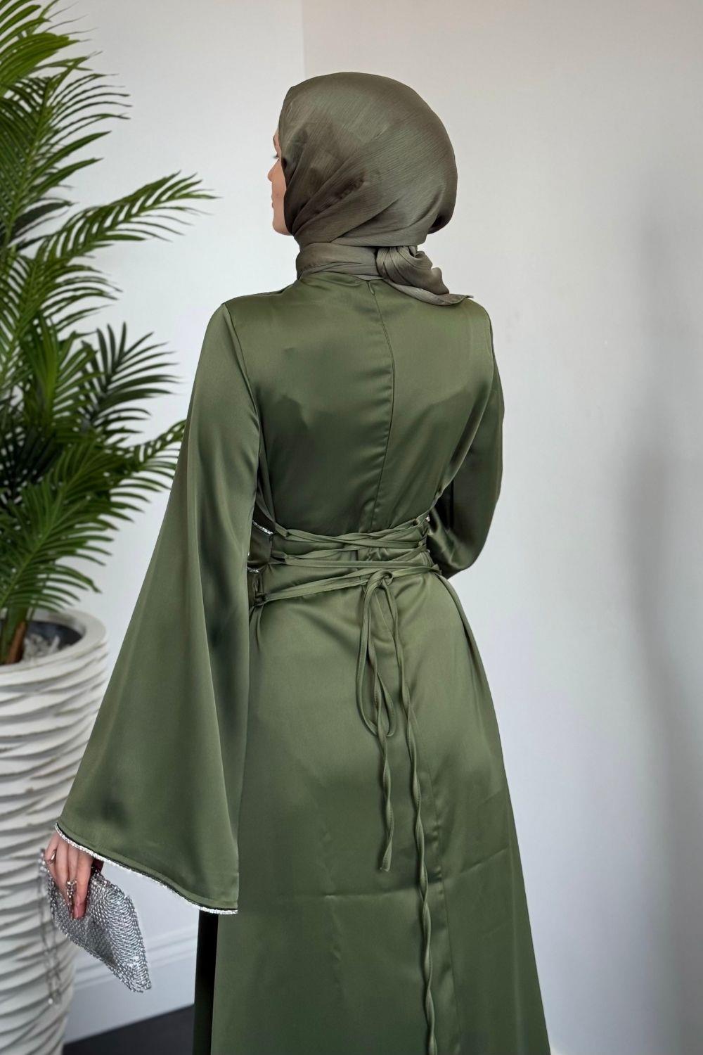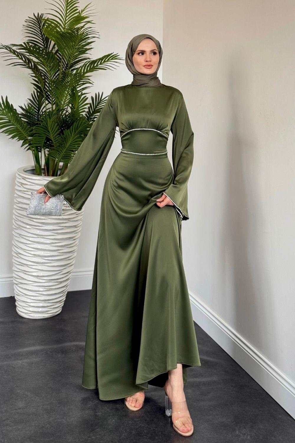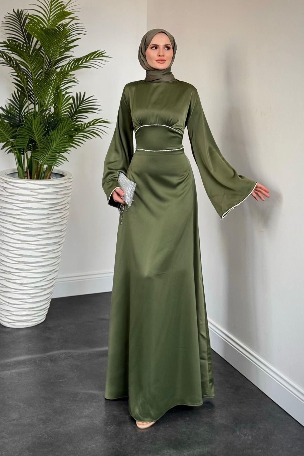 Vlasi Kolu Ve Beli Baget Taşlı Saten Abiye Haki