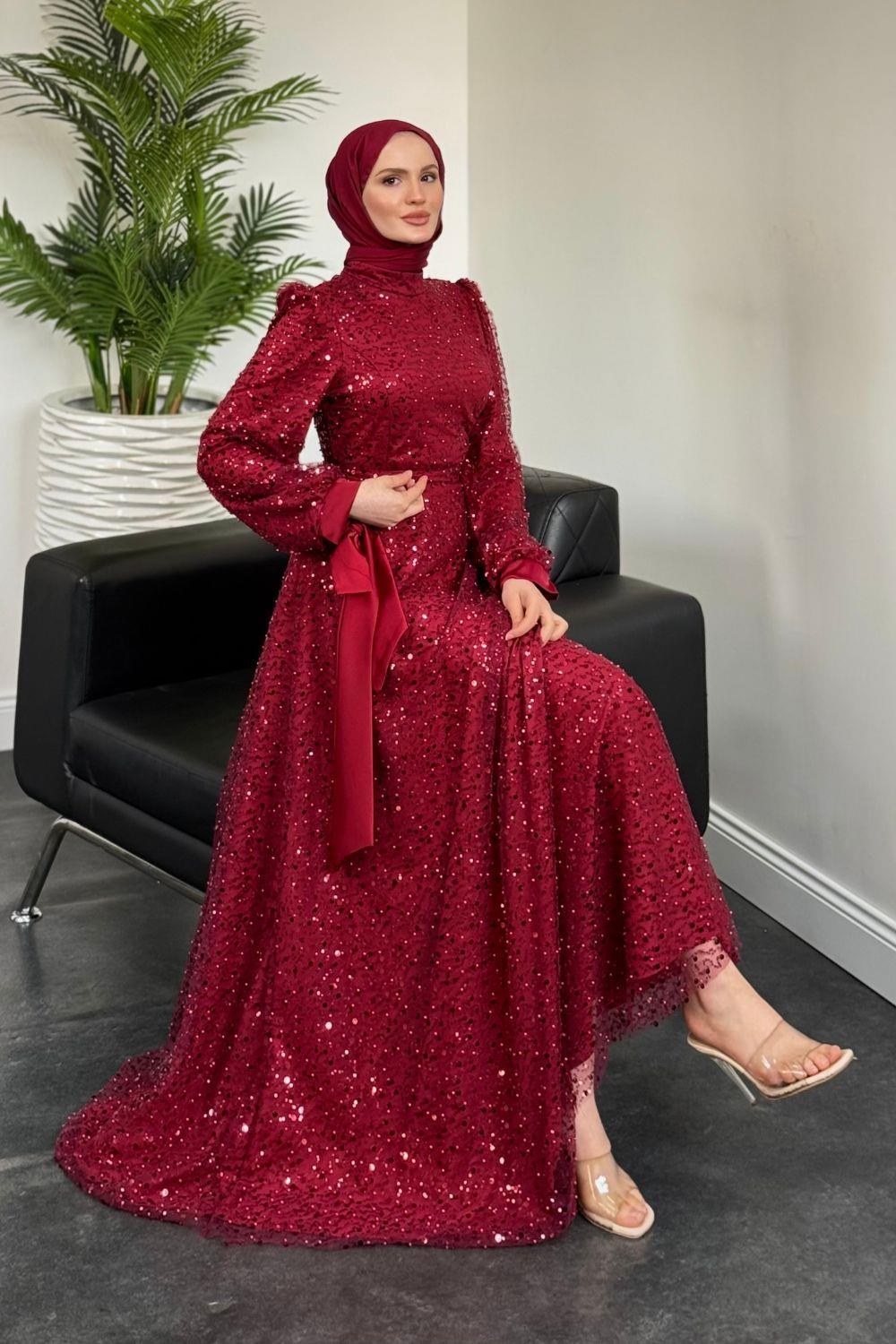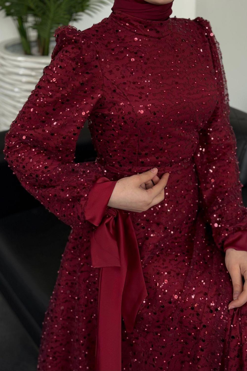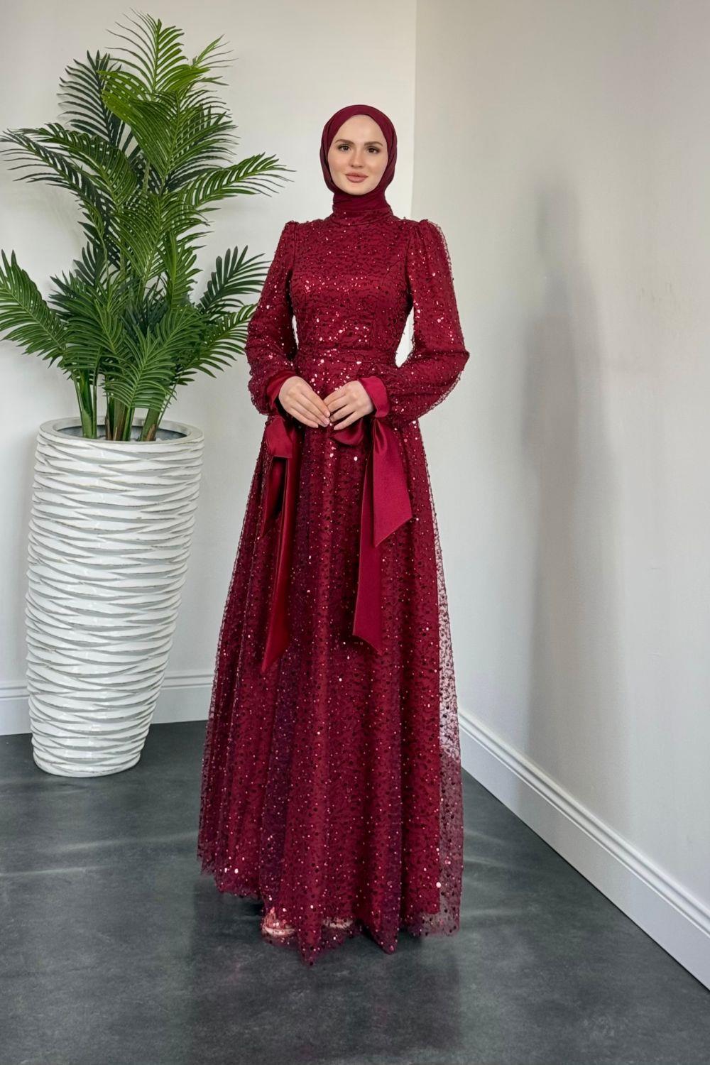 Hilly Kolları Fiyonk Saten Abiye Bordo