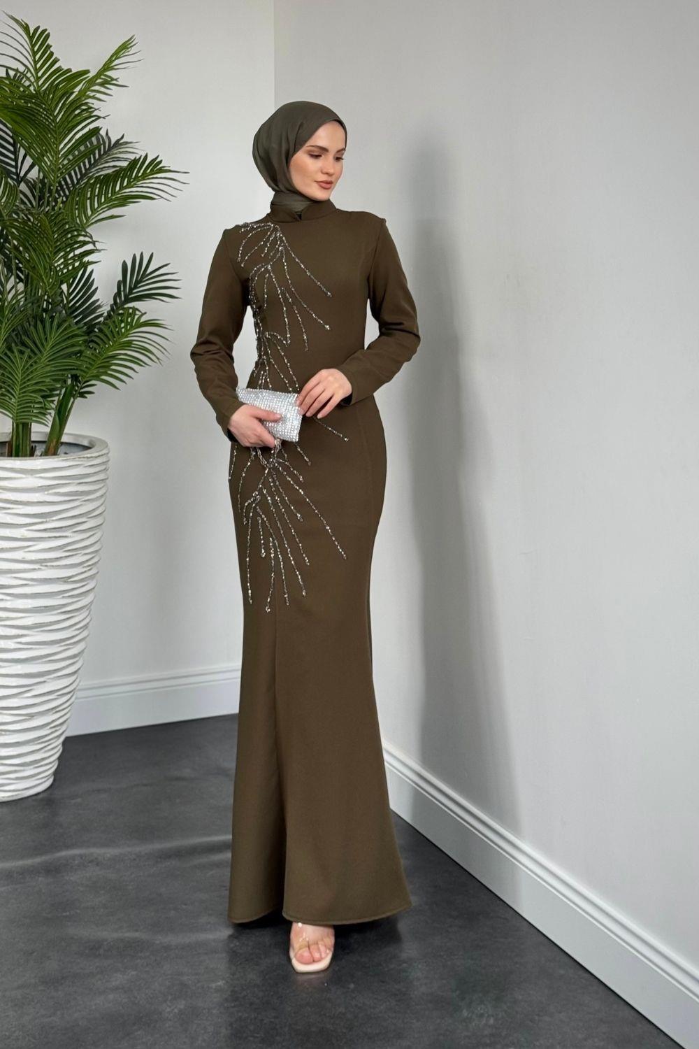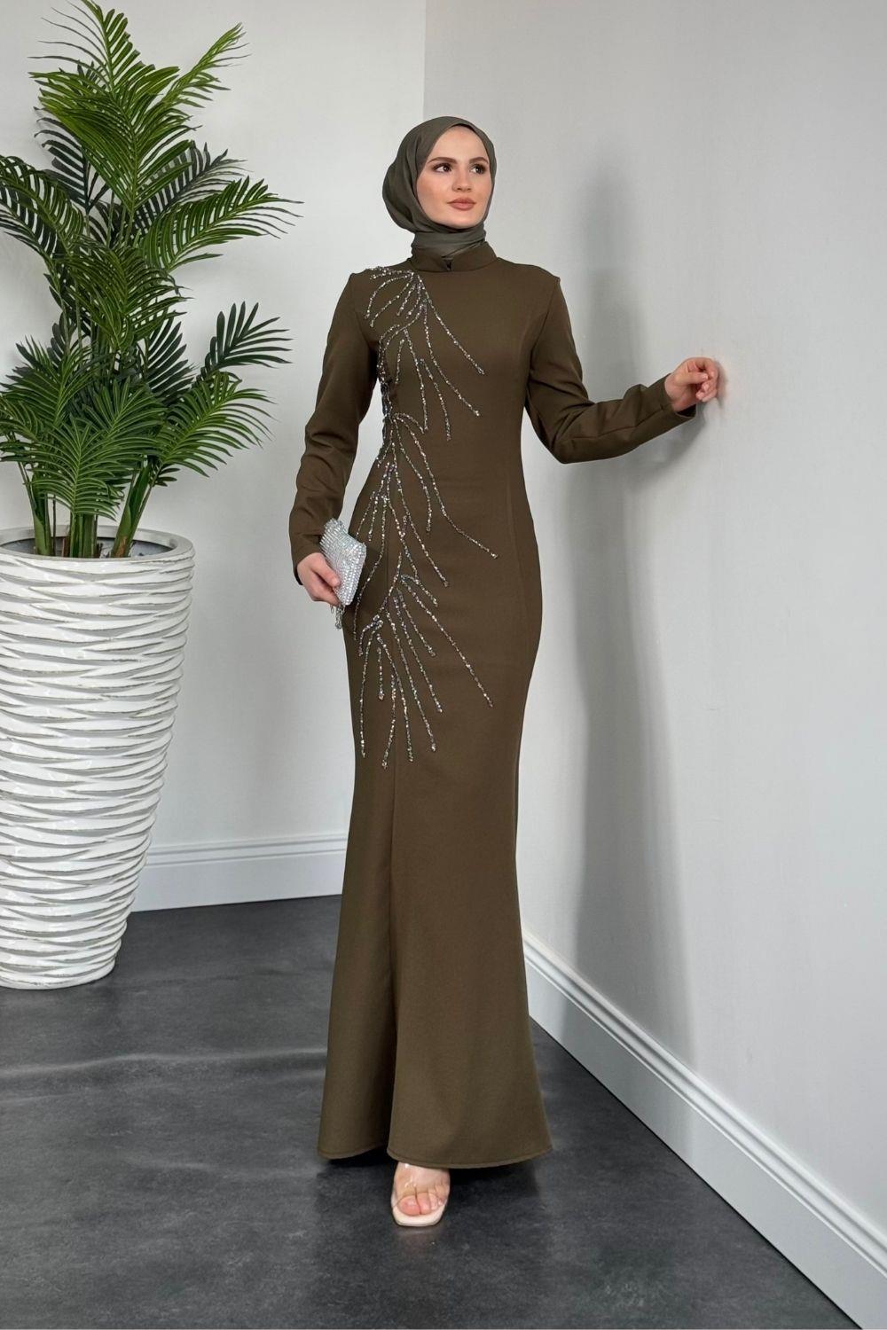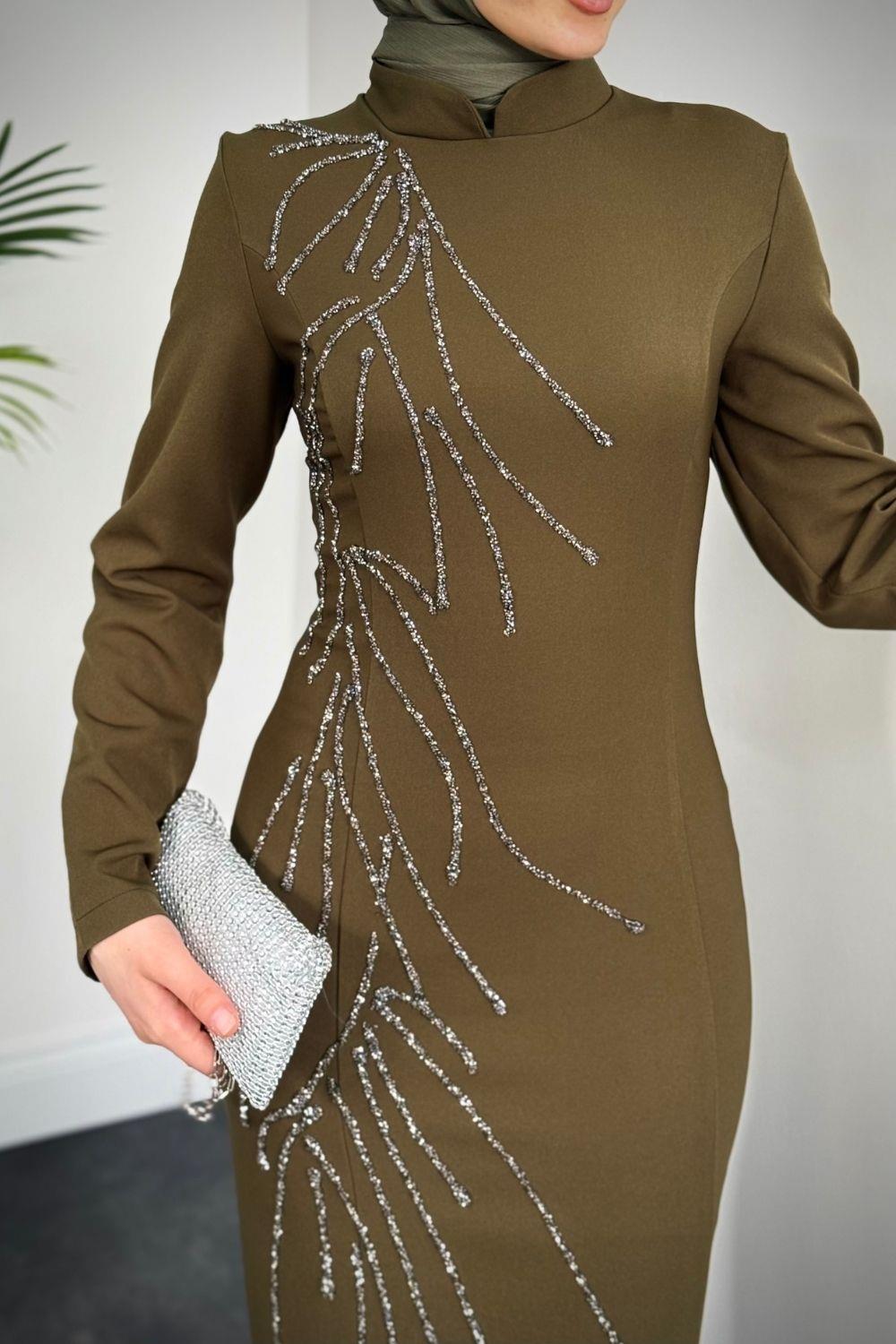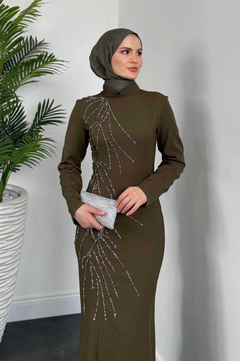 Frezya Yanı Taşlı Balık Abiye Haki