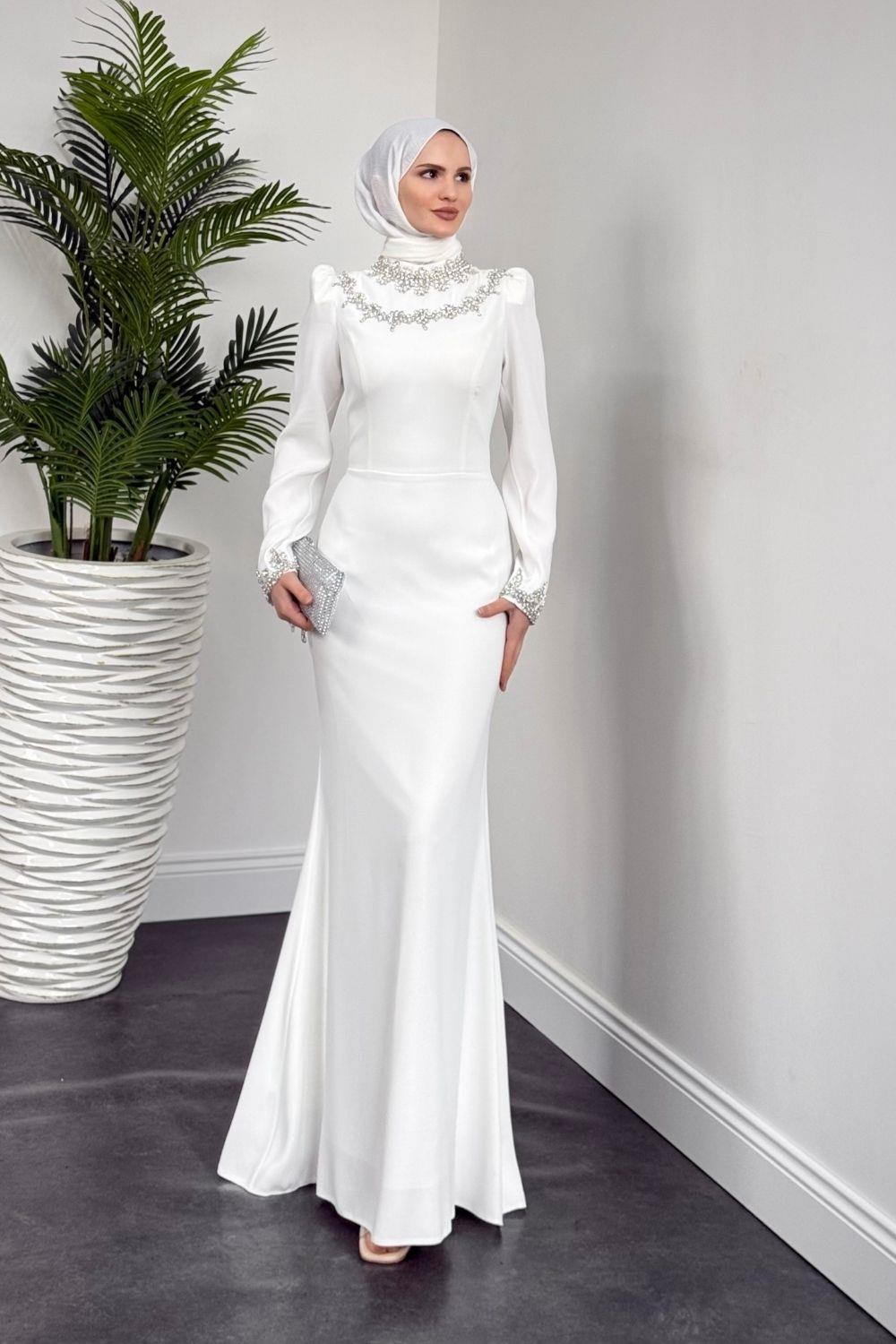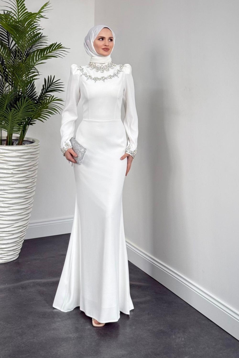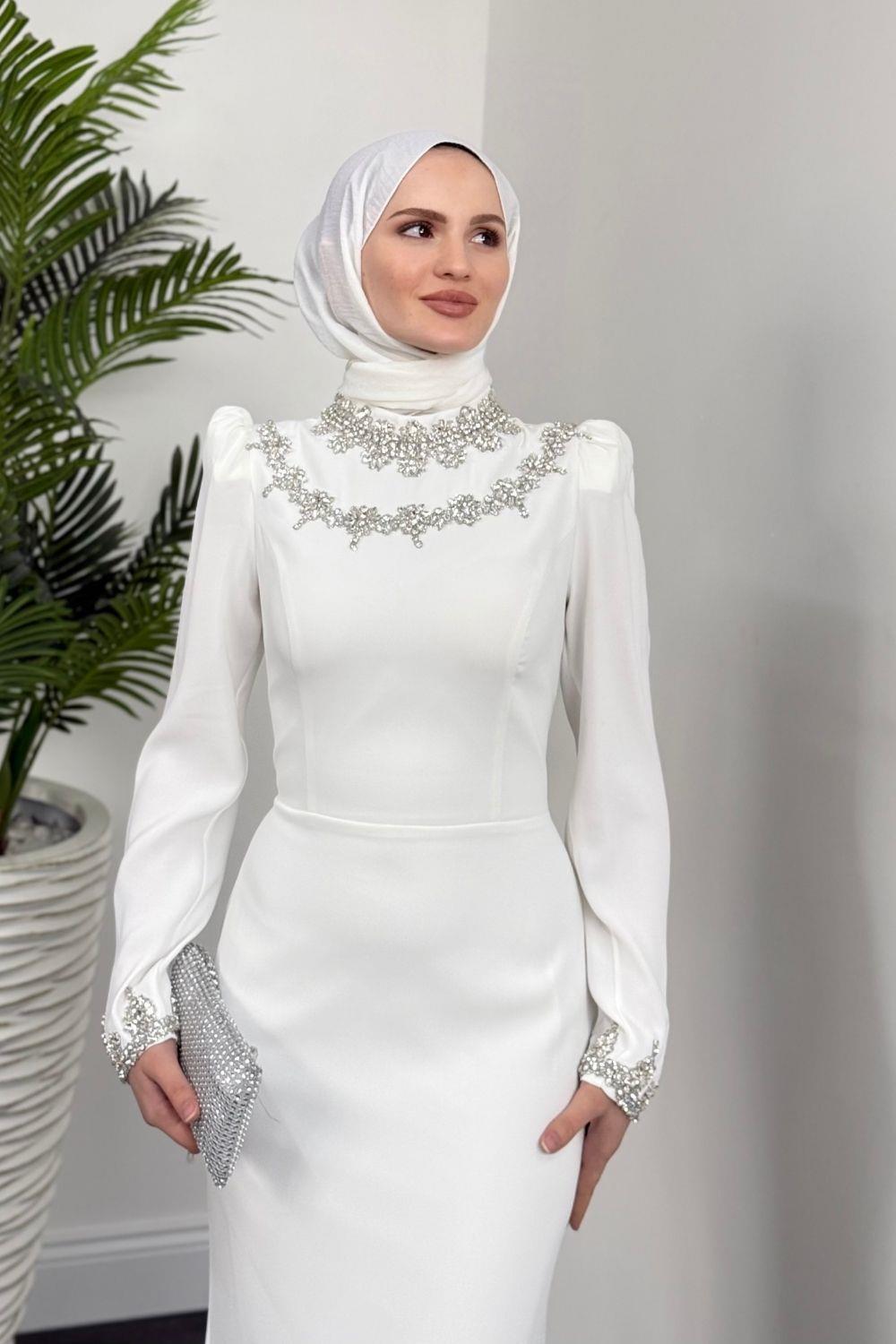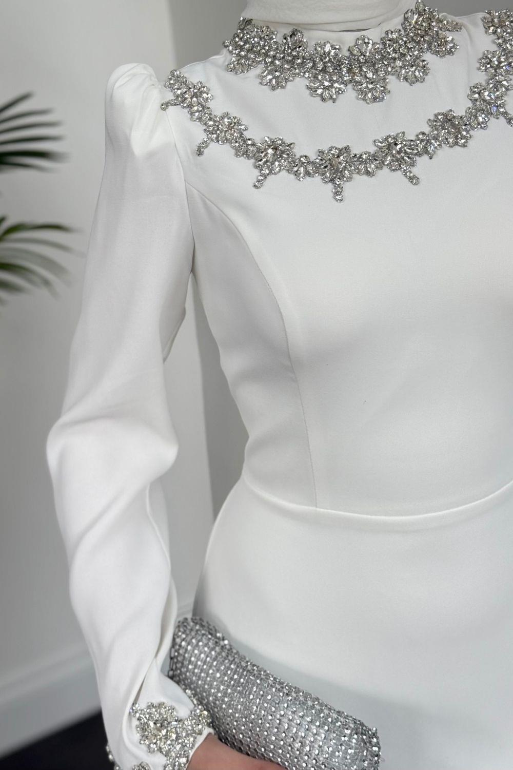 Bloom Kolu Ve Boynu Taşlı Abiye Beyaz