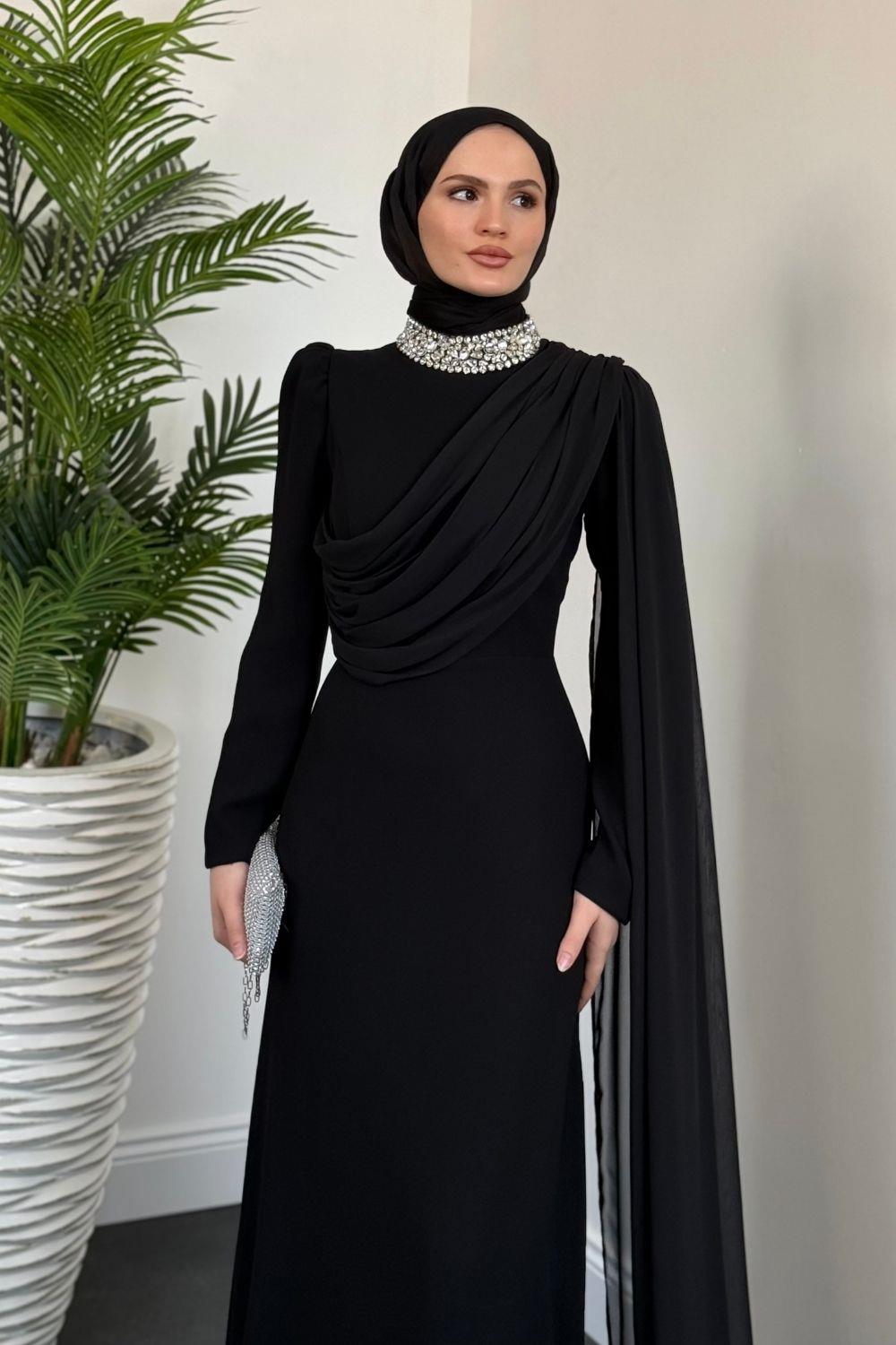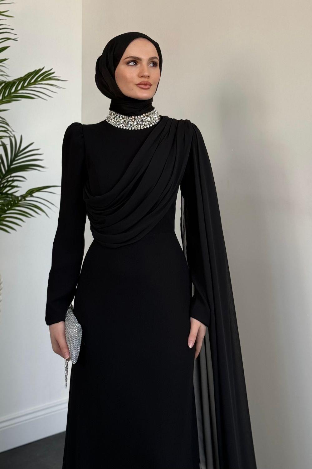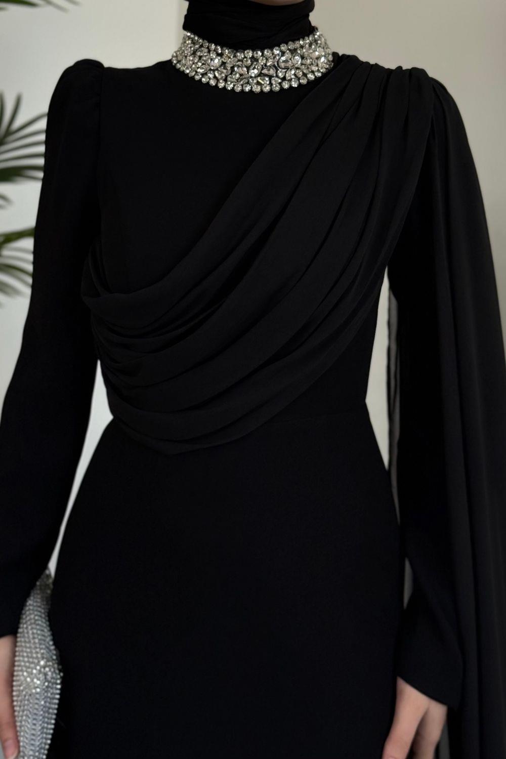 Olara Yandan Pelerinli Abiye Siyah