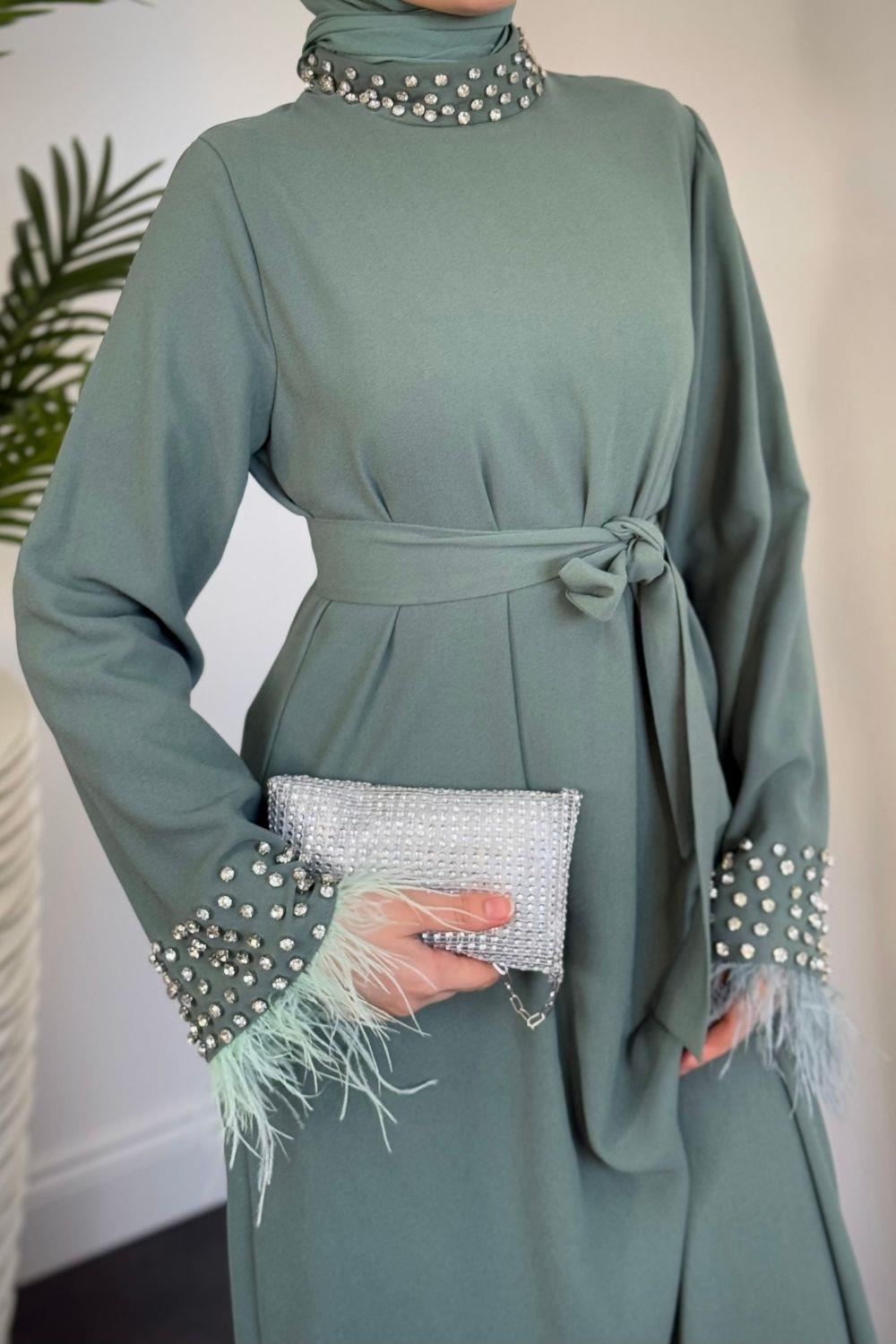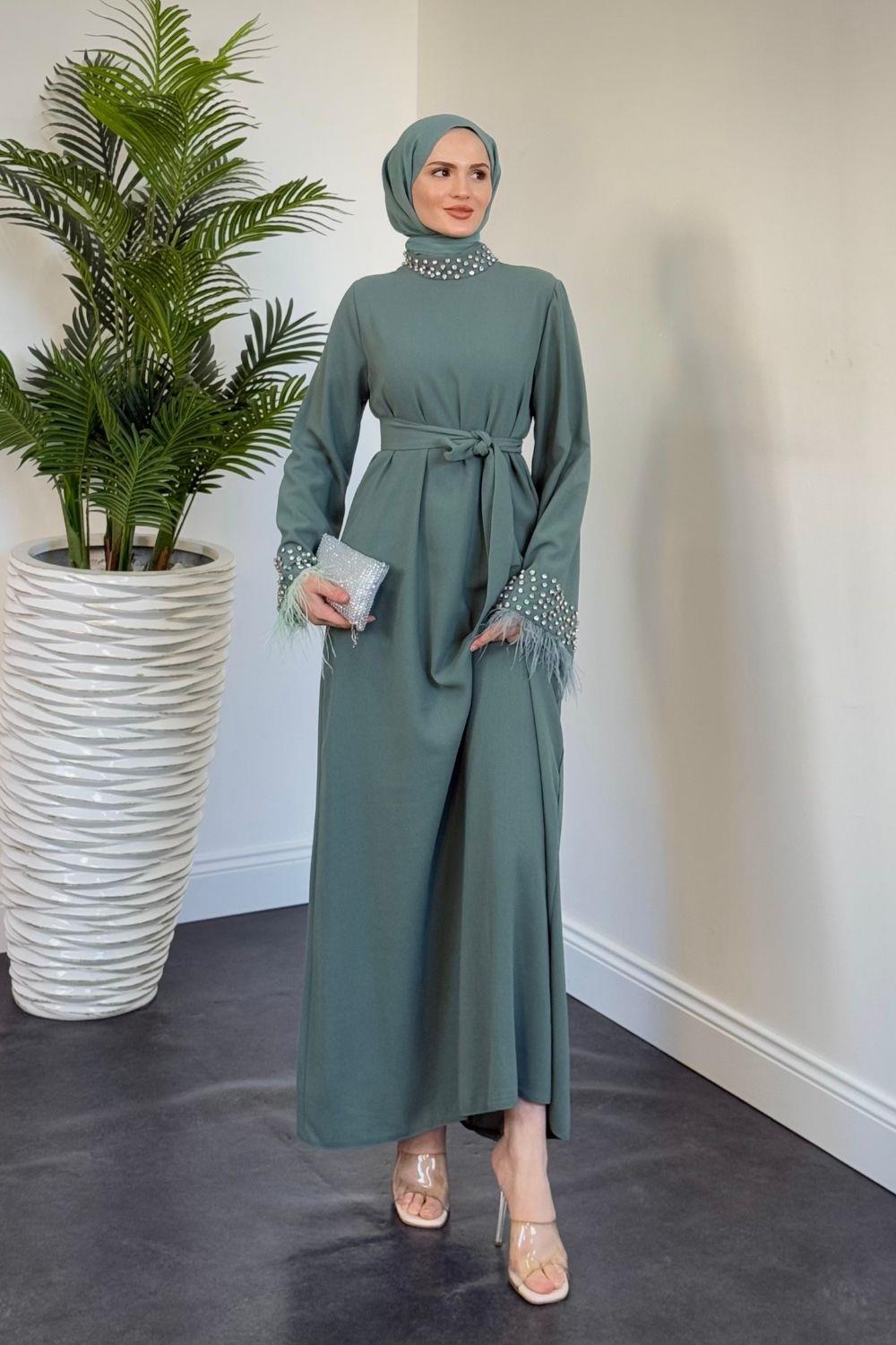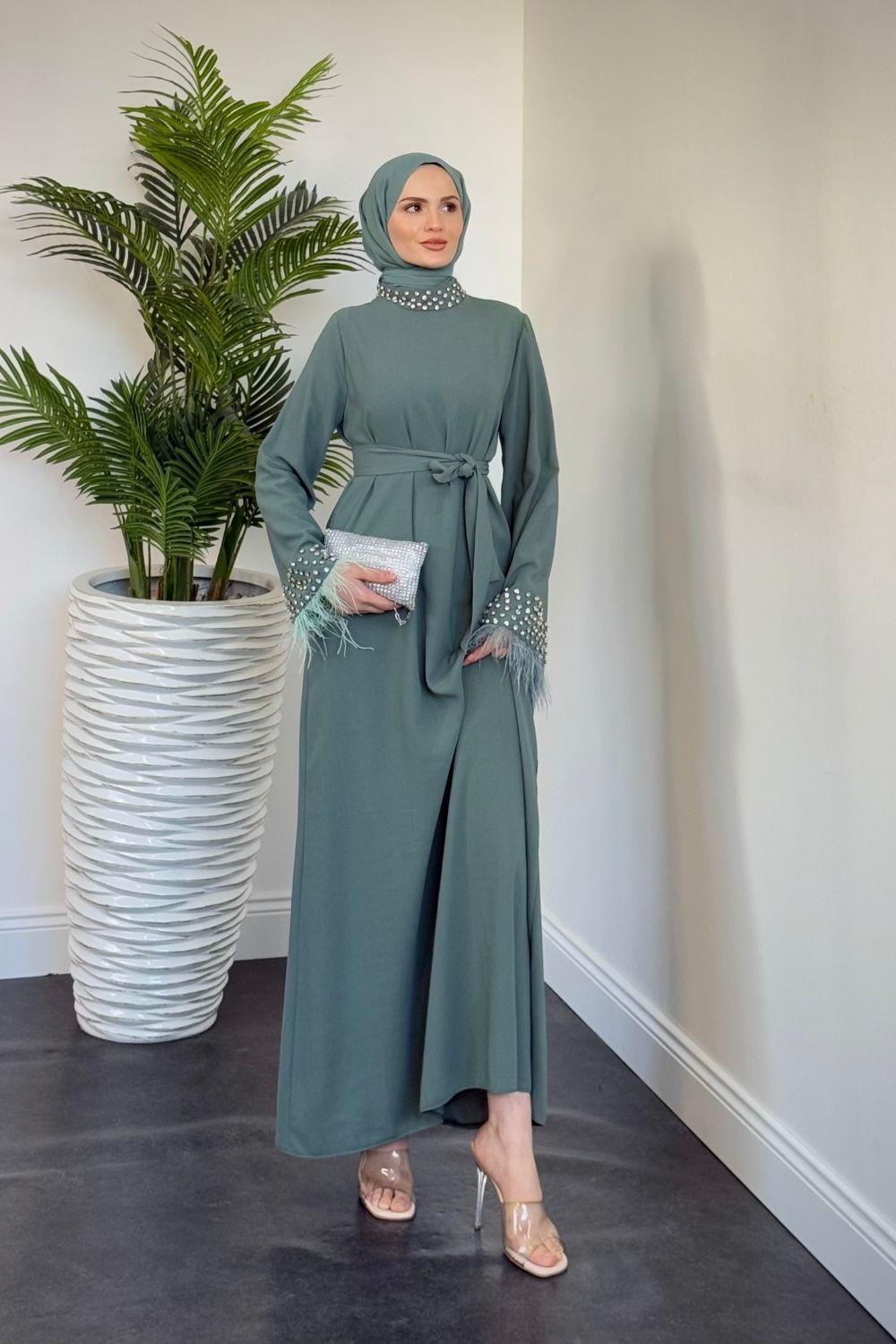 Mimoza Kolları Taşlı Krep Abiye Mint