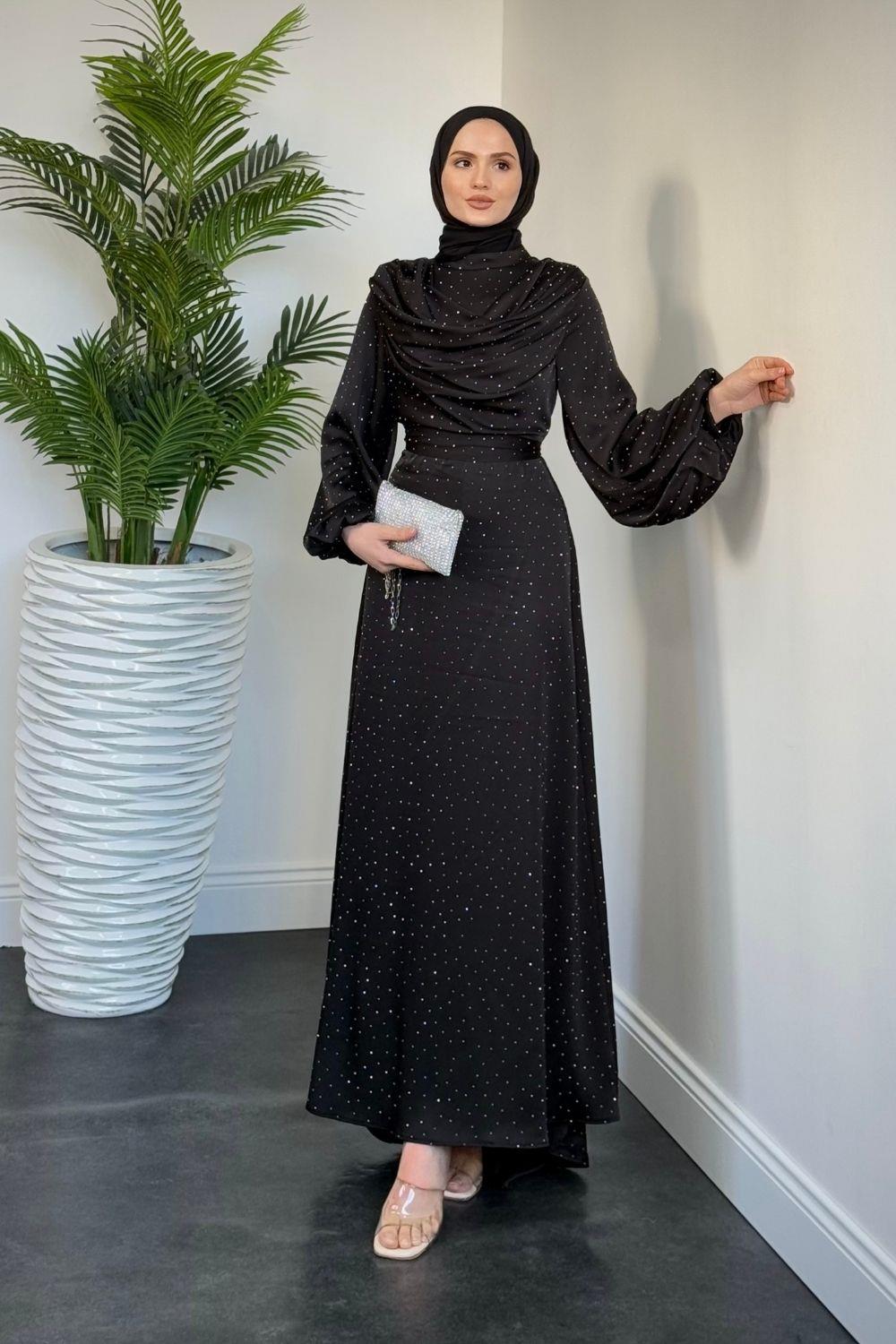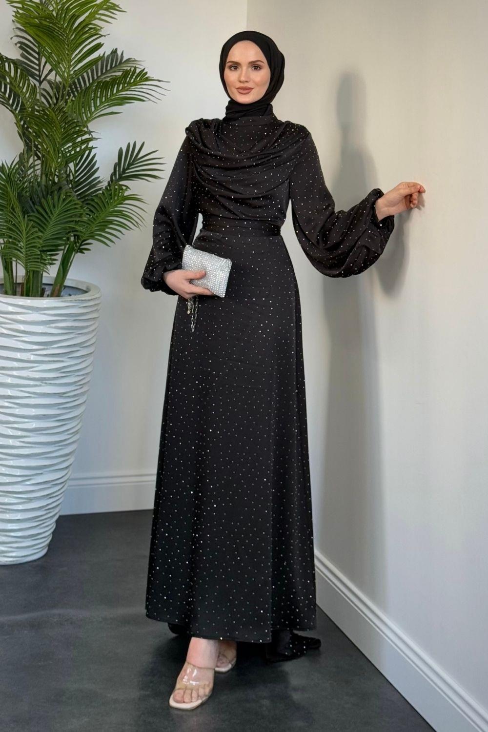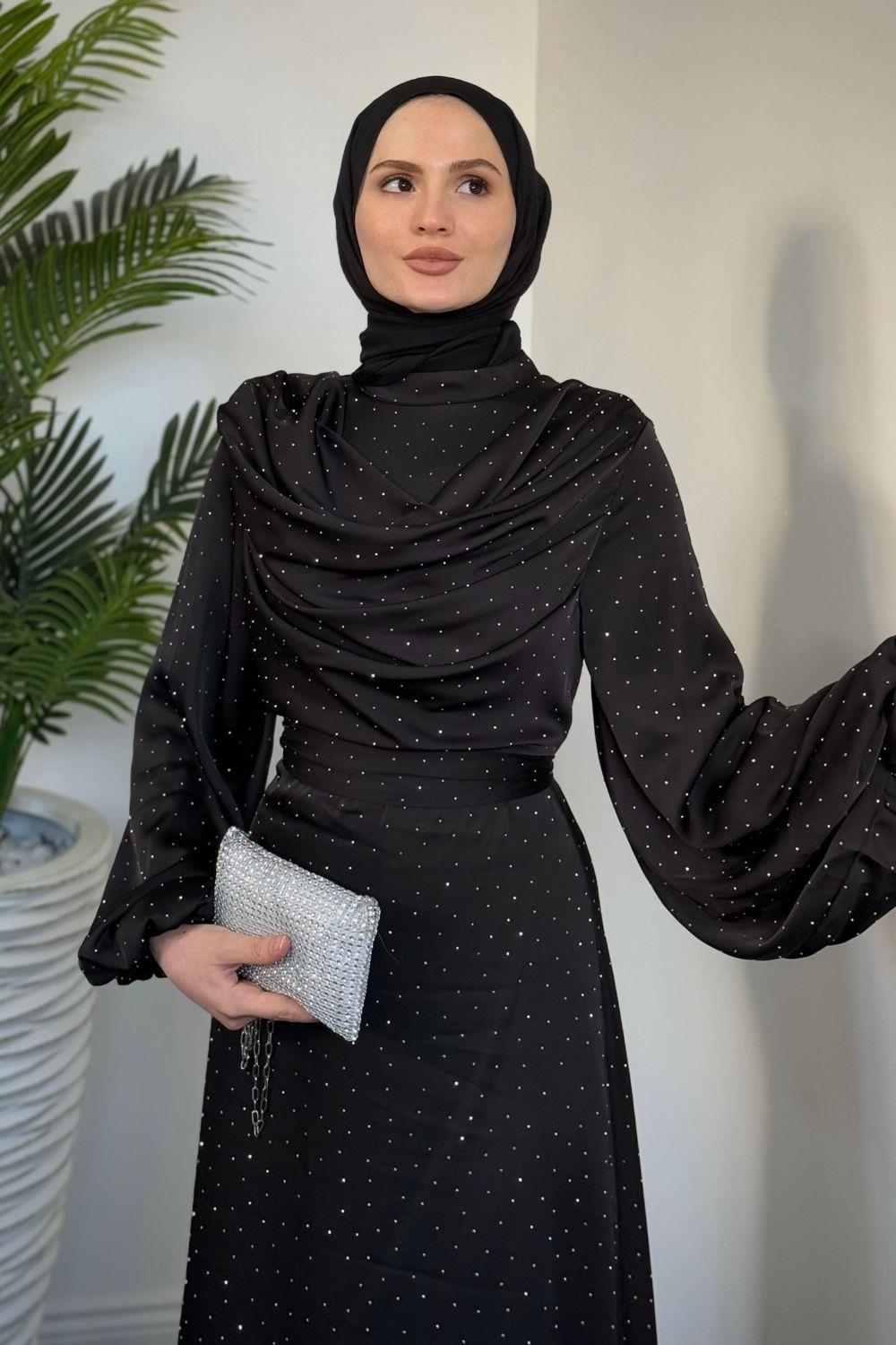 Areka Taşlı Kuyruklu Degaje Yaka Abiye Siyah