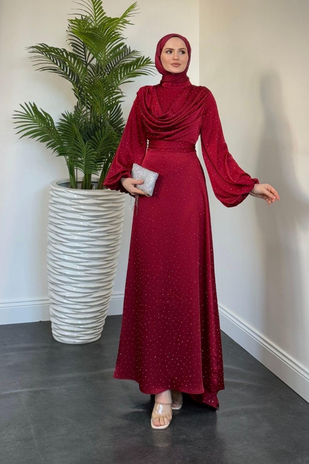 Areka Taşlı Kuyruklu Degaje Yaka Abiye Bordo