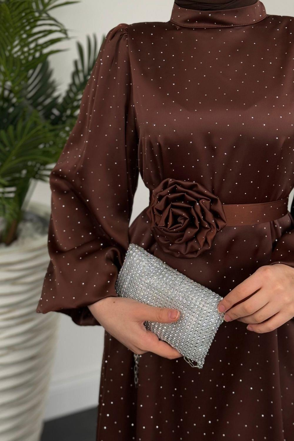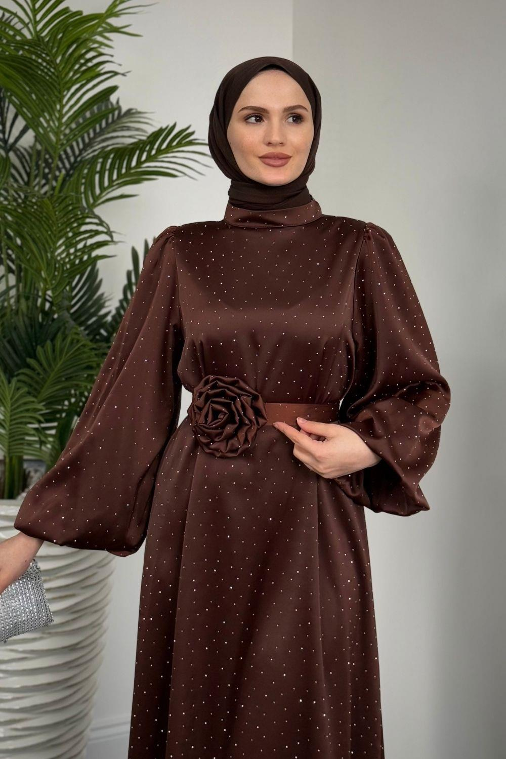 Margherita Taşlı Balon Kol Abiye Kahverengi